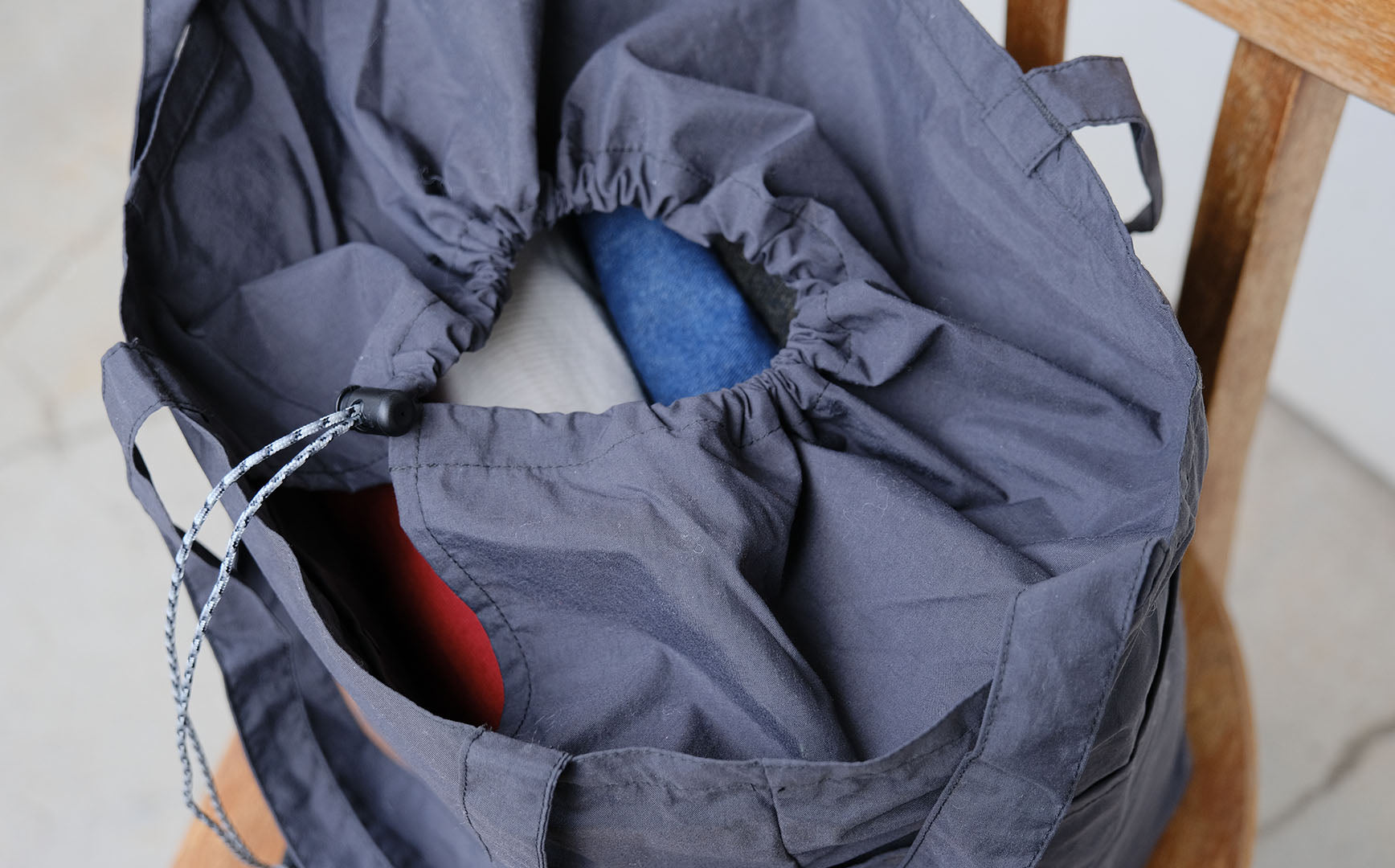 トートの上部は巾着仕様。中に入れたものをやんわりと隠してくれます。