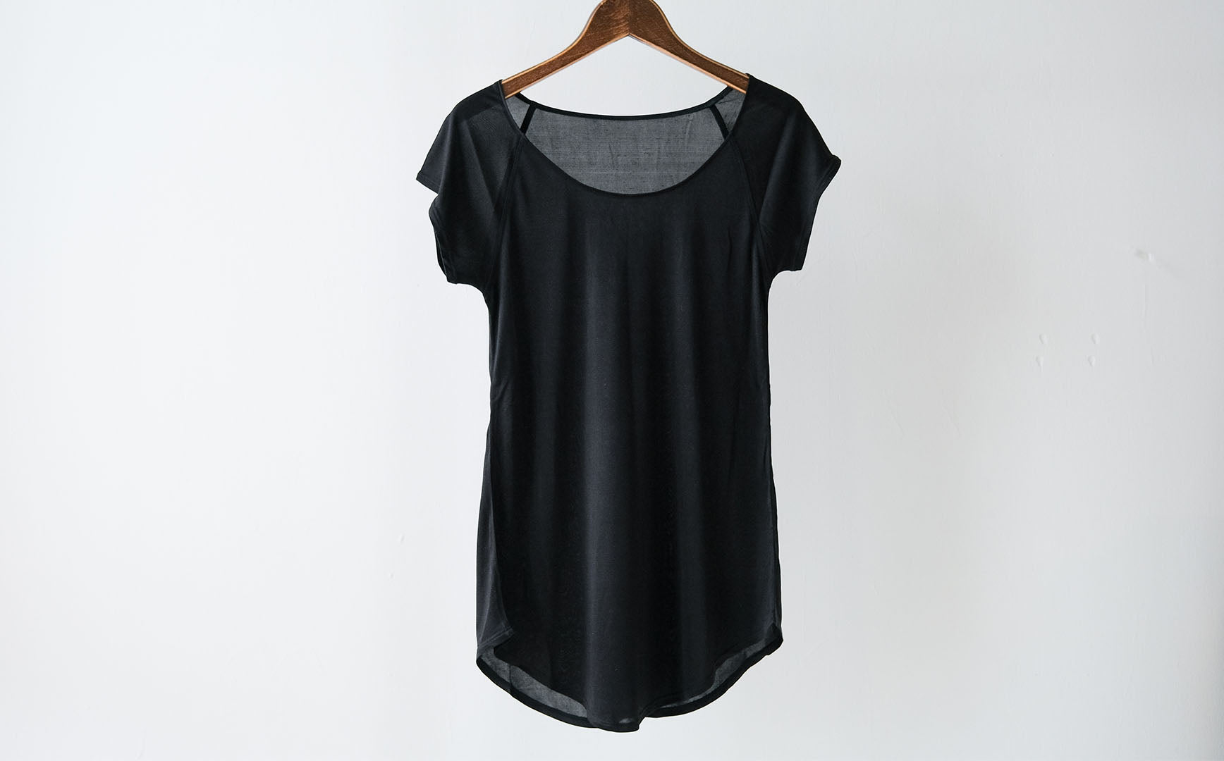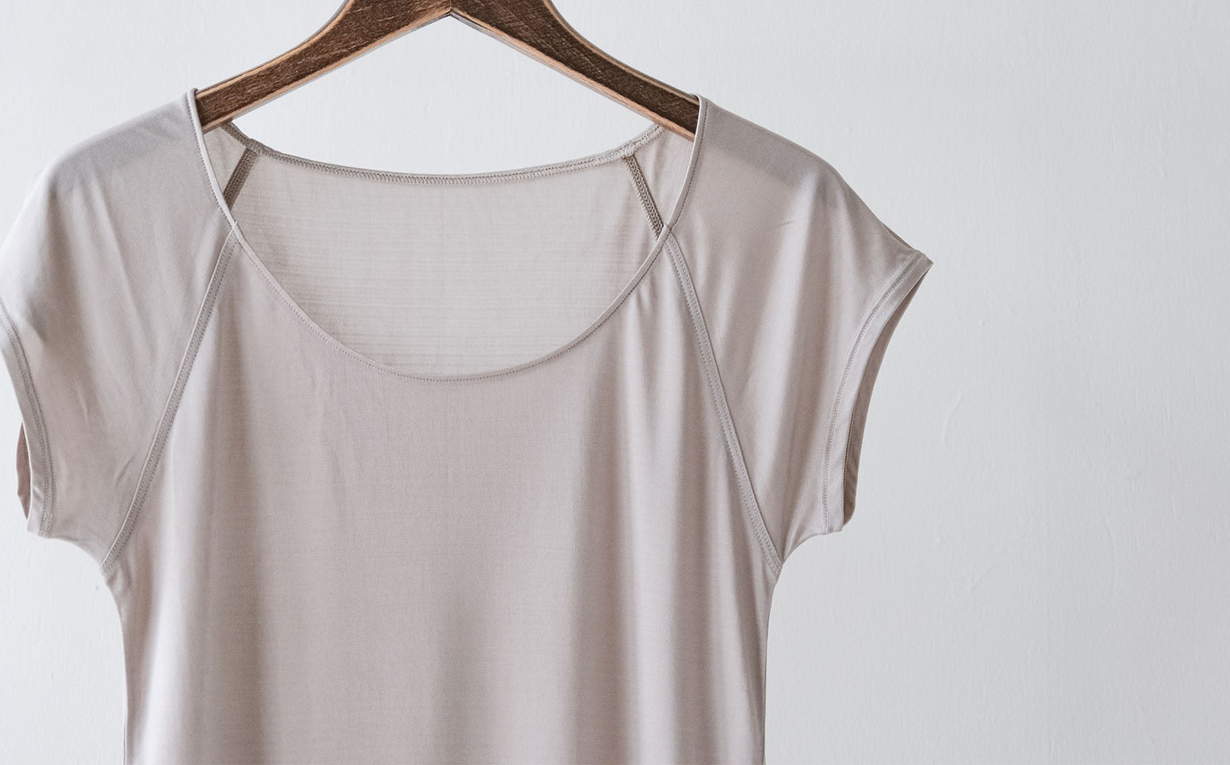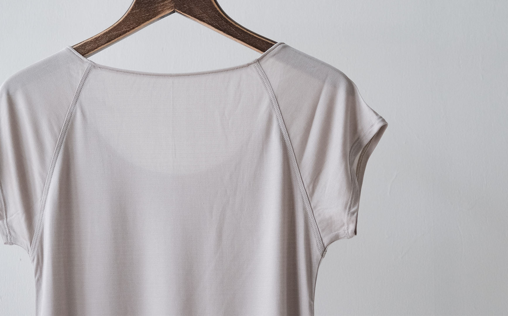 肩のシームが気にならないラグランスリーブ。小さなスリーブは脇回りの汗をよく吸収してくれ、汗染みが気になりません。