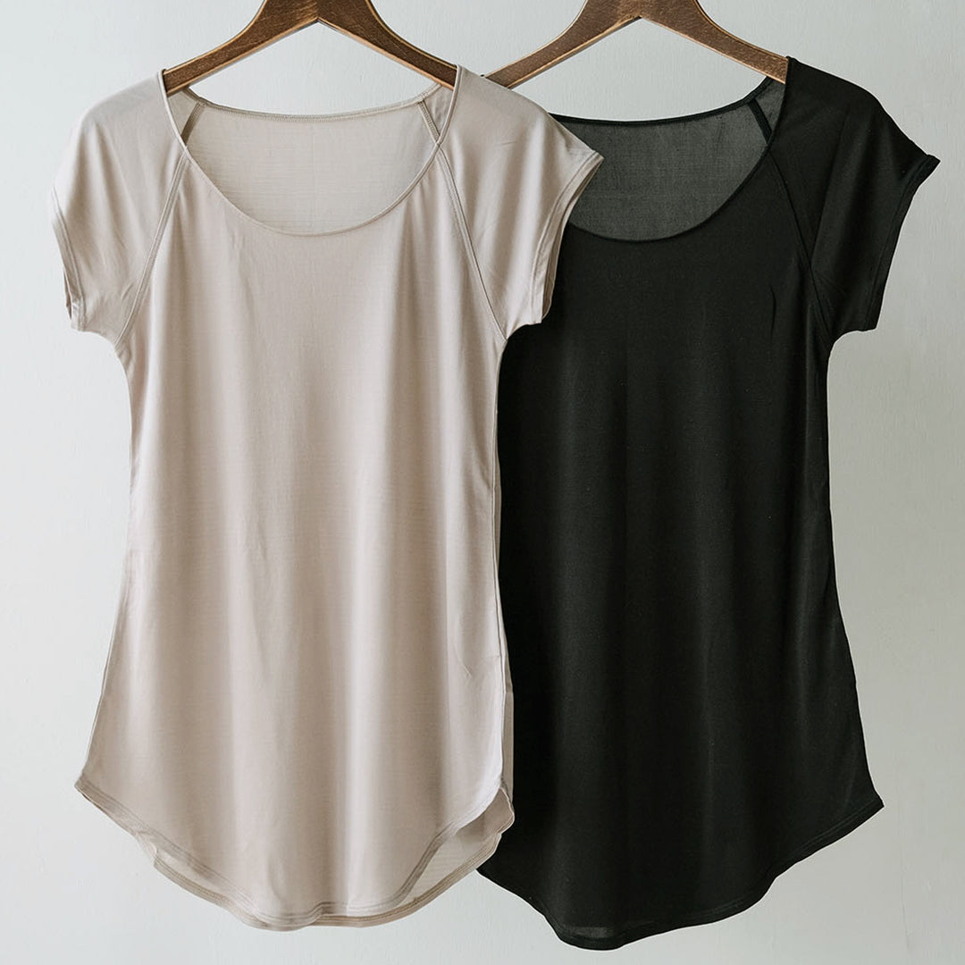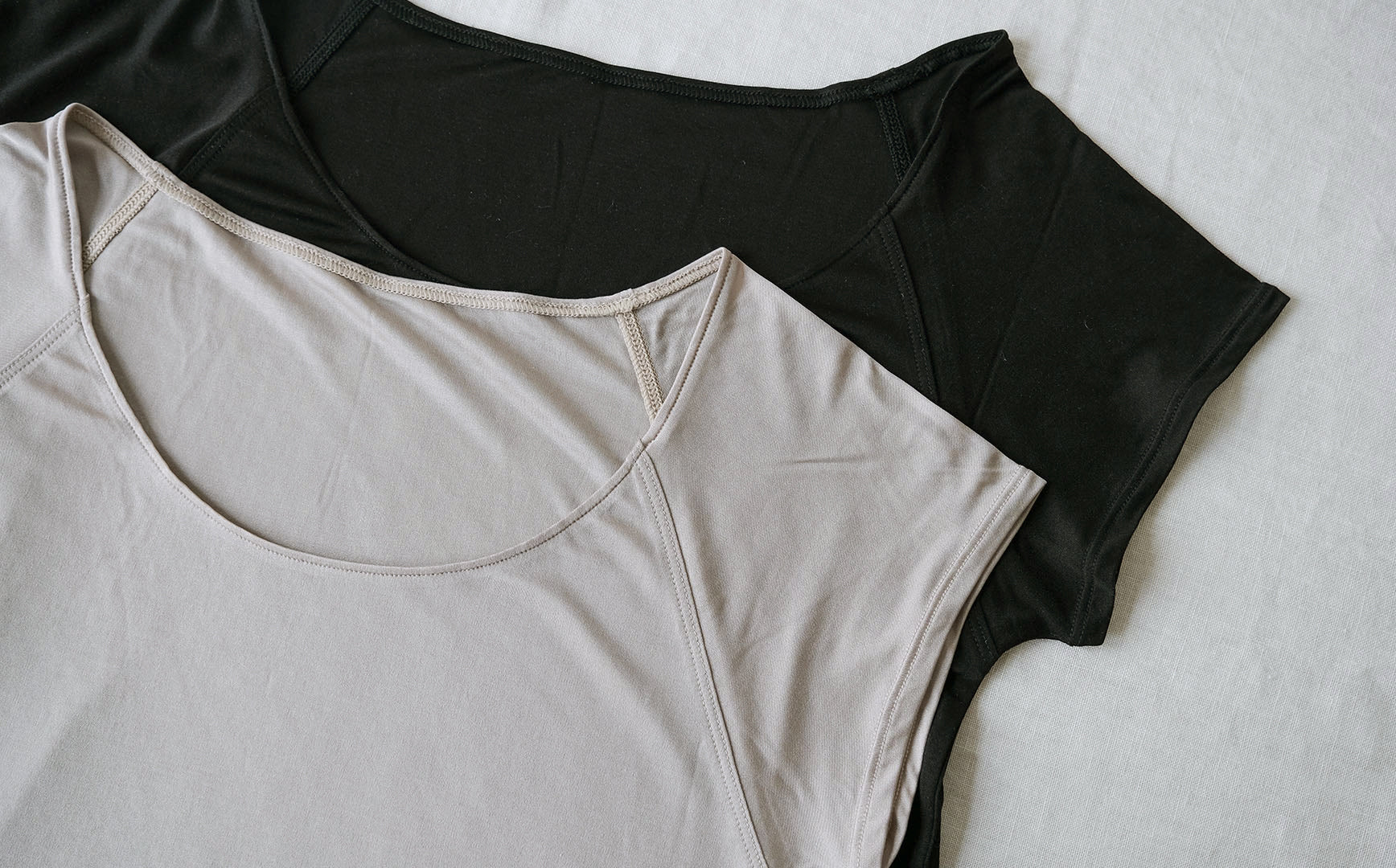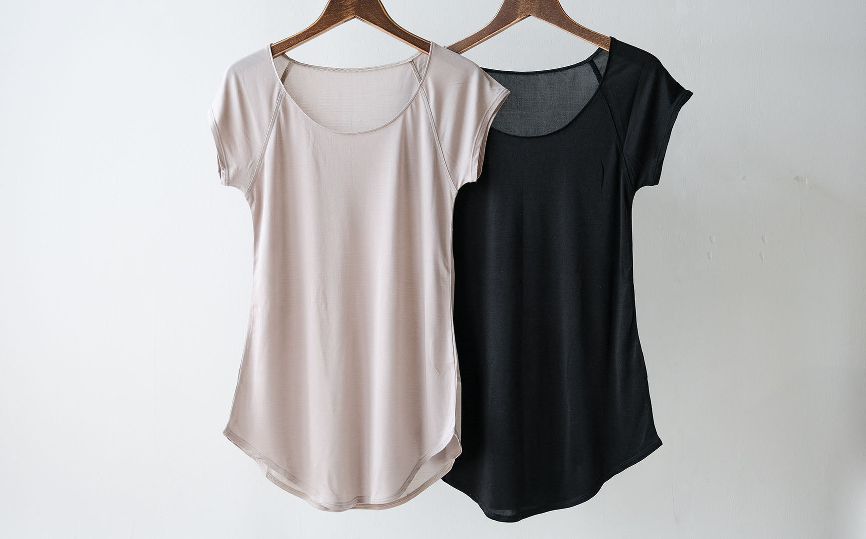 COCOONA SKINWEARのアンダーウェアは、日本人に肌なじみのよい色展開が特徴。フレンチスリーブトップはトープとブラックの2色展開です。