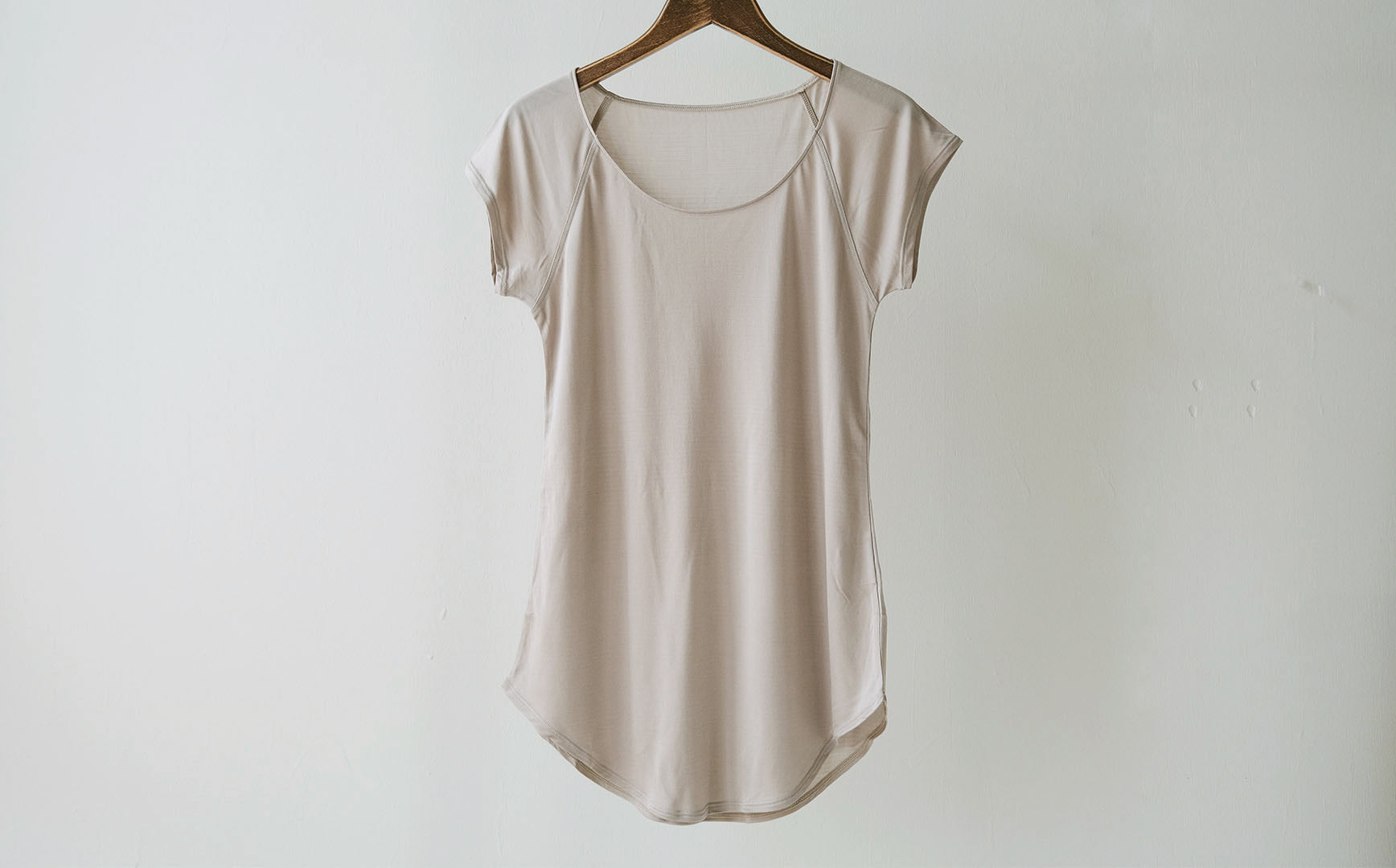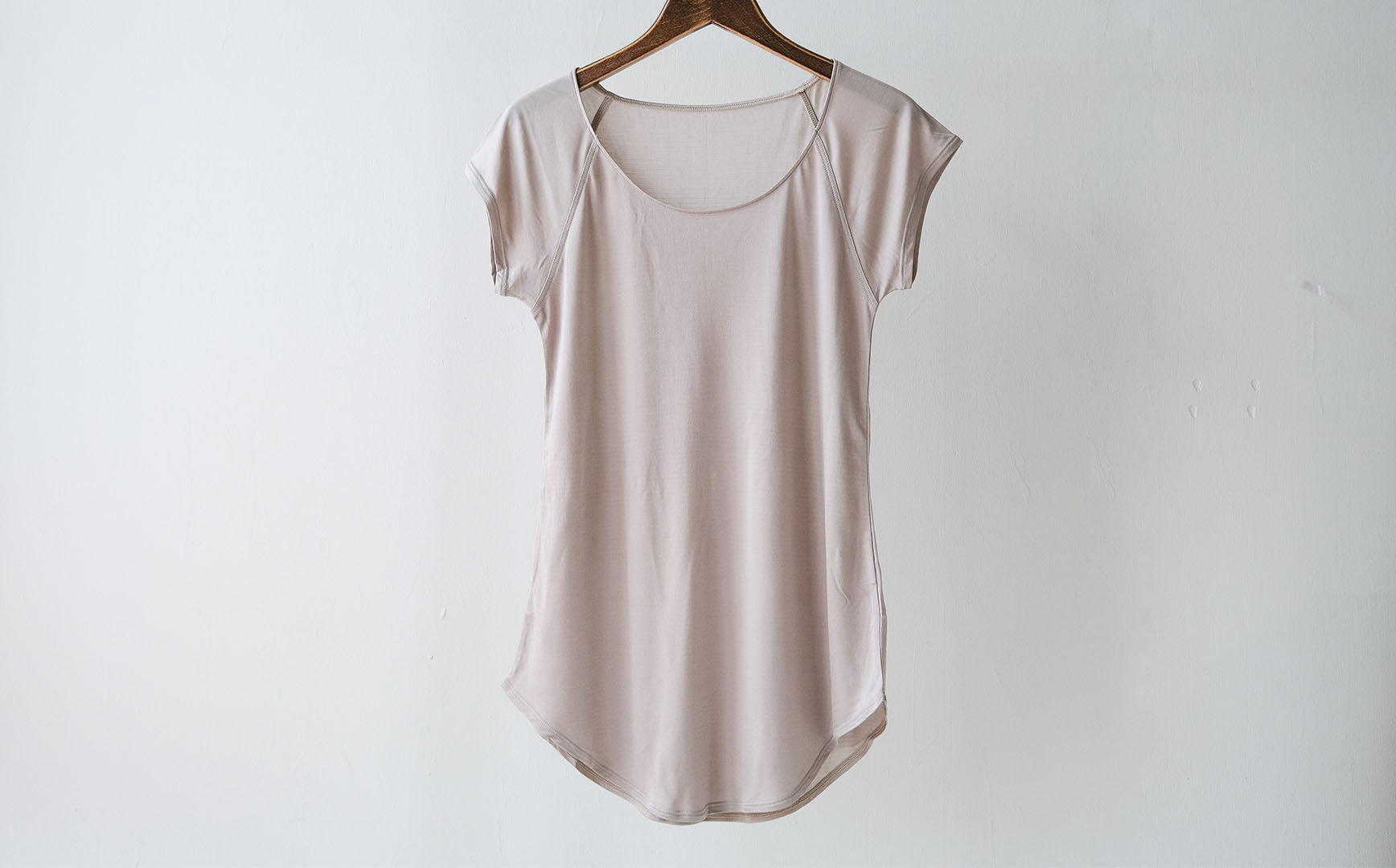 COCOONA SKINWEARの新しいアイテム「フレンチスリーブトップ」。極薄で清涼感がある着心地のハイゲージスムース編みです。