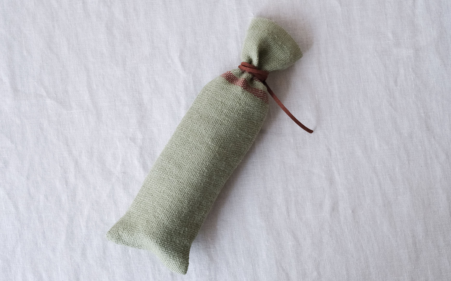 私たちの原点でもあるリネン。革ひもをぐるぐるっと巻くと、ボトルをやんわりと包んで巾着のような形状になります。