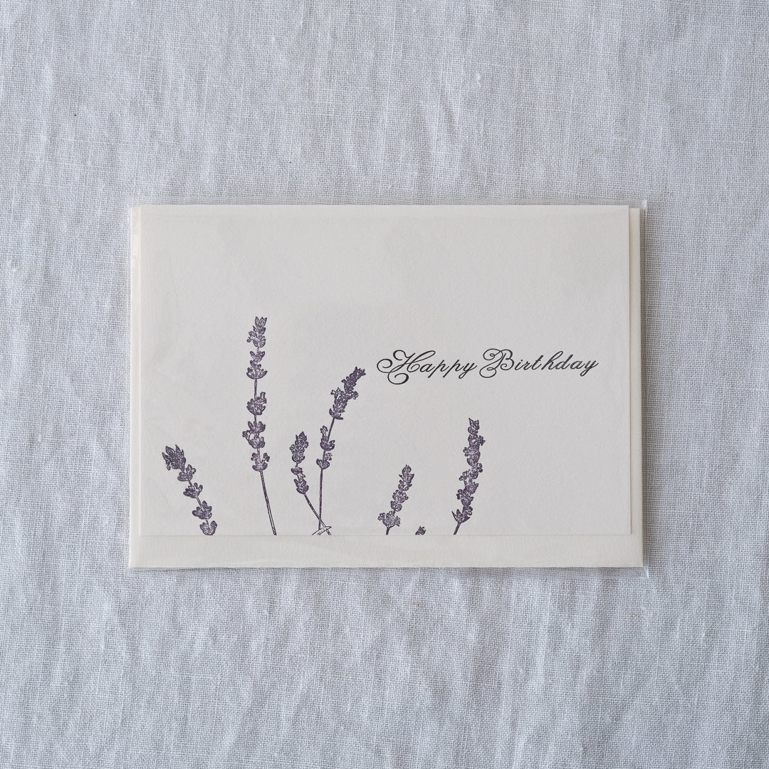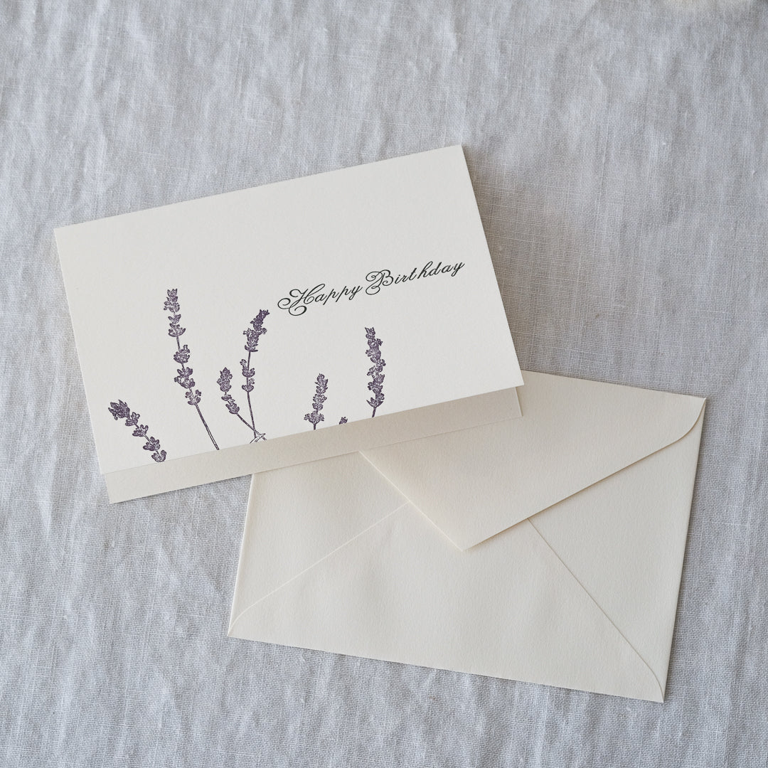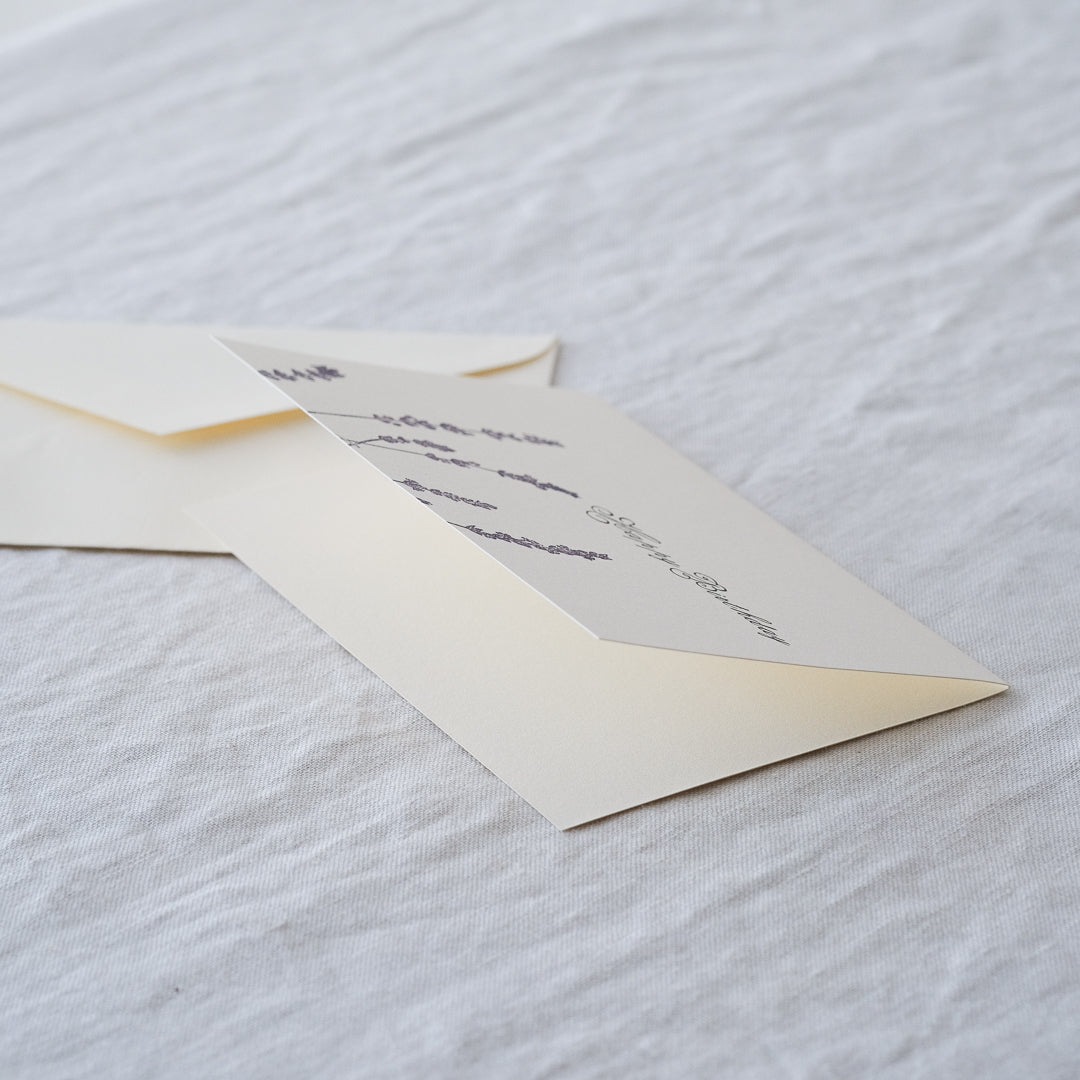 ラベンダーをモチーフにした、上品なコットンペーパーを使ったバースデーカードです。大切な方へのバースデープレゼントに添えてはいかがでしょうか。