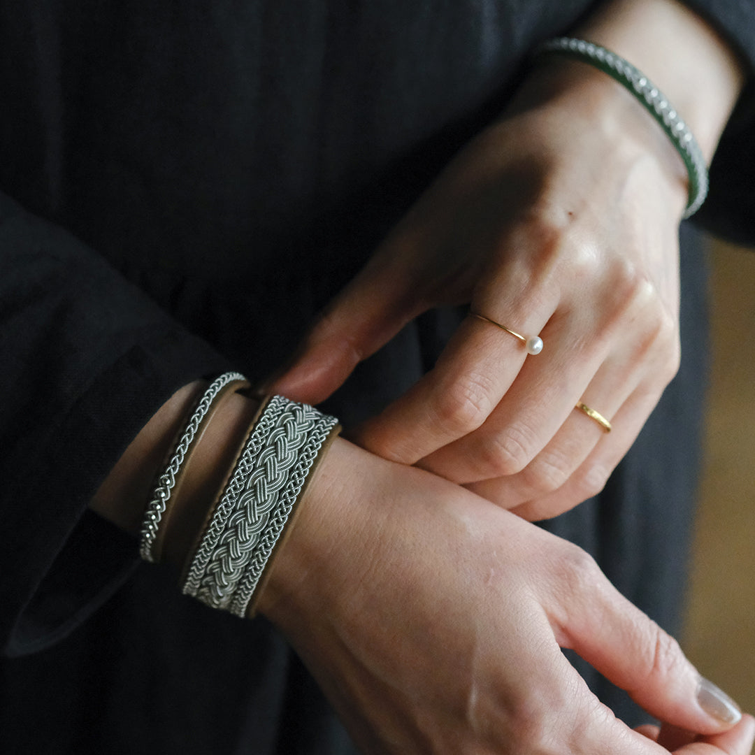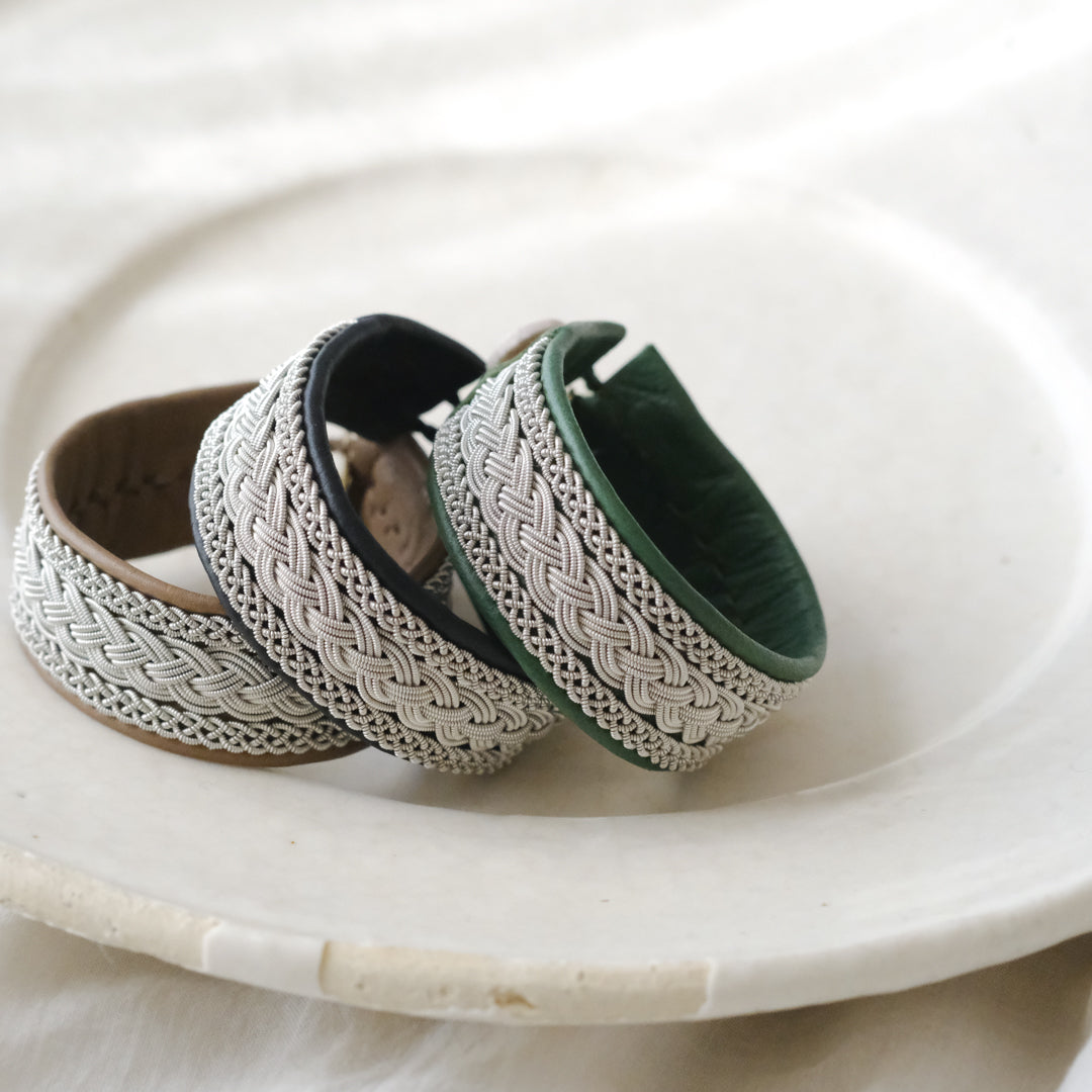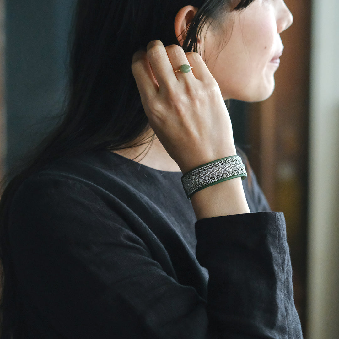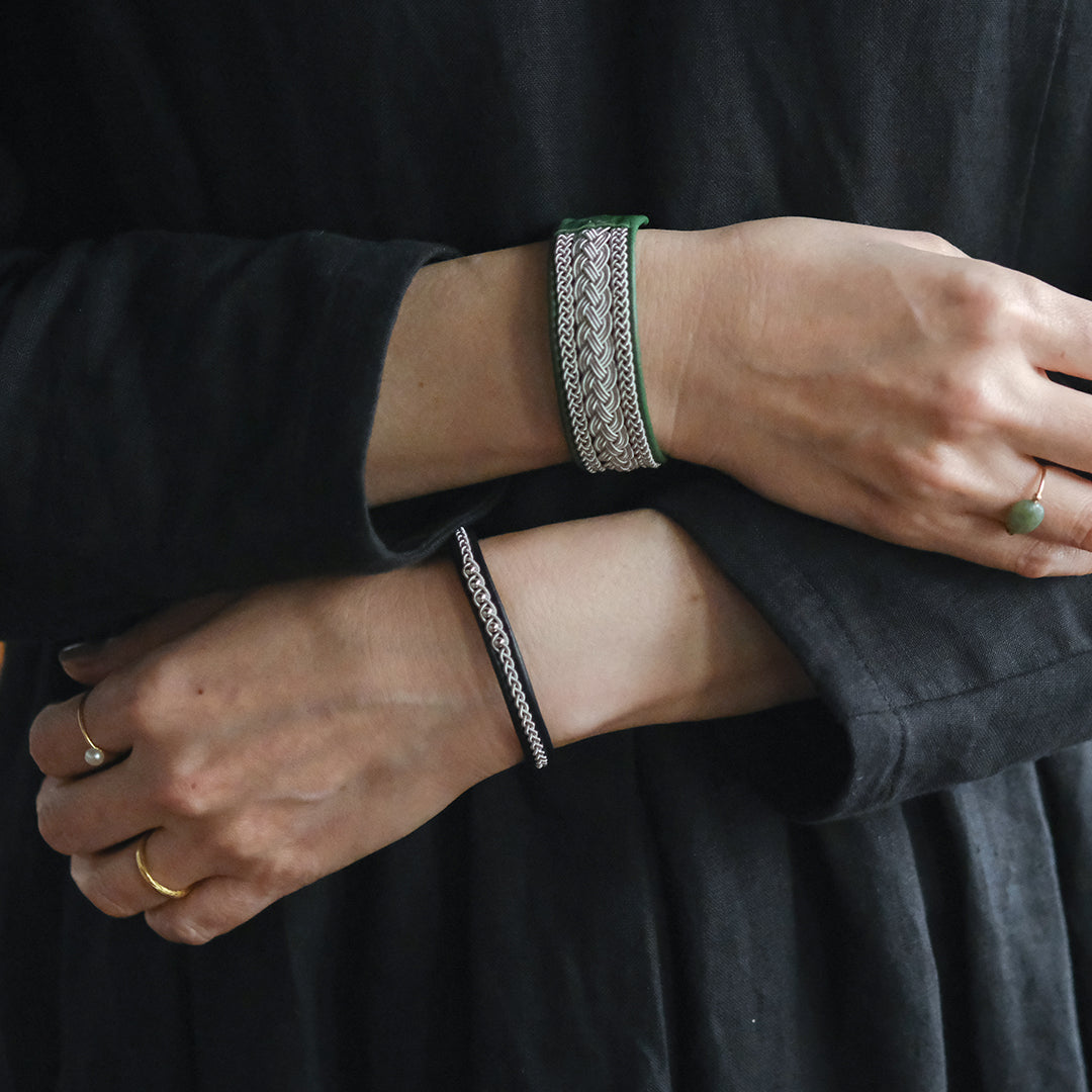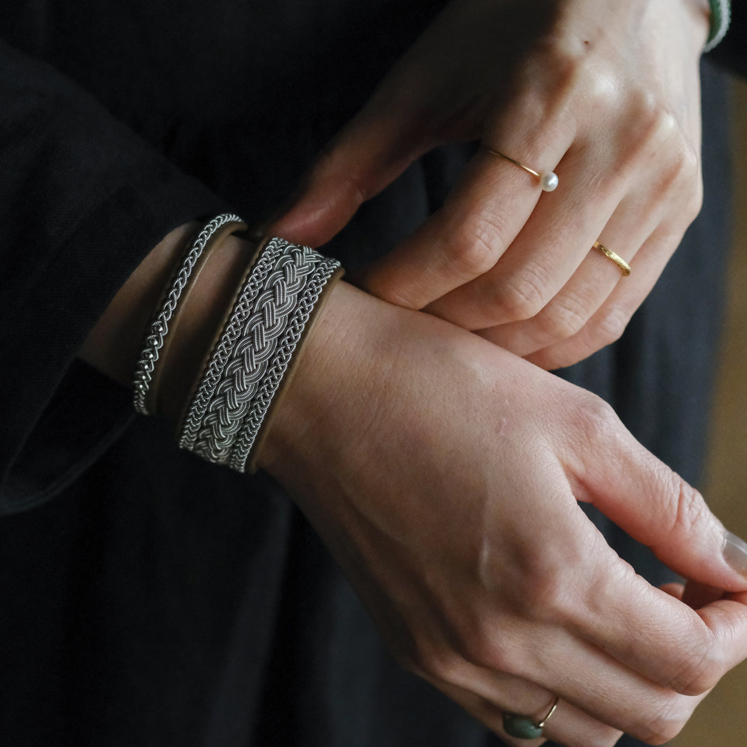 ピューターワイヤーを編み革に刺繍するブレスレットは、トナカイを食べて暮らすサーミ族ならではのアクセサリー、お守りのような存在です。