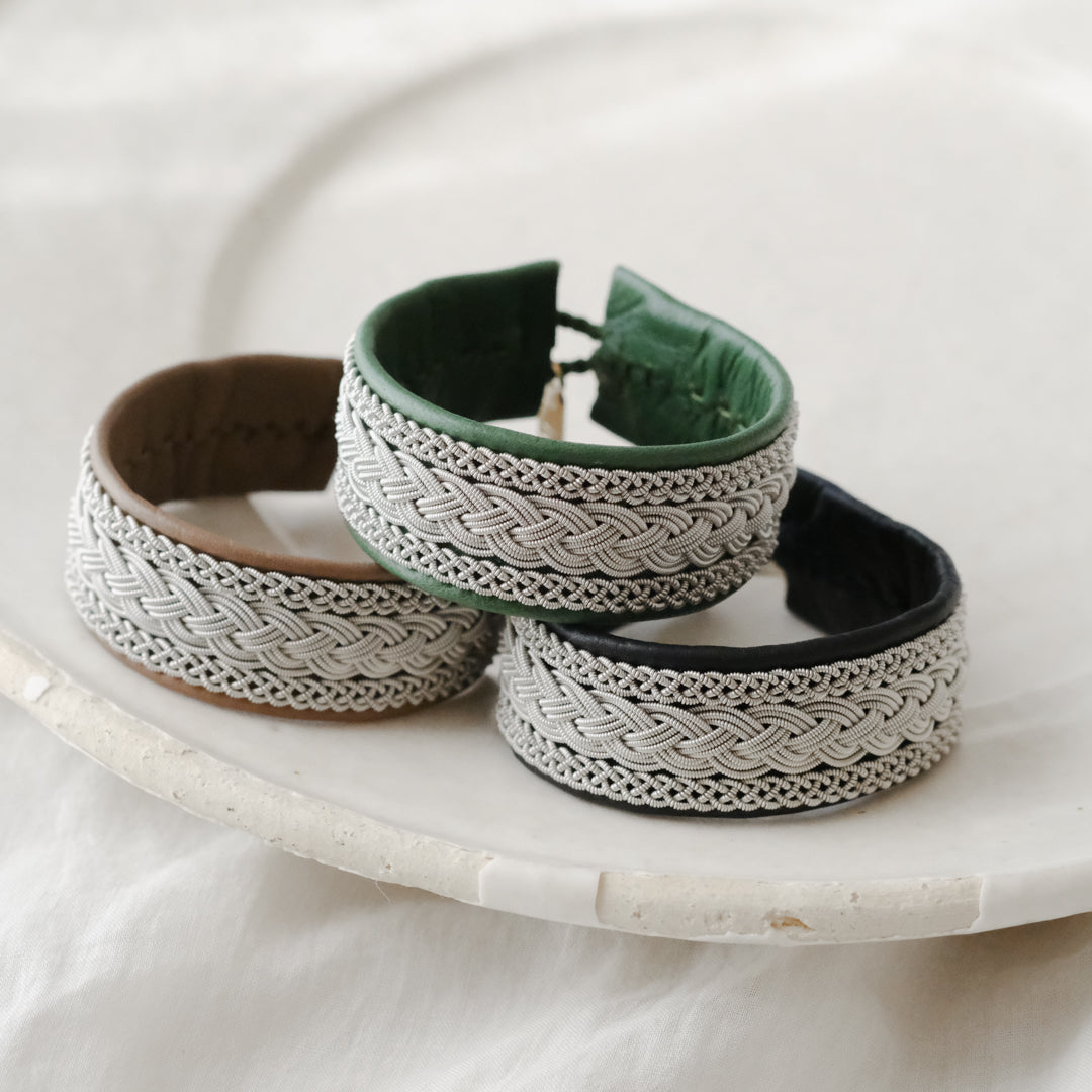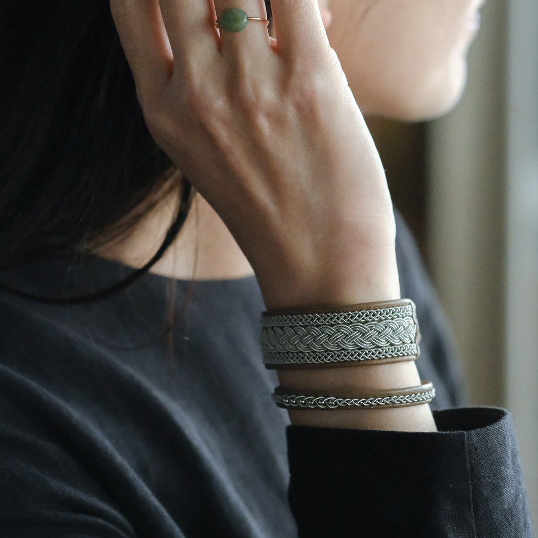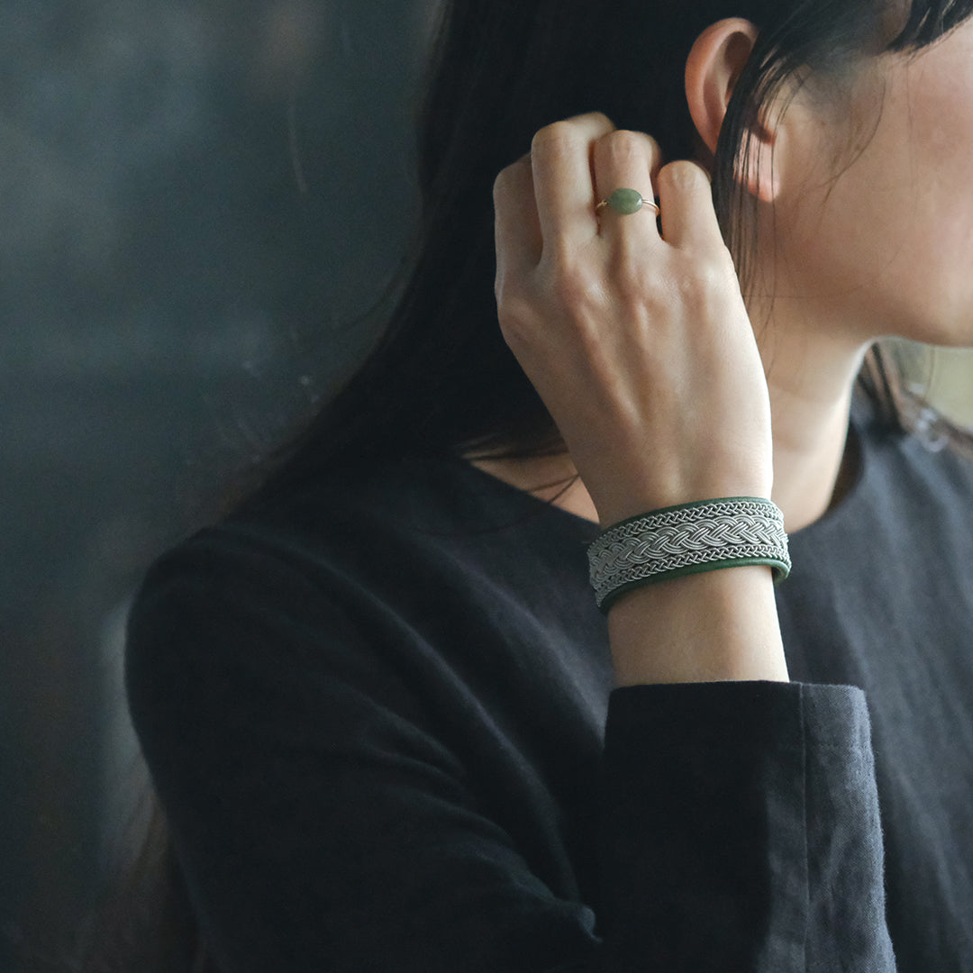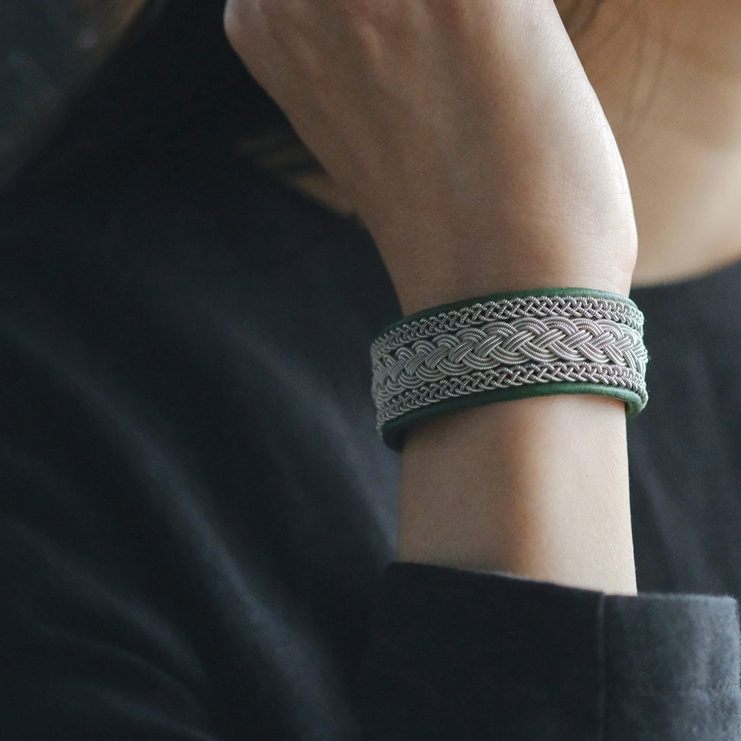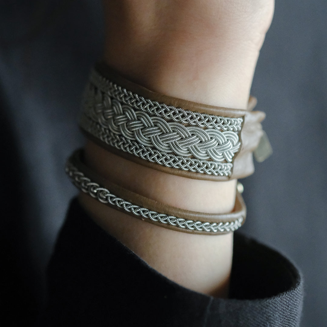 ピューターワイヤーを編み革に刺繍するブレスレットは、トナカイを食べて暮らすサーミ族ならではのアクセサリー、お守りのような存在です。