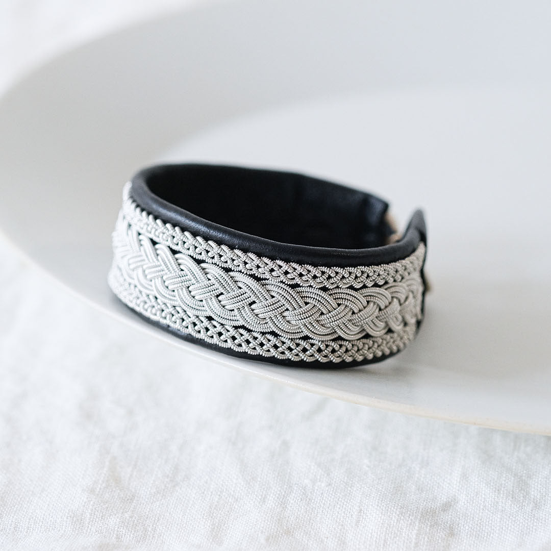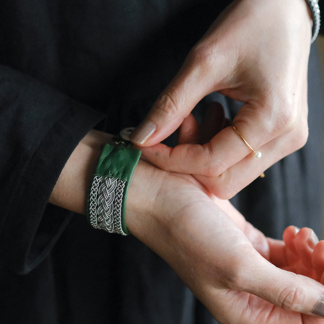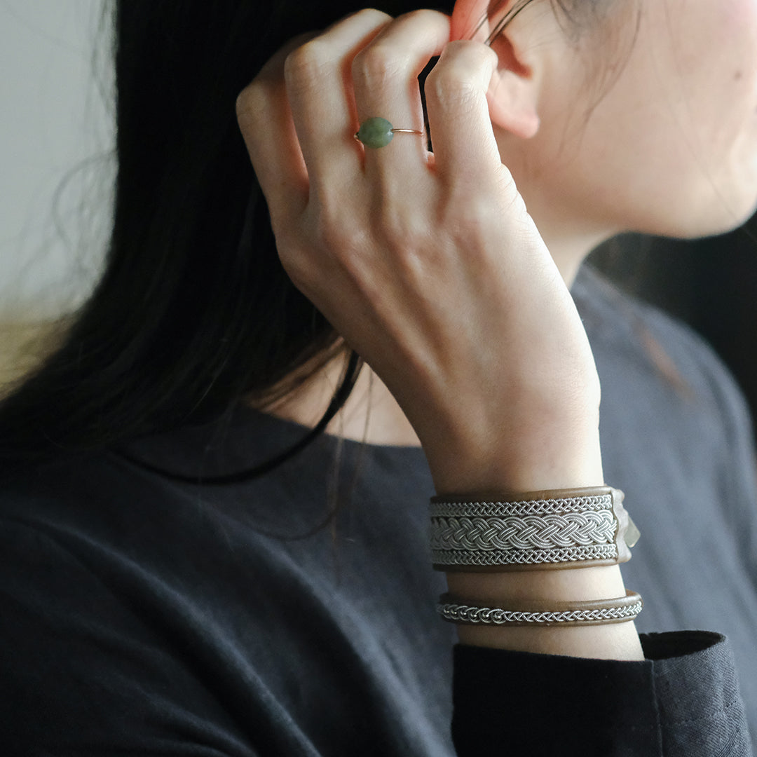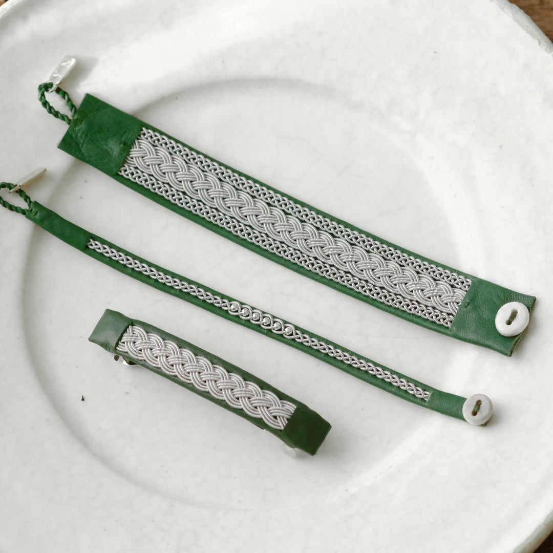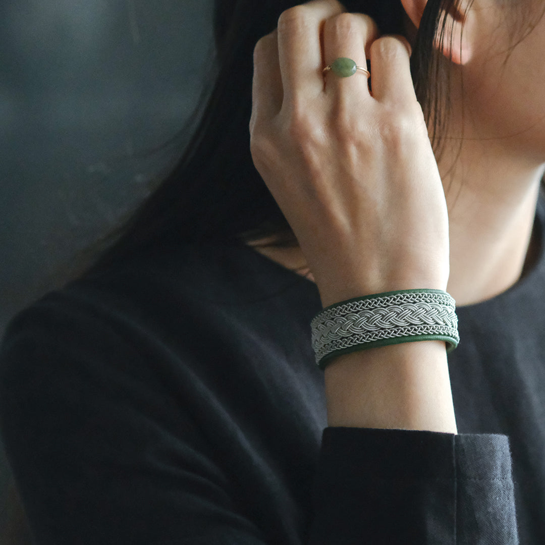 ピューターワイヤーを編み革に刺繍するブレスレットは、トナカイを食べて暮らすサーミ族ならではのアクセサリー、お守りのような存在です。