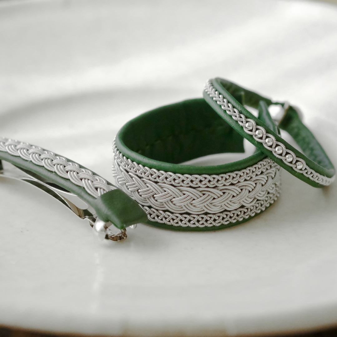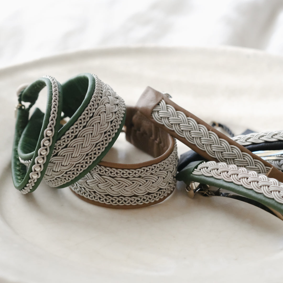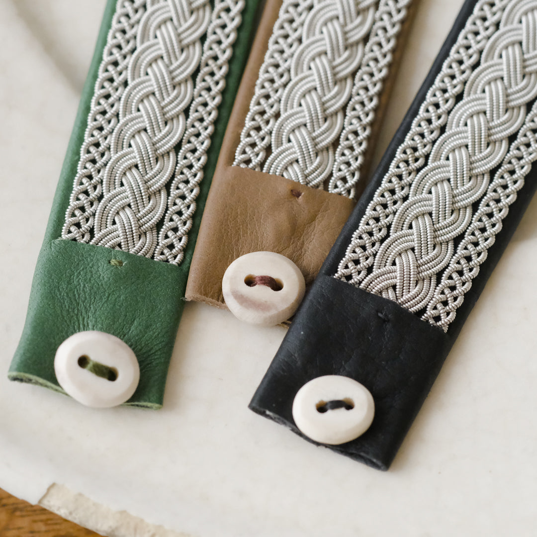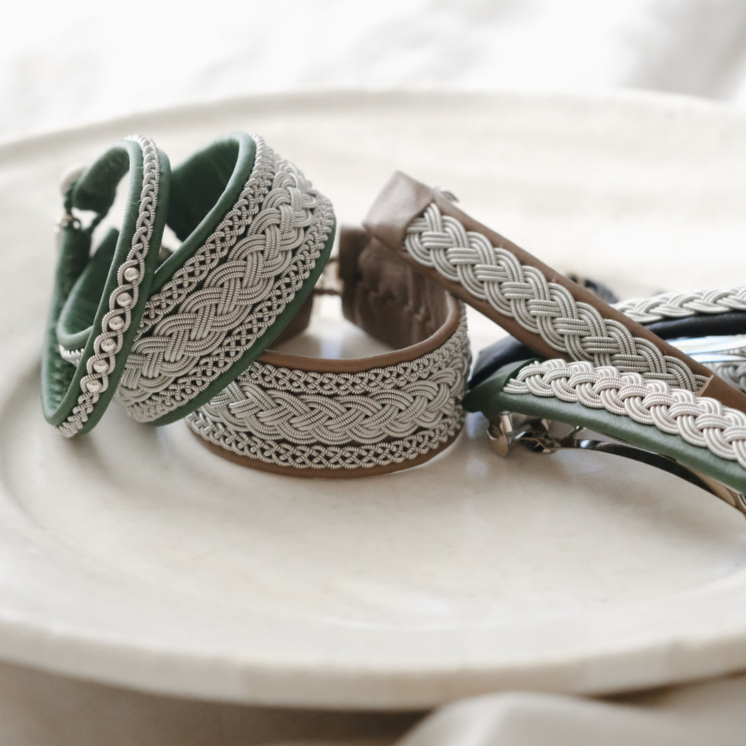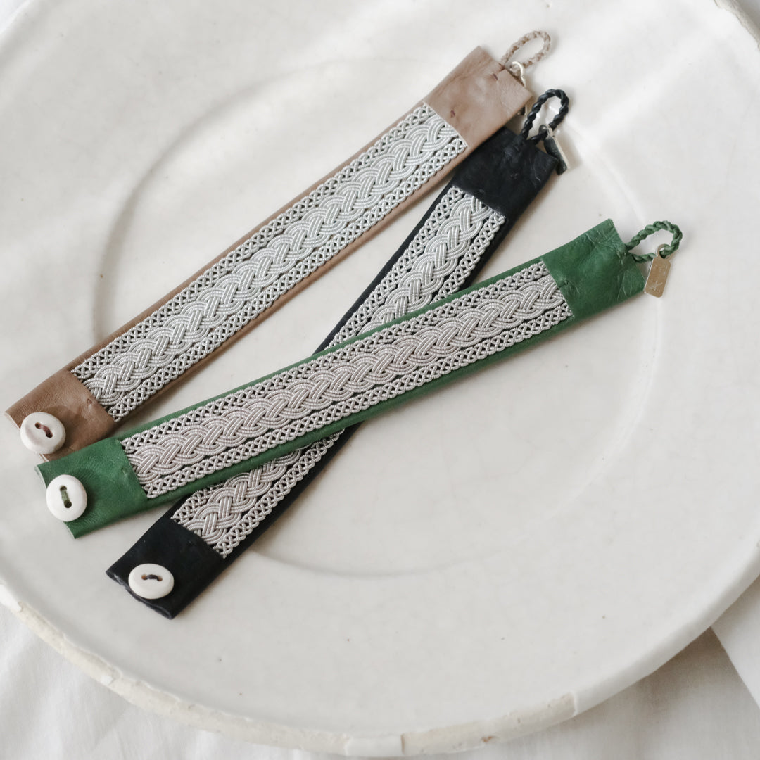 ピューターワイヤーを編み革に刺繍するブレスレットは、トナカイを食べて暮らすサーミ族ならではのアクセサリー、お守りのような存在です。