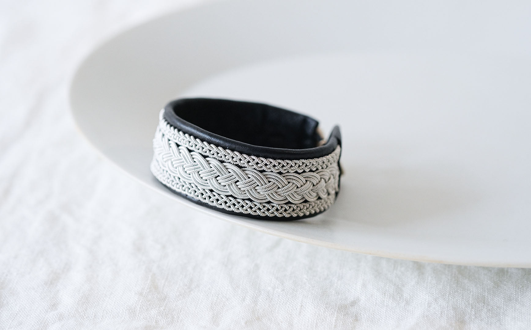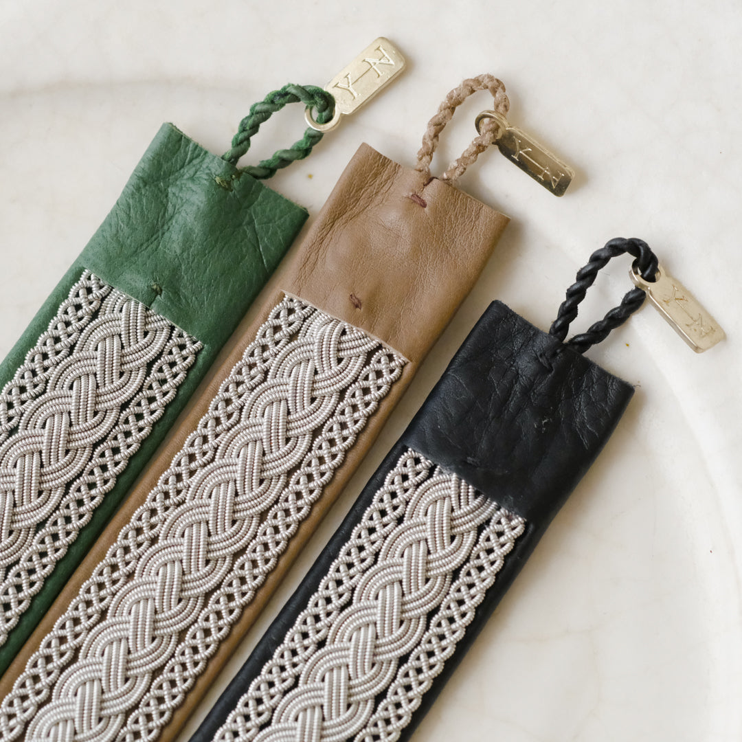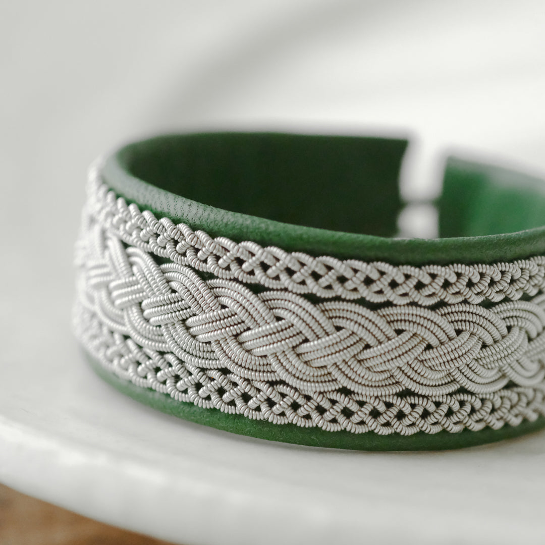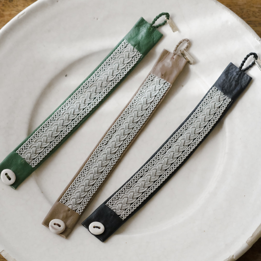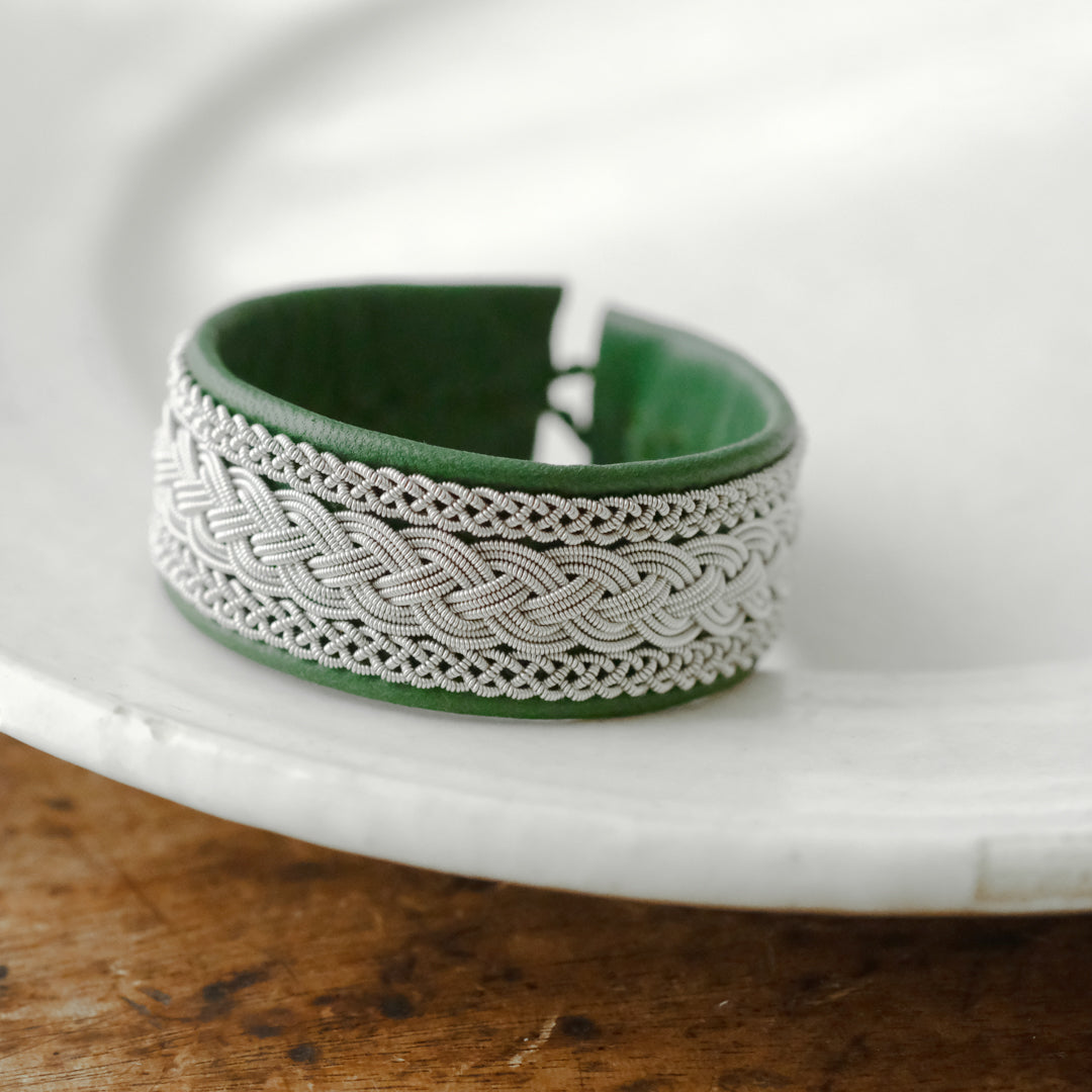 ピューターワイヤーを編み革に刺繍するブレスレットは、トナカイを食べて暮らすサーミ族ならではのアクセサリー、お守りのような存在です。