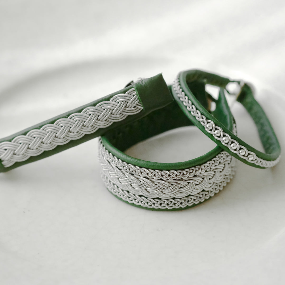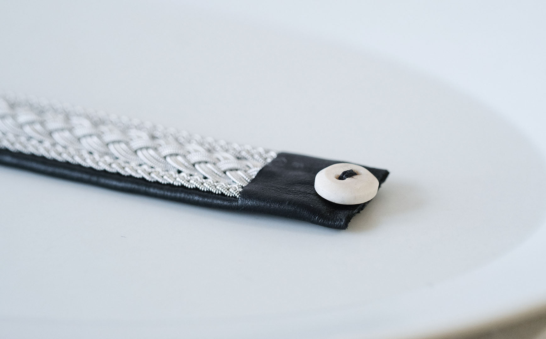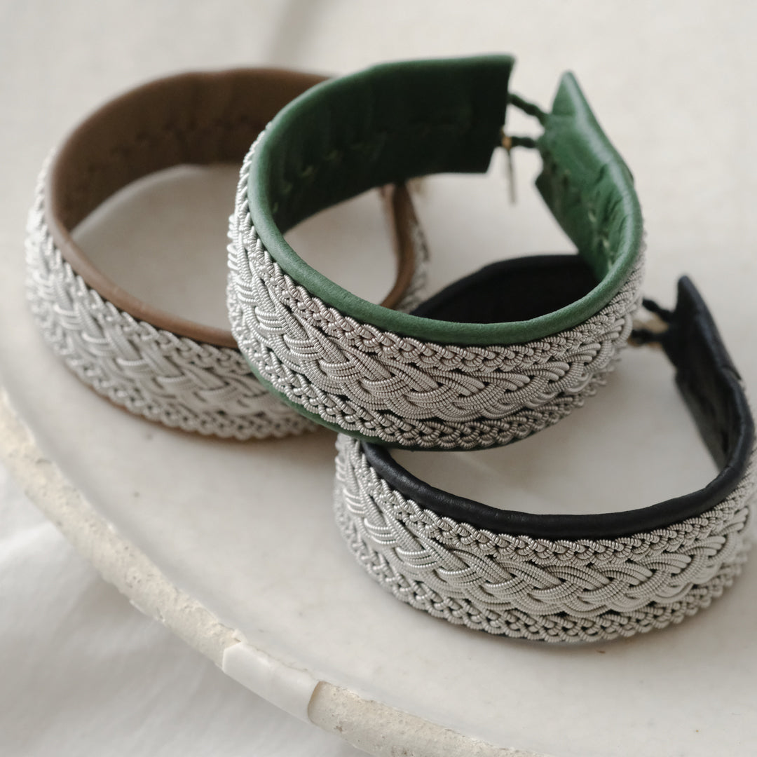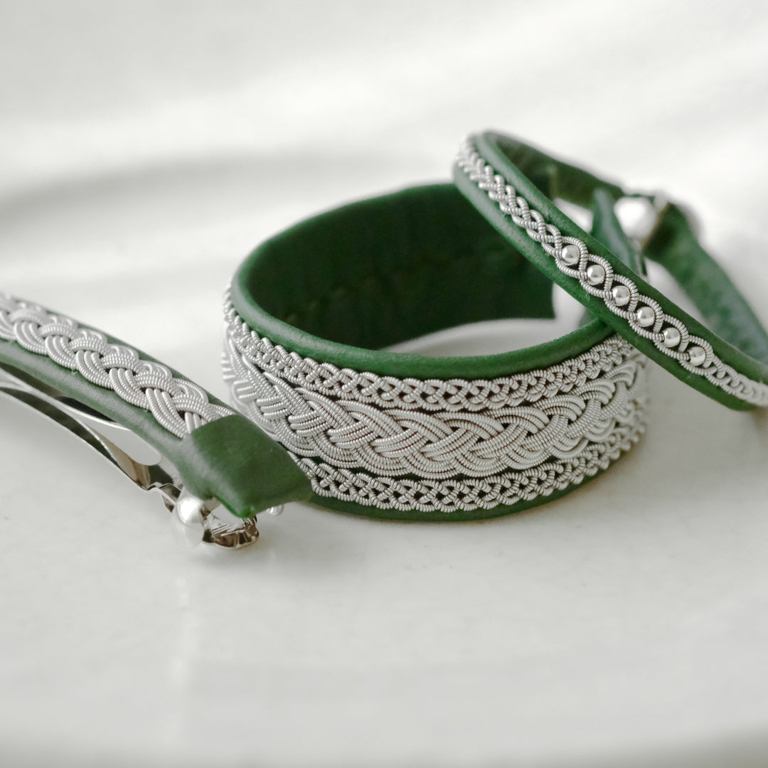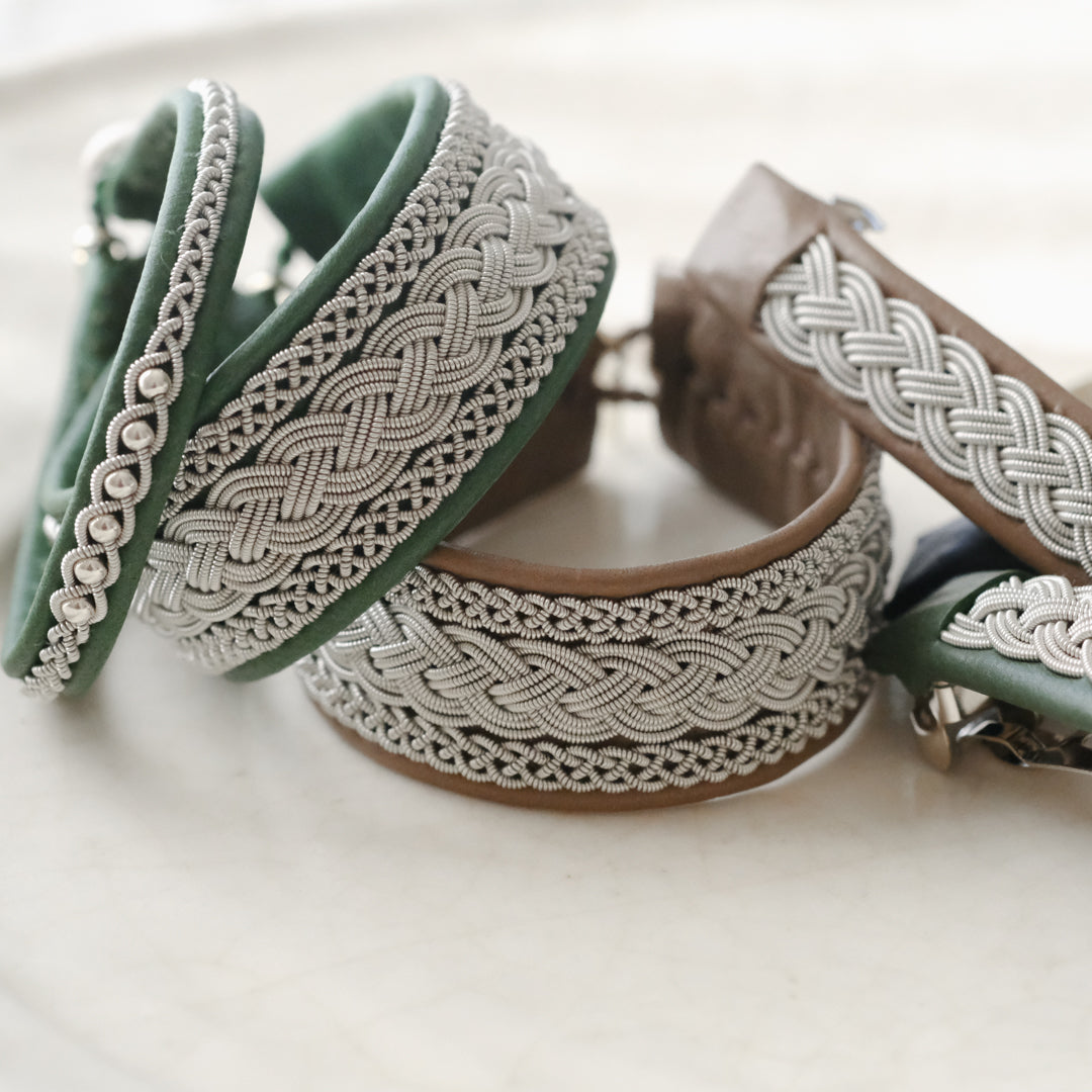 ピューターワイヤーを編み革に刺繍するブレスレットは、トナカイを食べて暮らすサーミ族ならではのアクセサリー、お守りのような存在です。