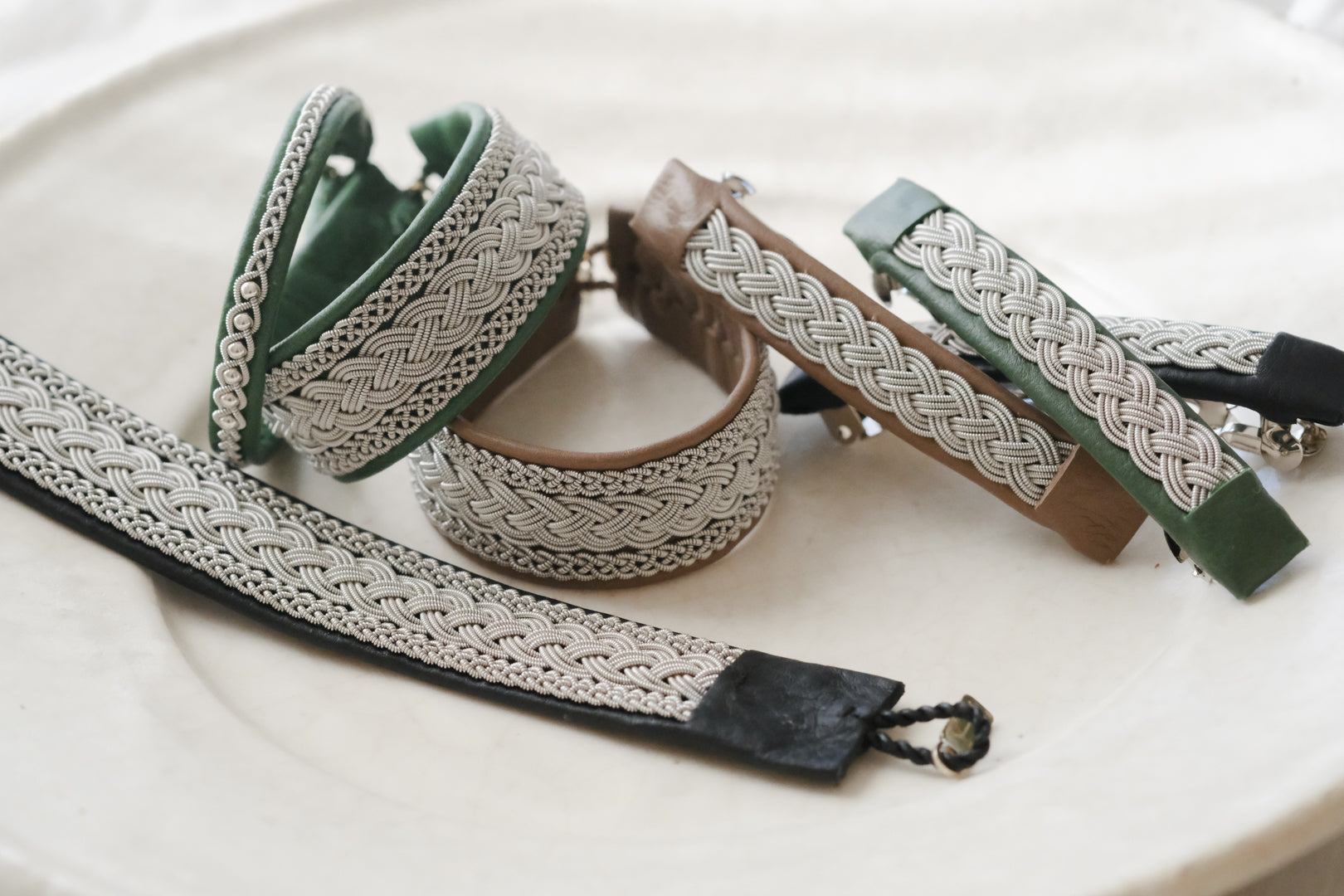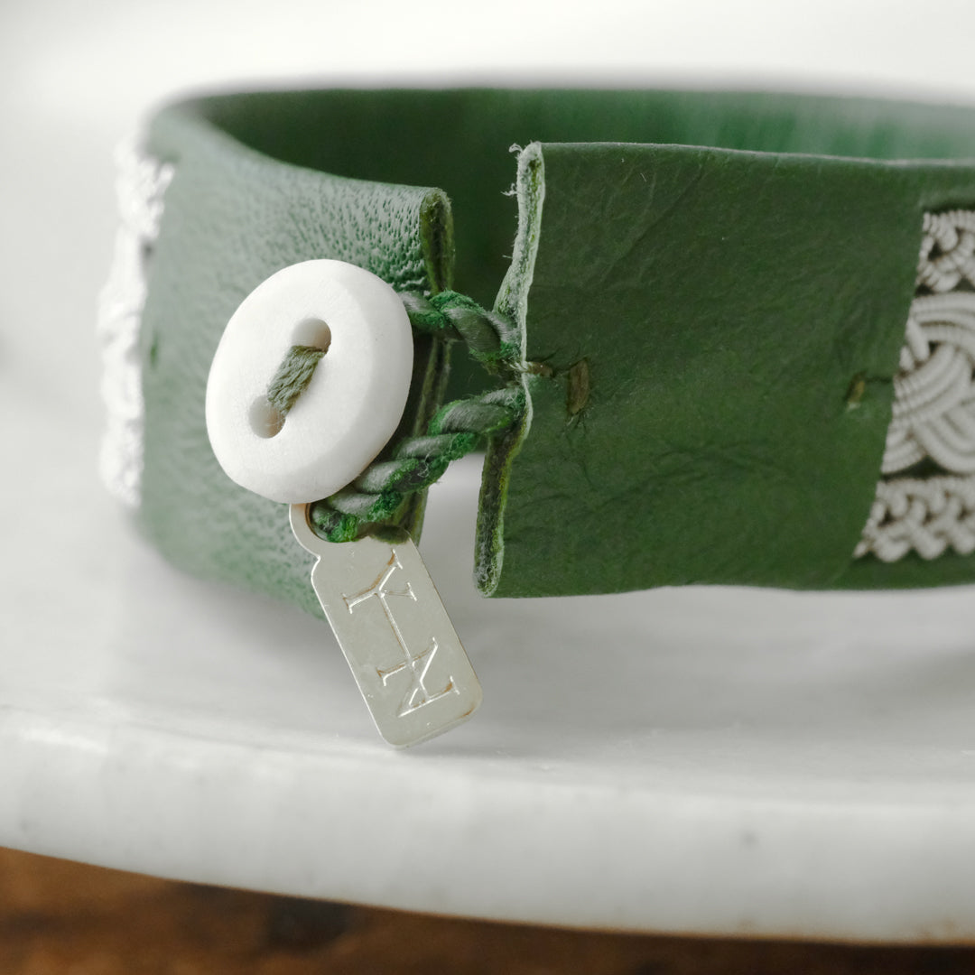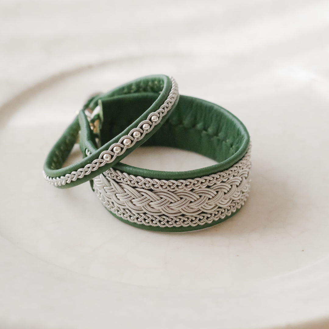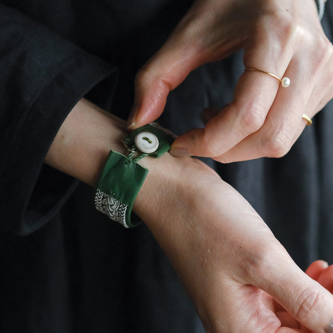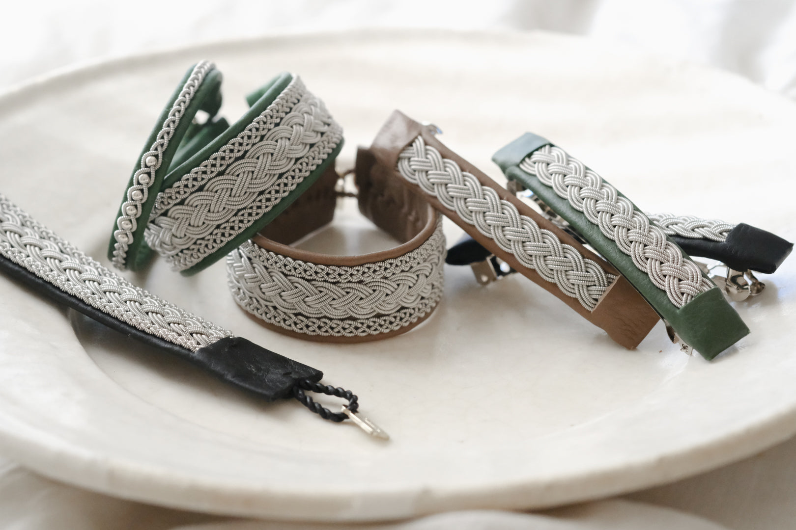 ピューターワイヤーを編み革に刺繍するブレスレットは、トナカイを食べて暮らすサーミ族ならではのアクセサリー、お守りのような存在です。