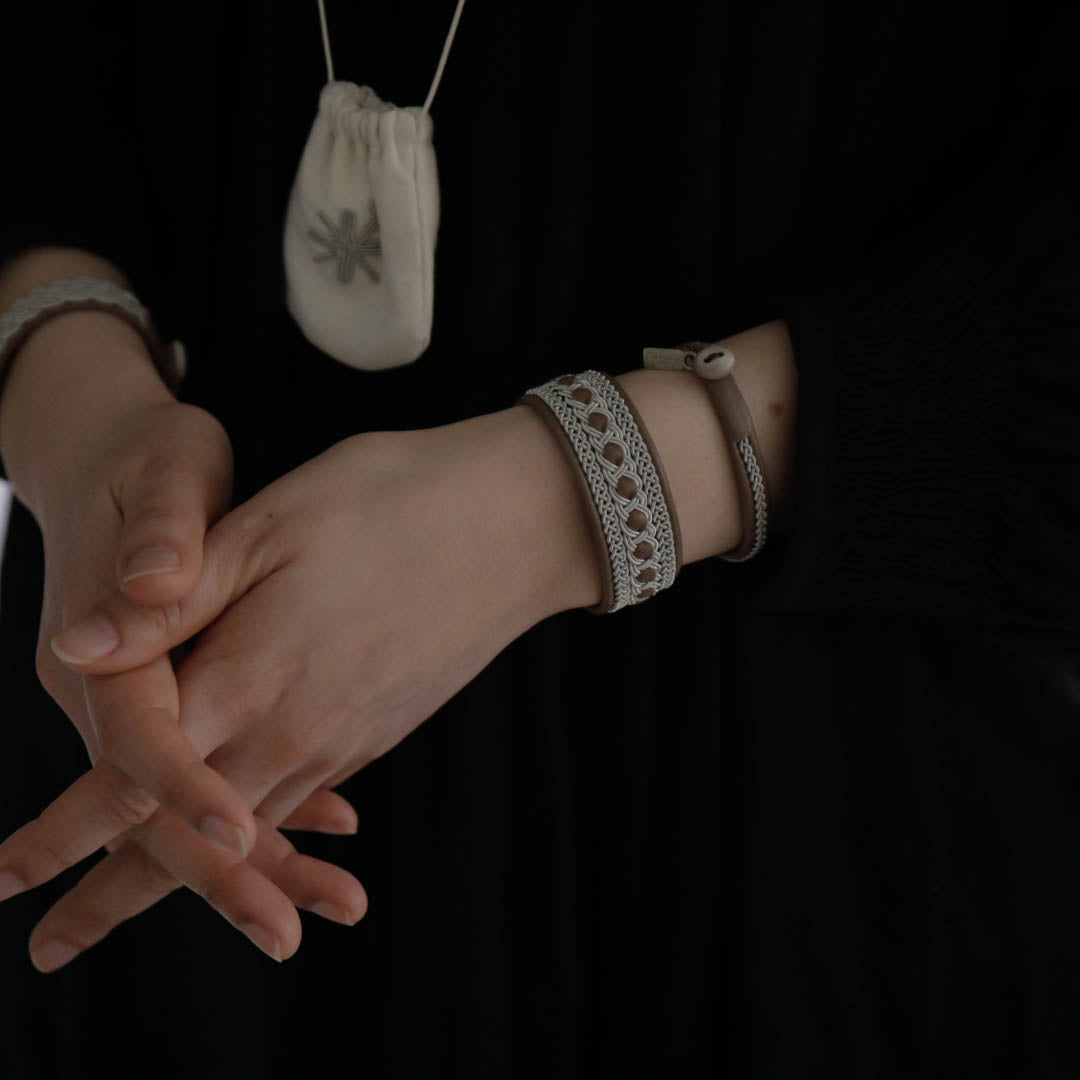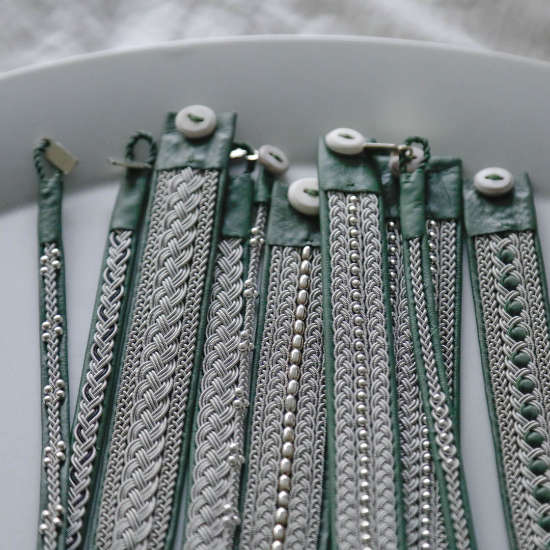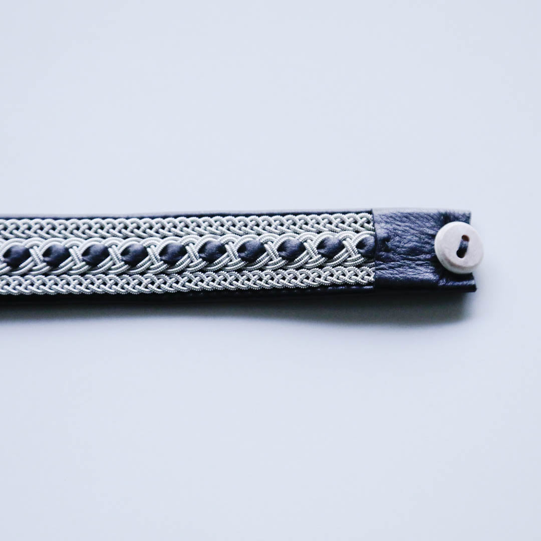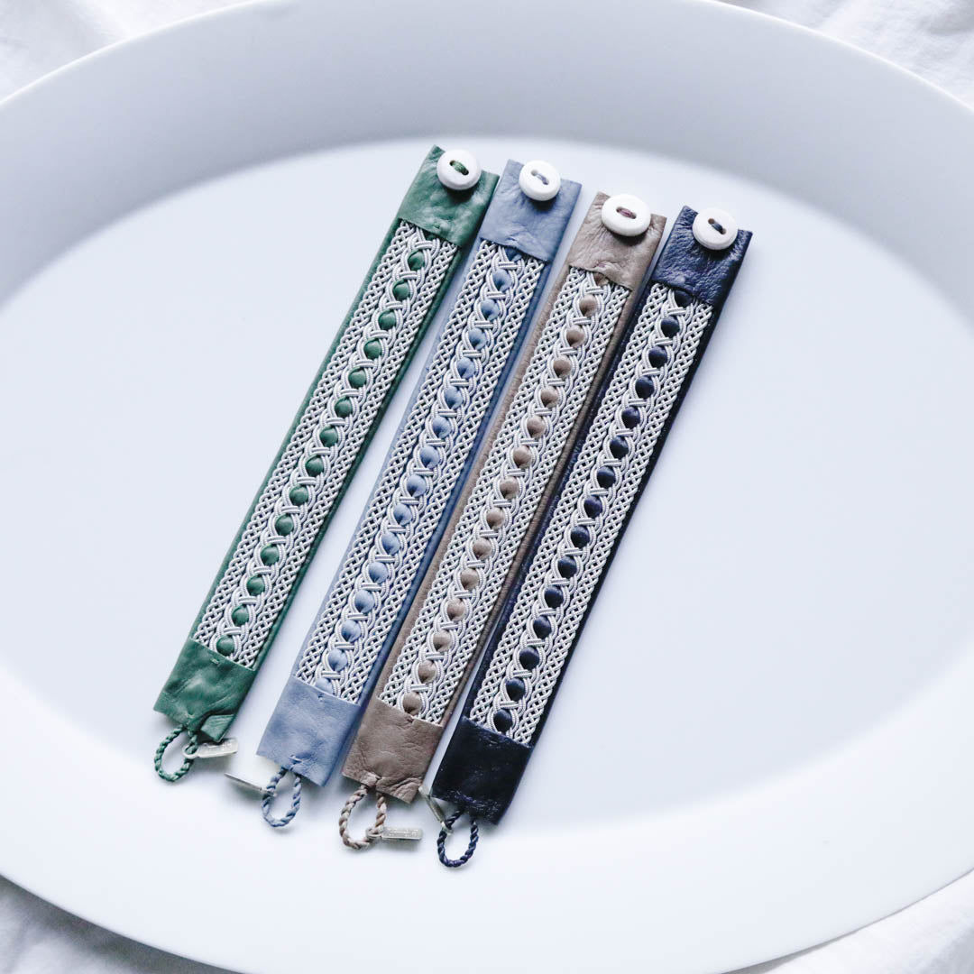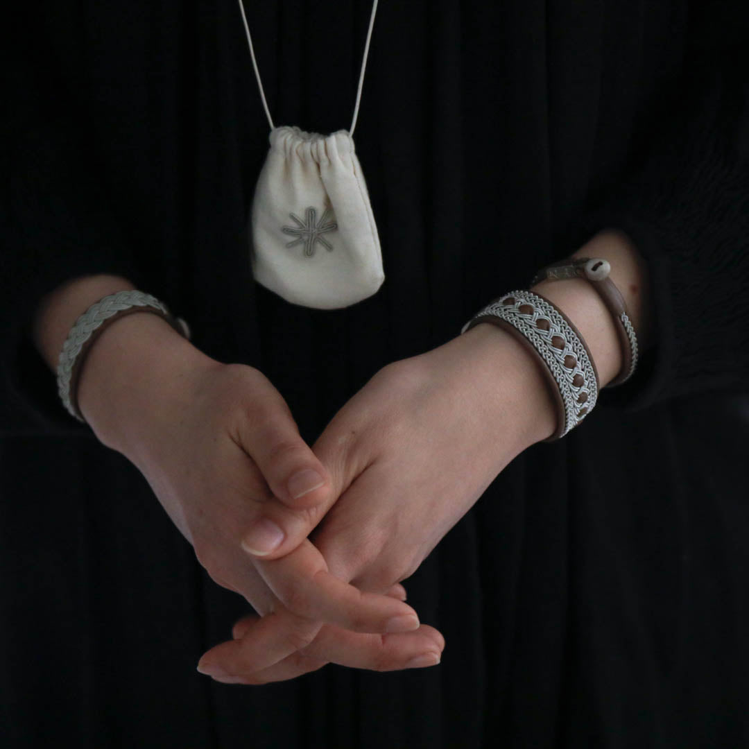 ピューターワイヤーを編み革に刺繍するブレスレットは、トナカイを食べて暮らすサーミ族ならではのアクセサリー、お守りのような存在です。