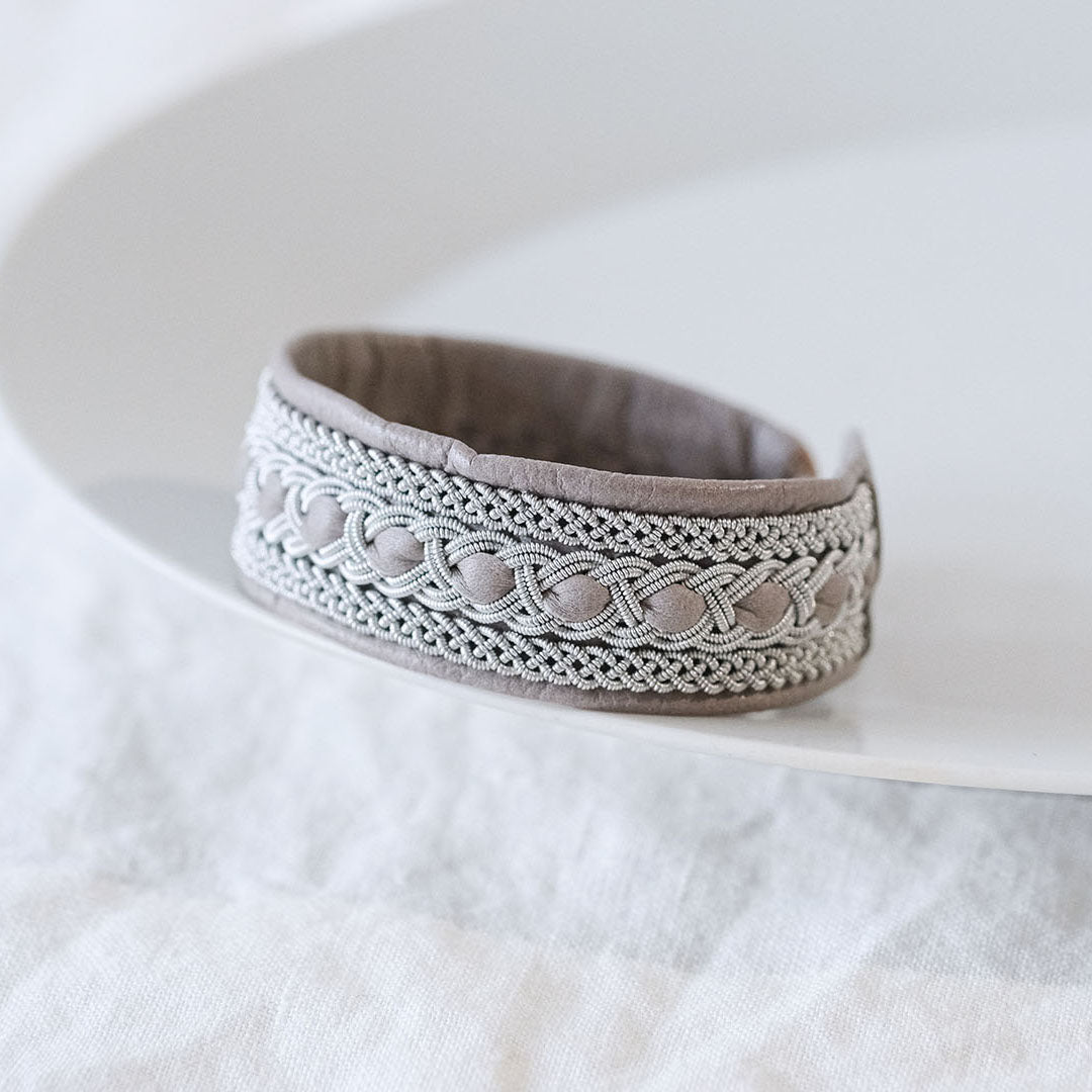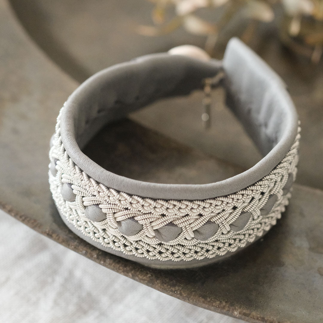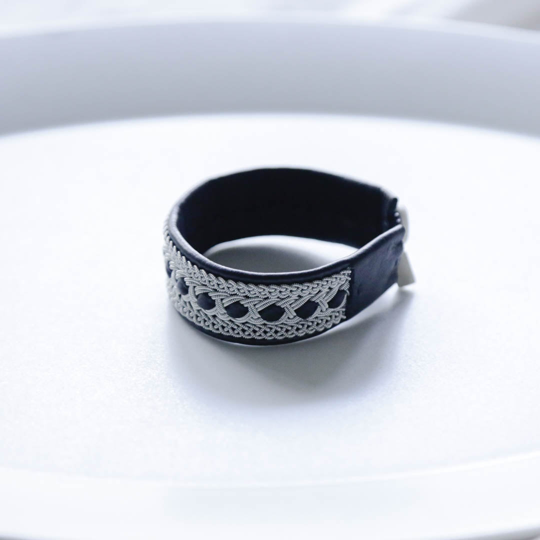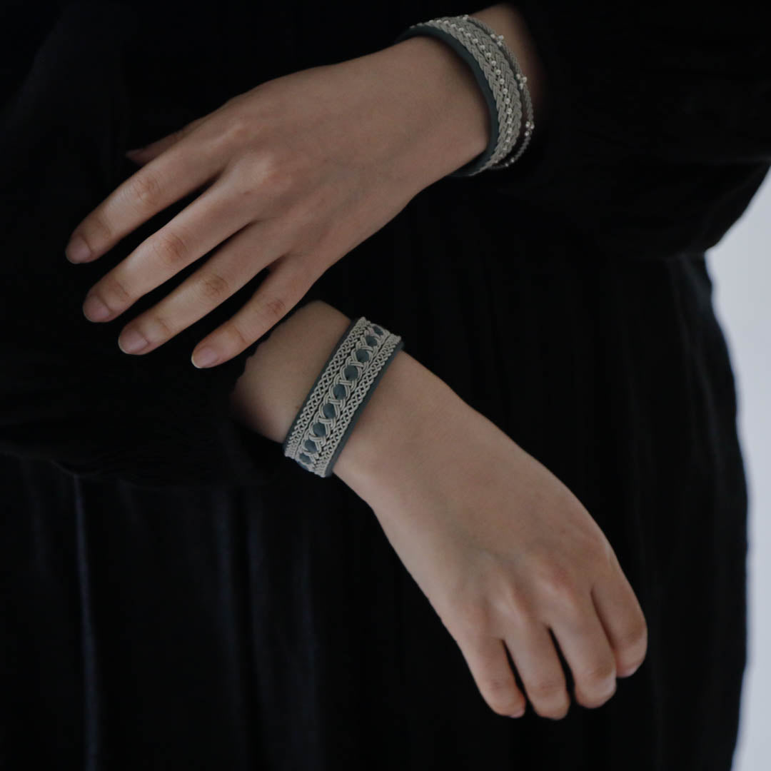 ピューターワイヤーを編み革に刺繍するブレスレットは、トナカイを食べて暮らすサーミ族ならではのアクセサリー、お守りのような存在です。