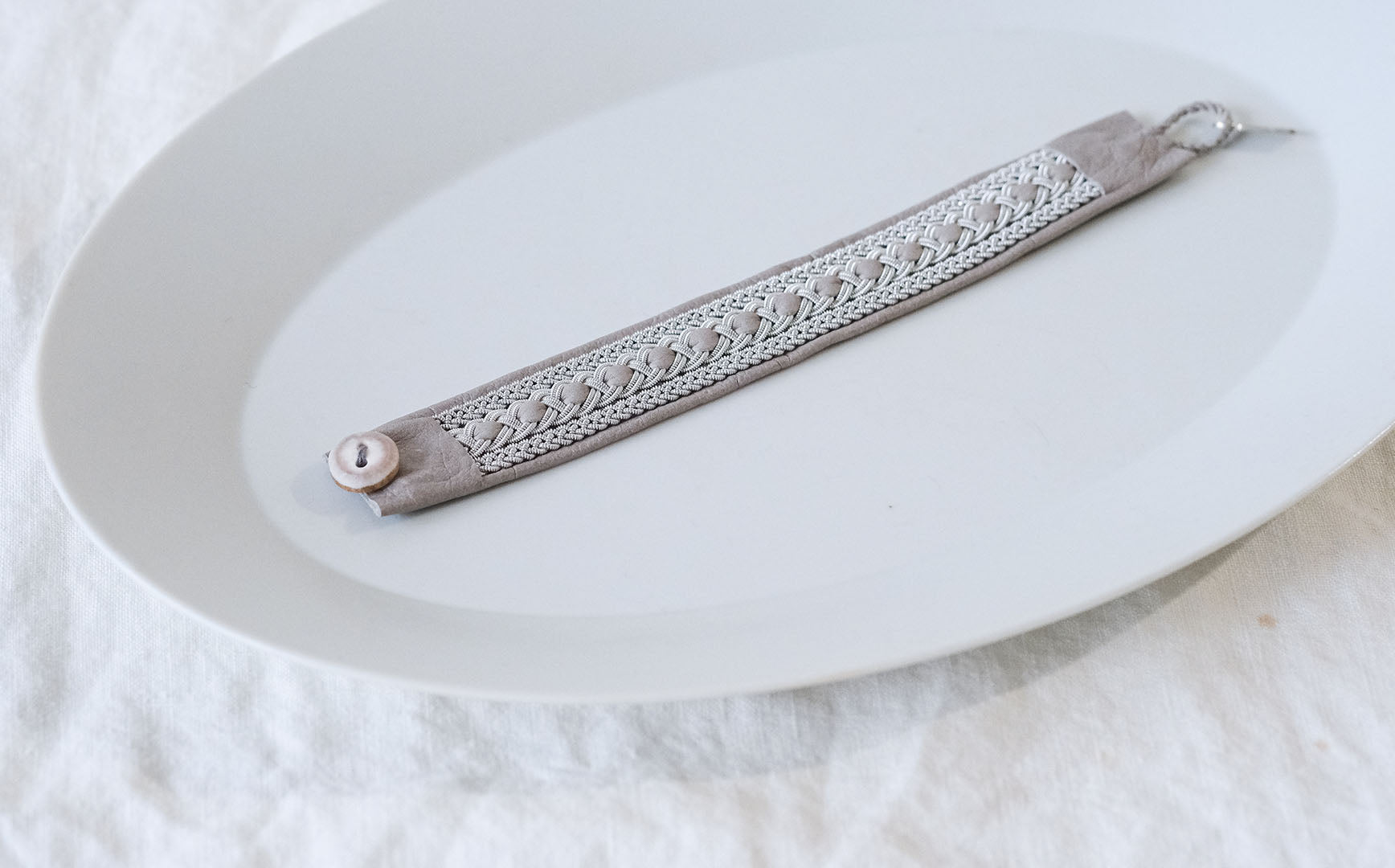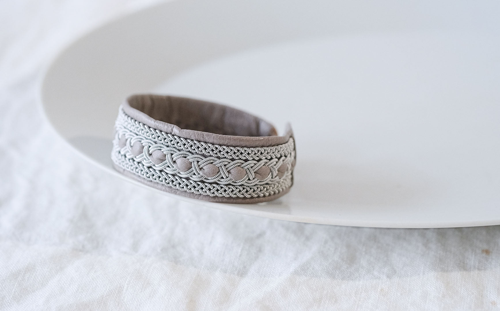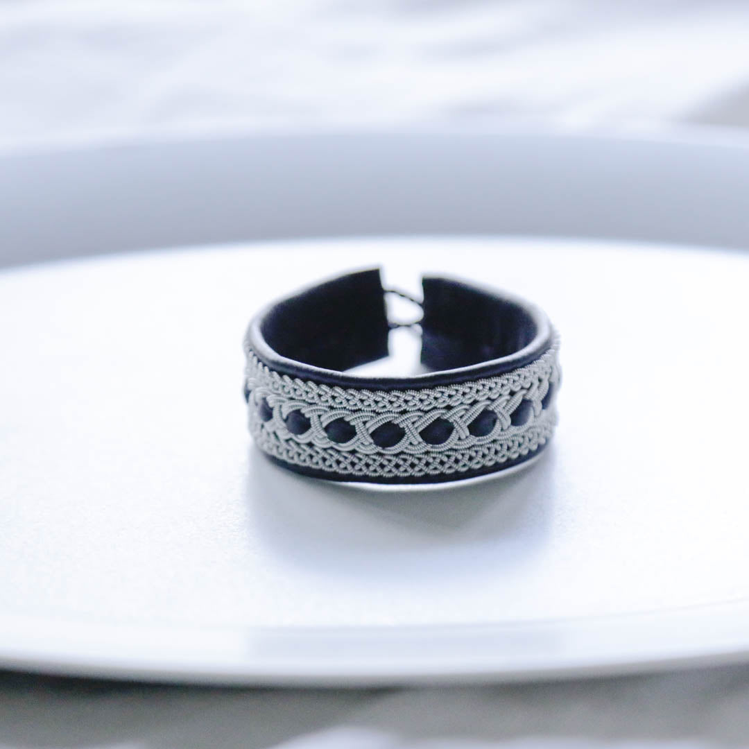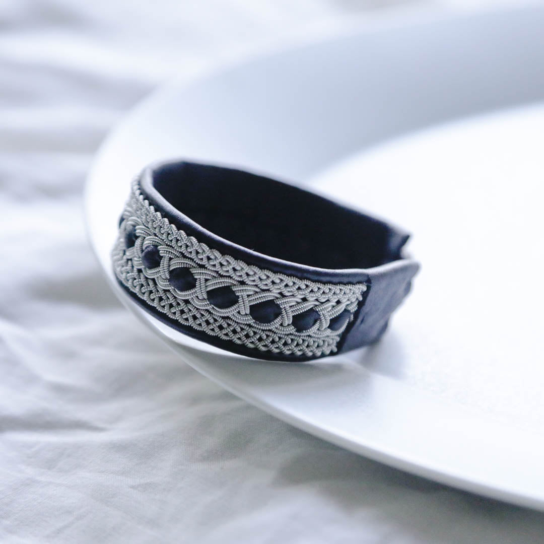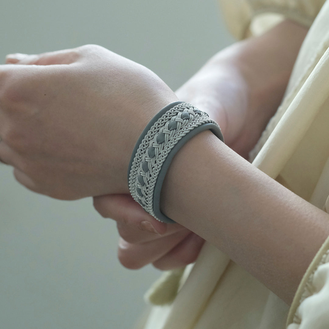 ピューターワイヤーを編み革に刺繍するブレスレットは、トナカイを食べて暮らすサーミ族ならではのアクセサリー、お守りのような存在です。