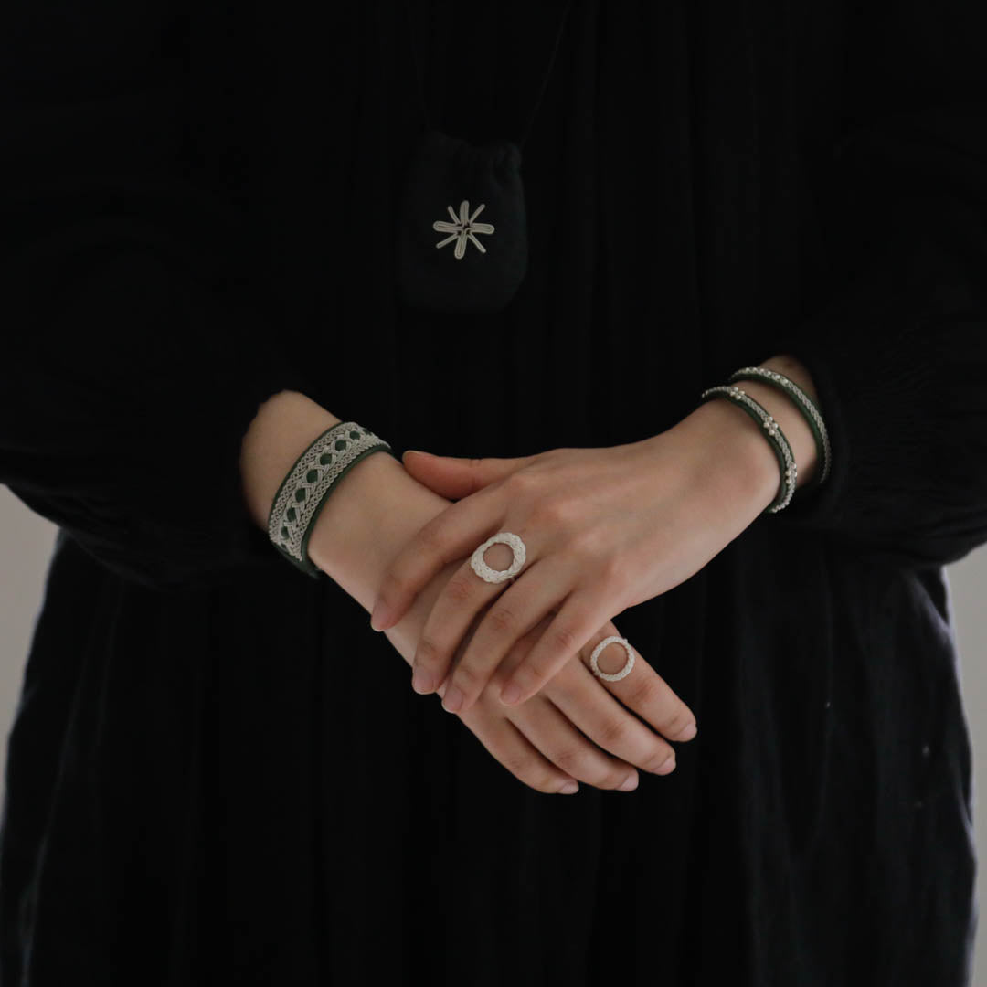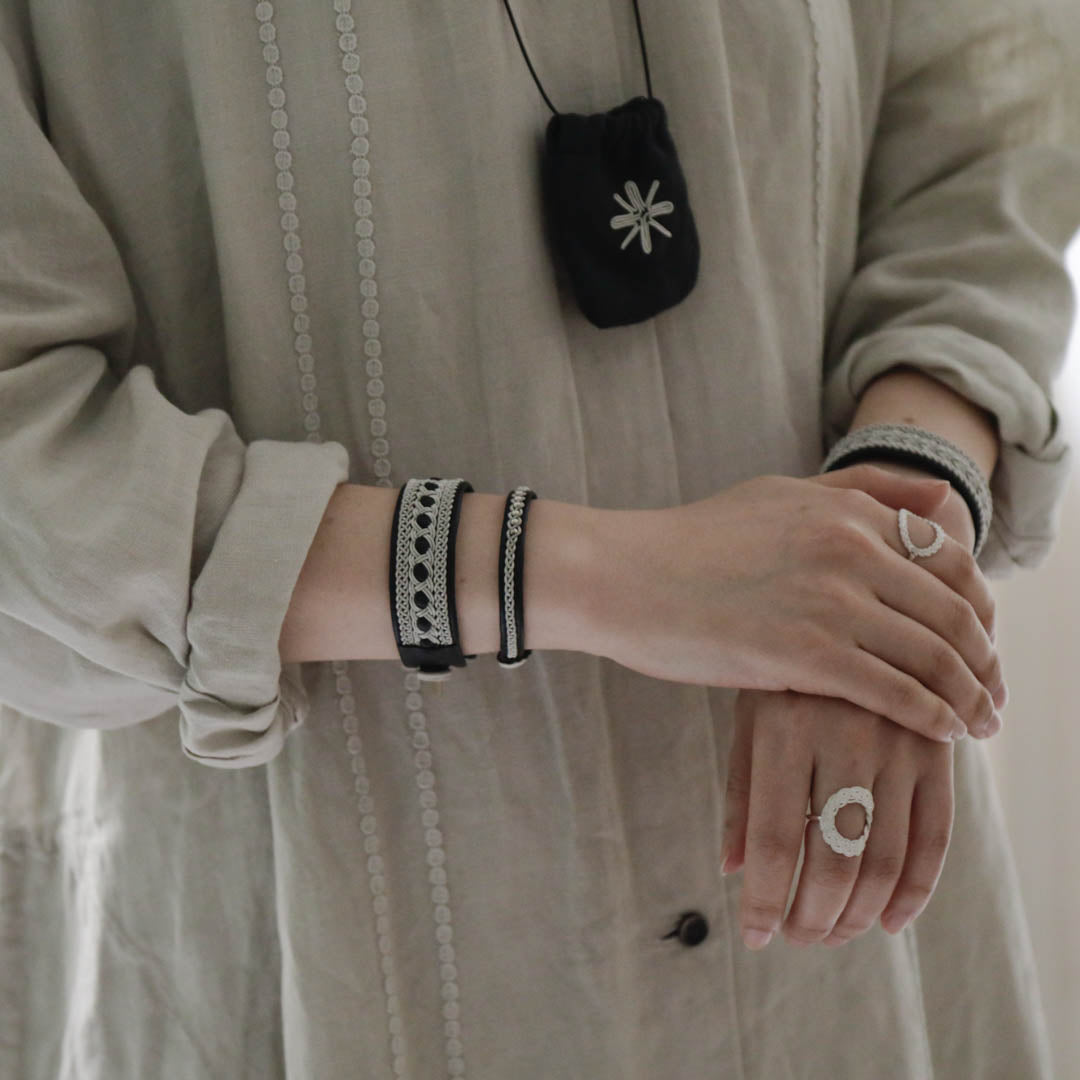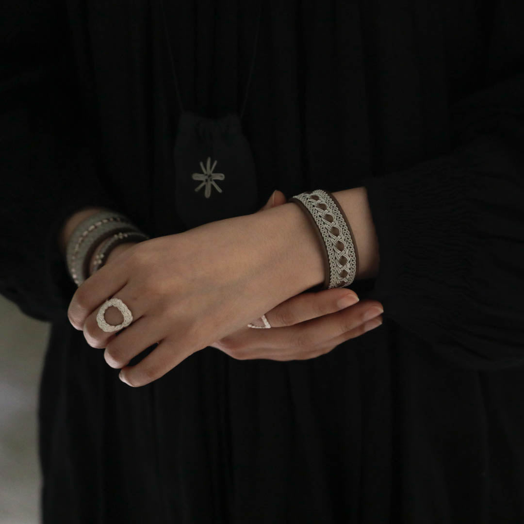 その伝統を取り入れつつ、あえてゆるく編むことでレースのような繊細さを表現。トライバルモードになりすぎず、普段の装いになじみます。