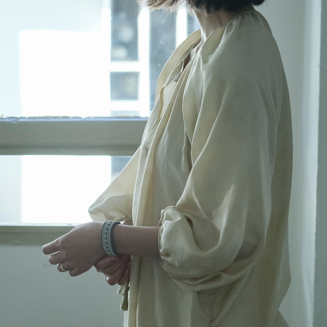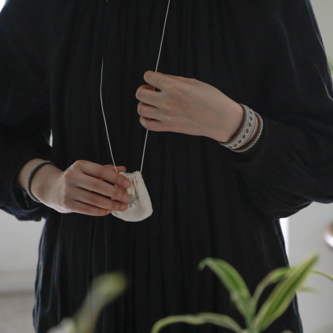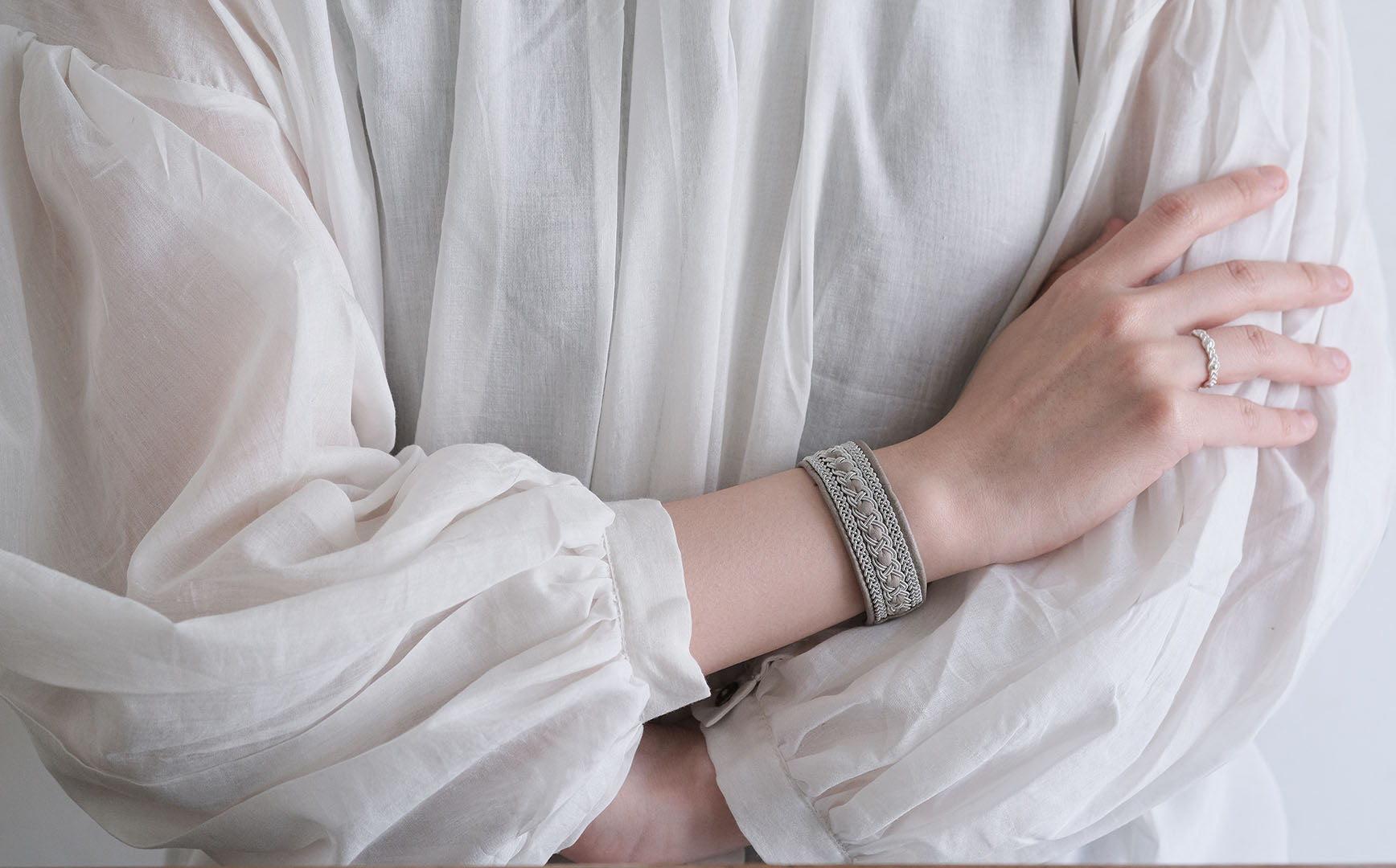 その伝統を取り入れつつ、あえてゆるく編むことでレースのような繊細さを表現。トライバルモードになりすぎず、普段の装いになじみます。