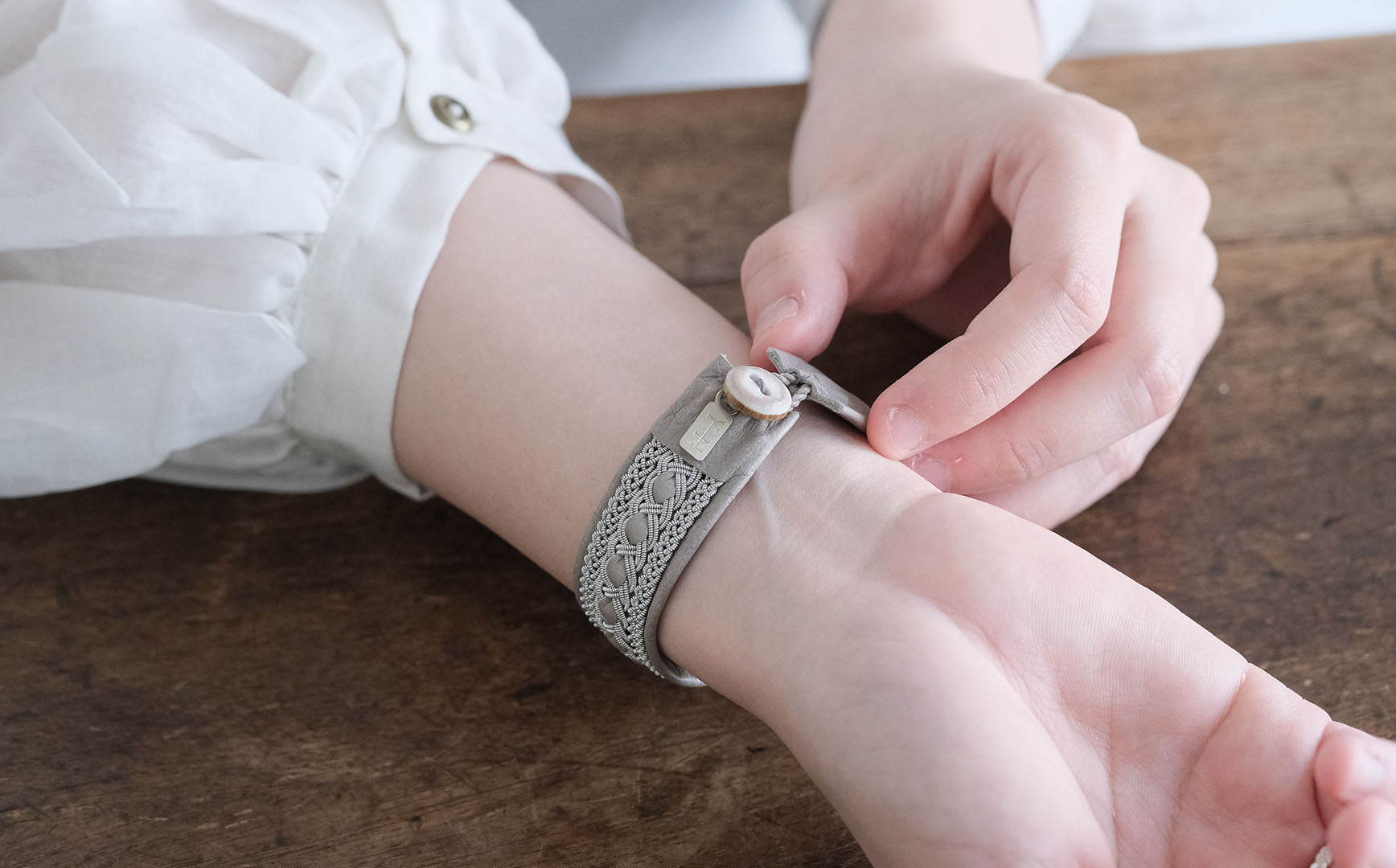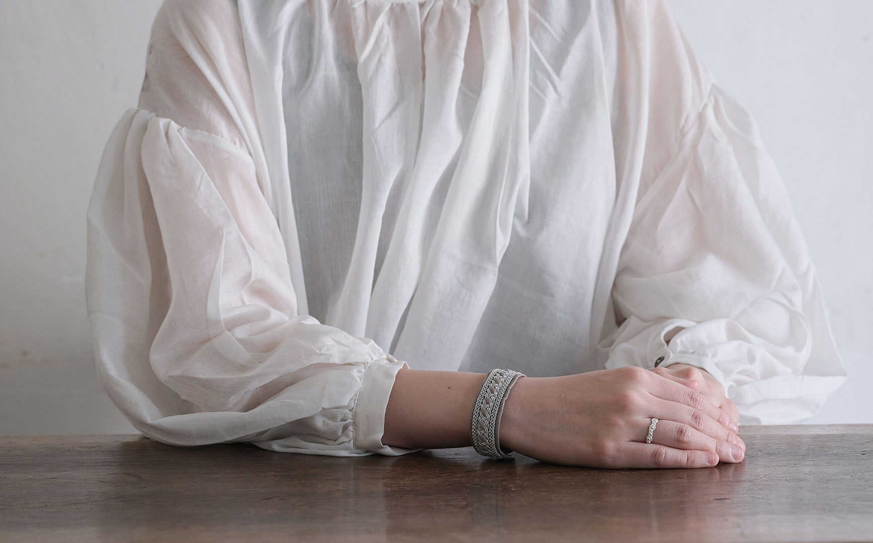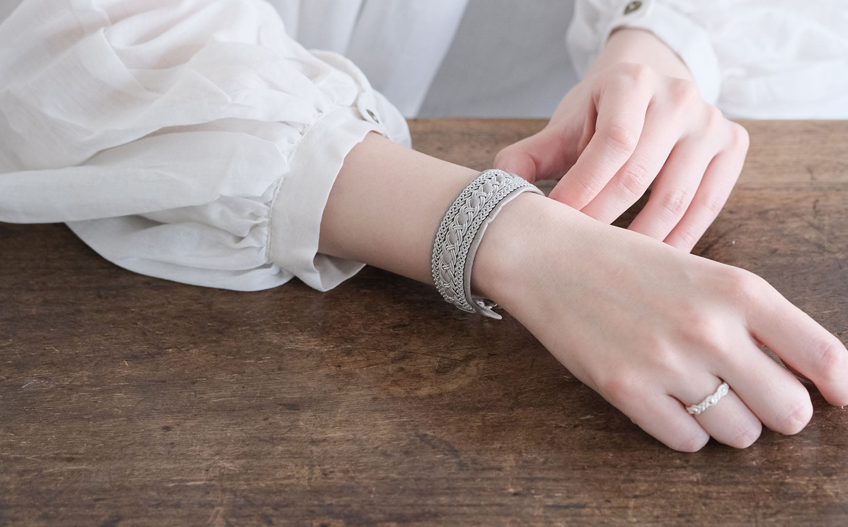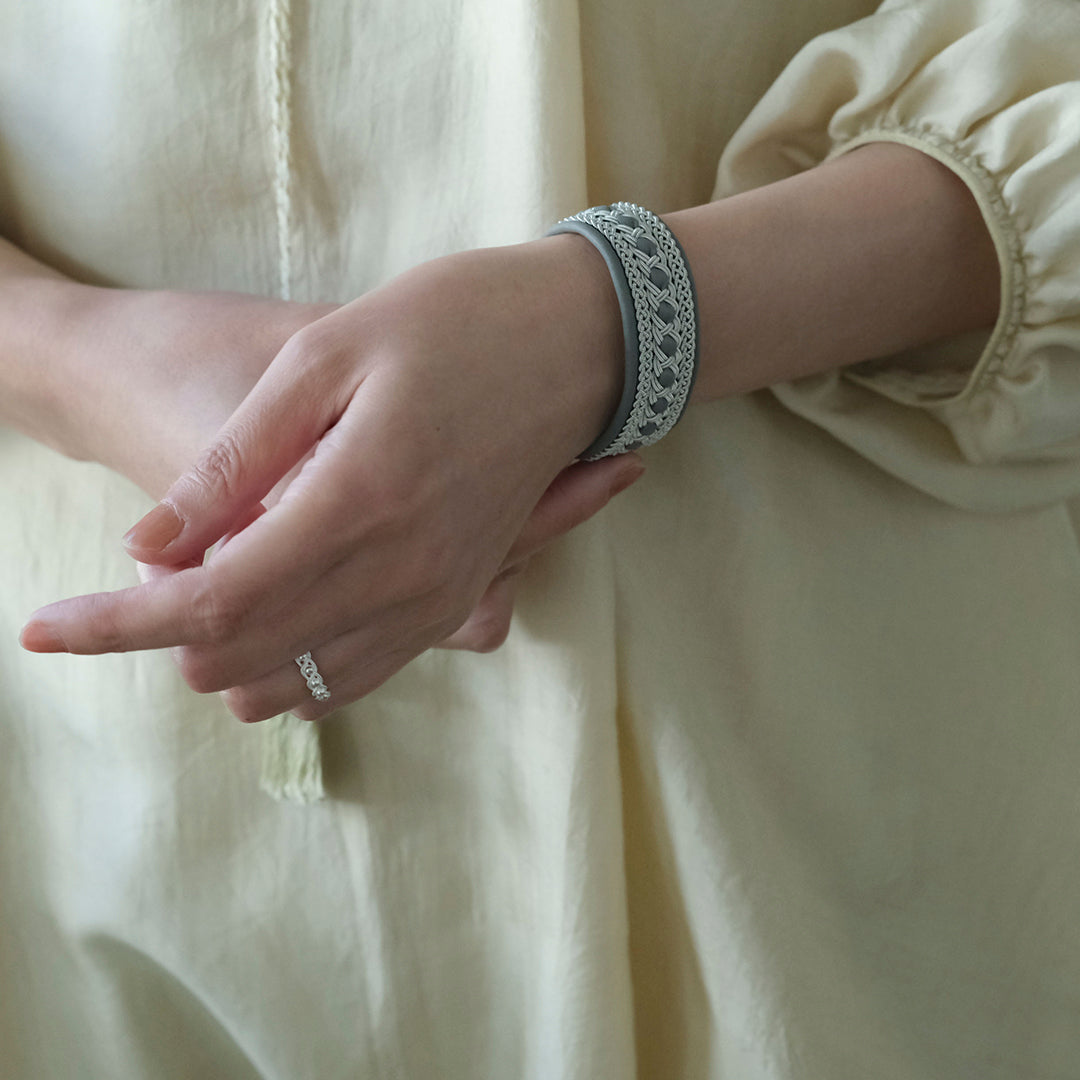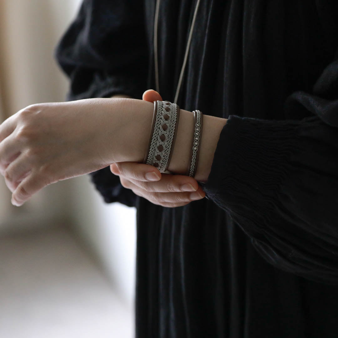 少し太めですが、革を中心に配することでピューターワイヤーが主張しすぎない、女性らしい落ち着きを感じます。