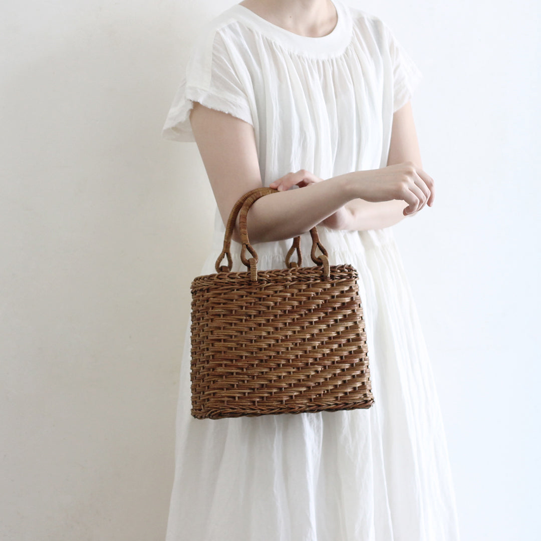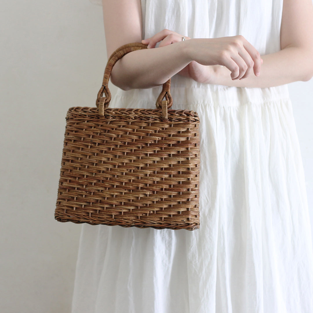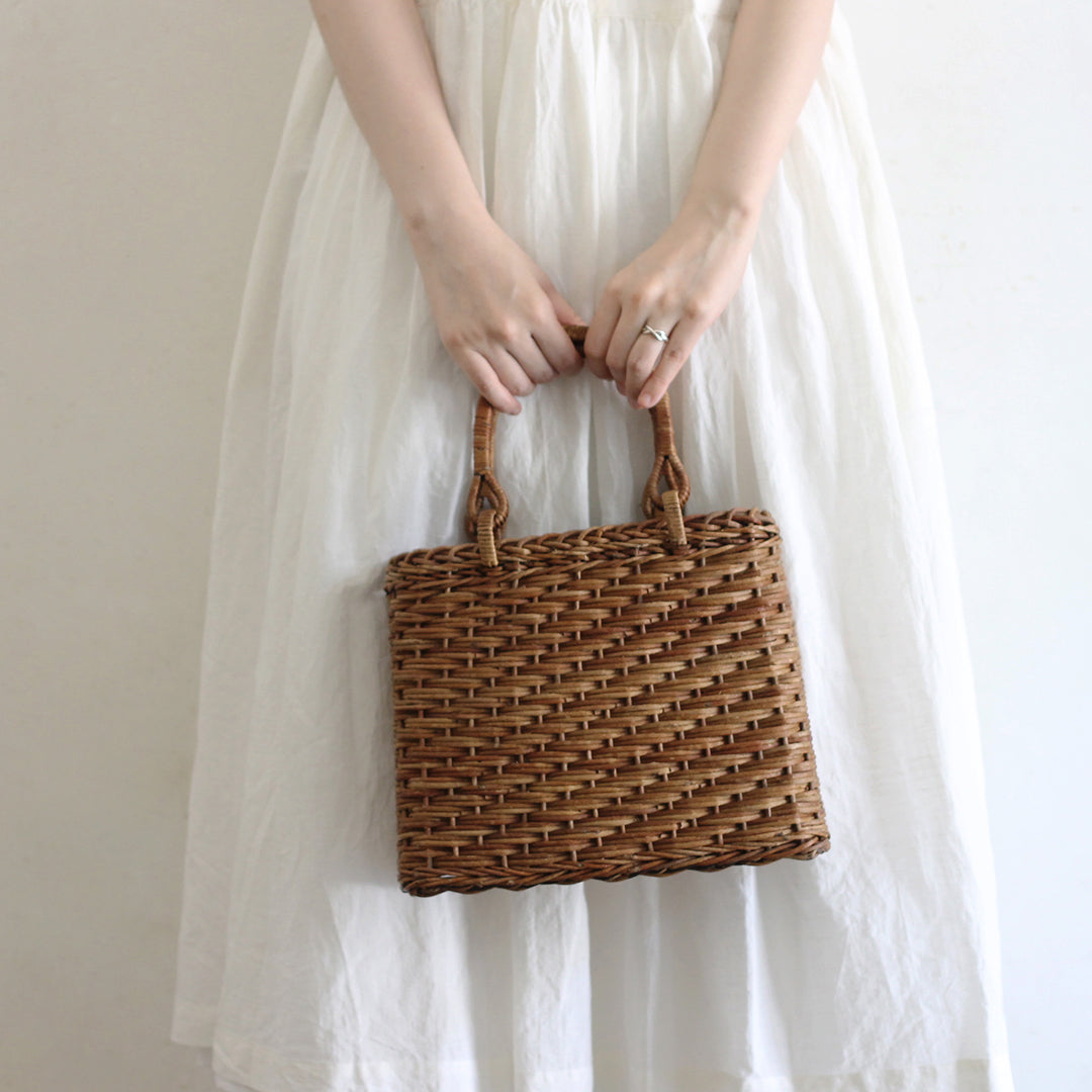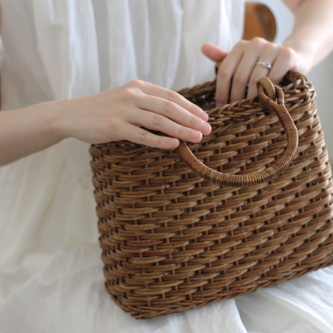 「駒型ホラ編み 中」はシンプルなスクエア型のハンドバッグサイズ。季節を選ばず使いやすいかごです。