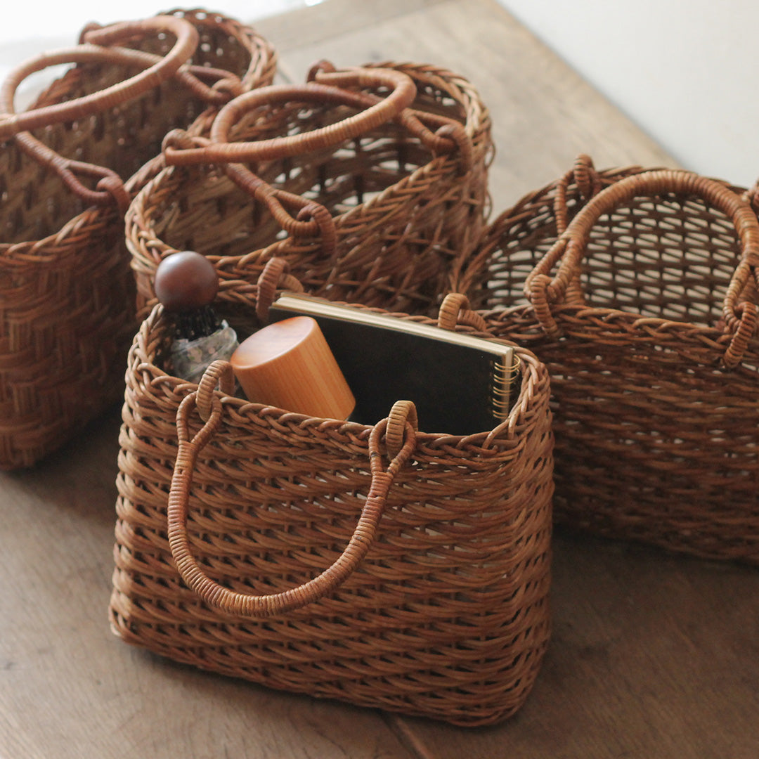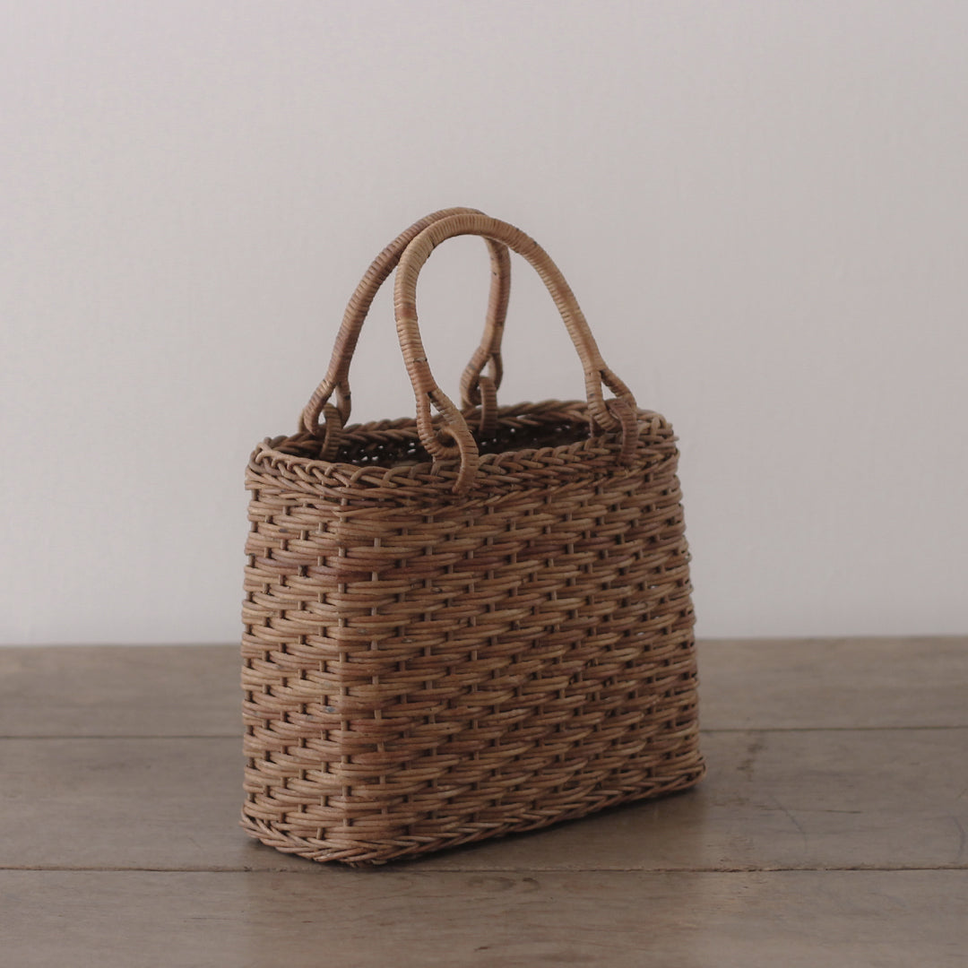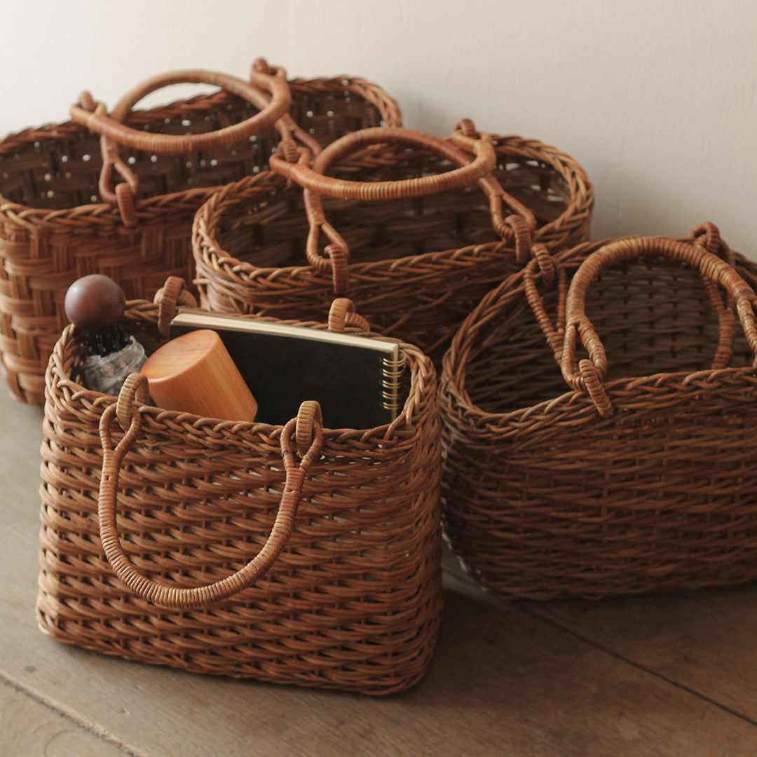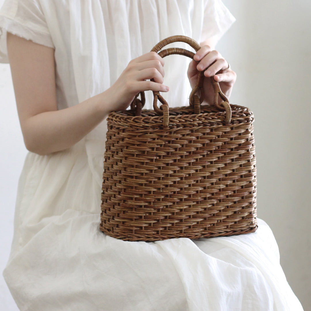 「駒型ホラ編み 中」はシンプルなスクエア型のハンドバッグサイズ。季節を選ばず使いやすいかごです。