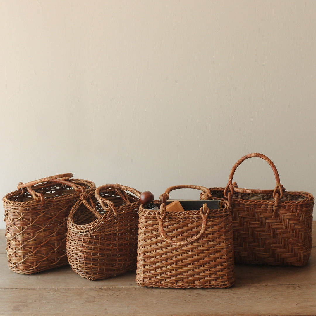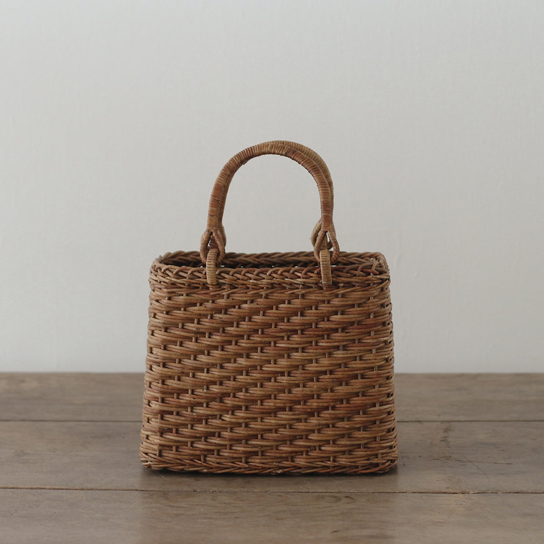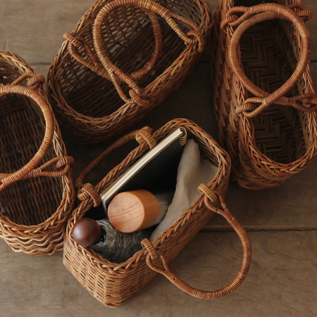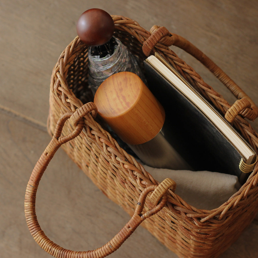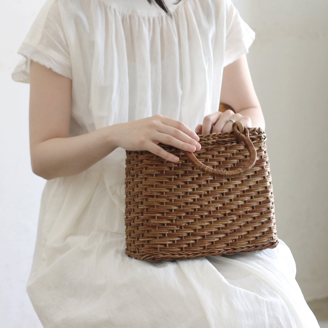 「駒型ホラ編み 中」はシンプルなスクエア型のハンドバッグサイズ。季節を選ばず使いやすいかごです。