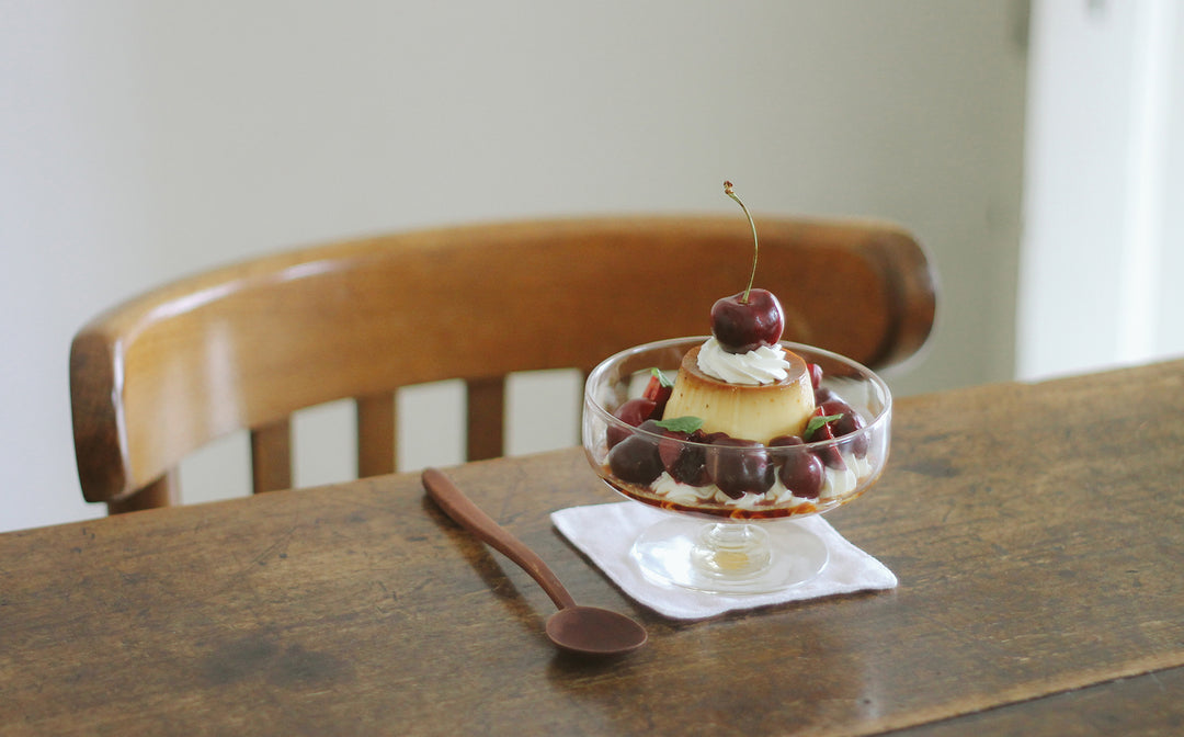 プリンをイメージした「ashitsuki dessert glass short」は、プリンが美しく映えるようボウル部分の立ち上がりを低めに、まわりにフルーツを飾っても楽しめるサイズ感にしました。