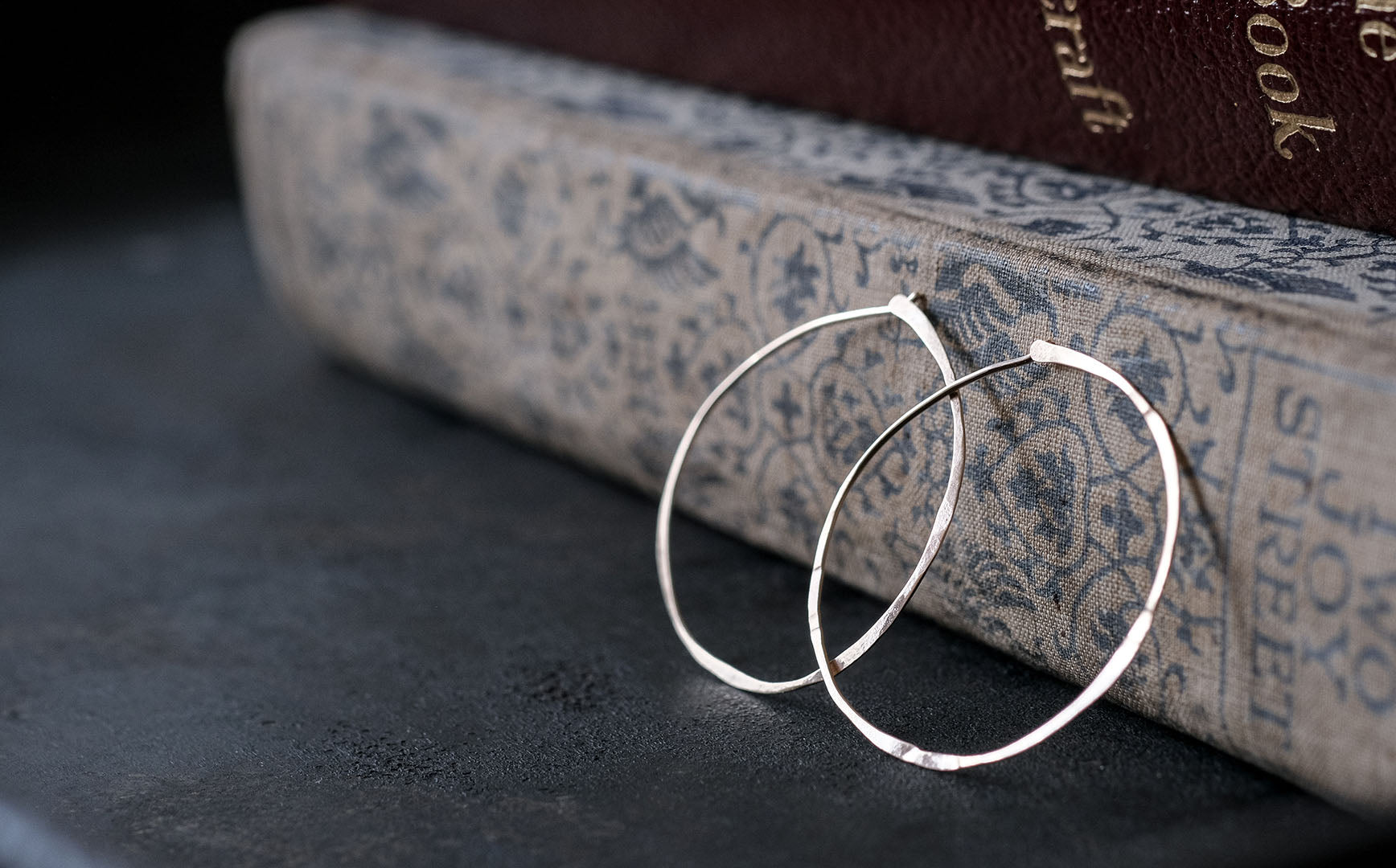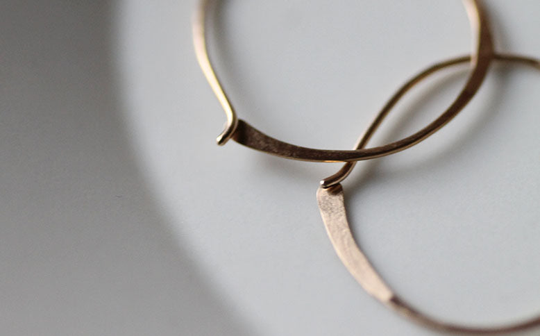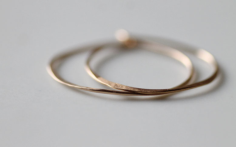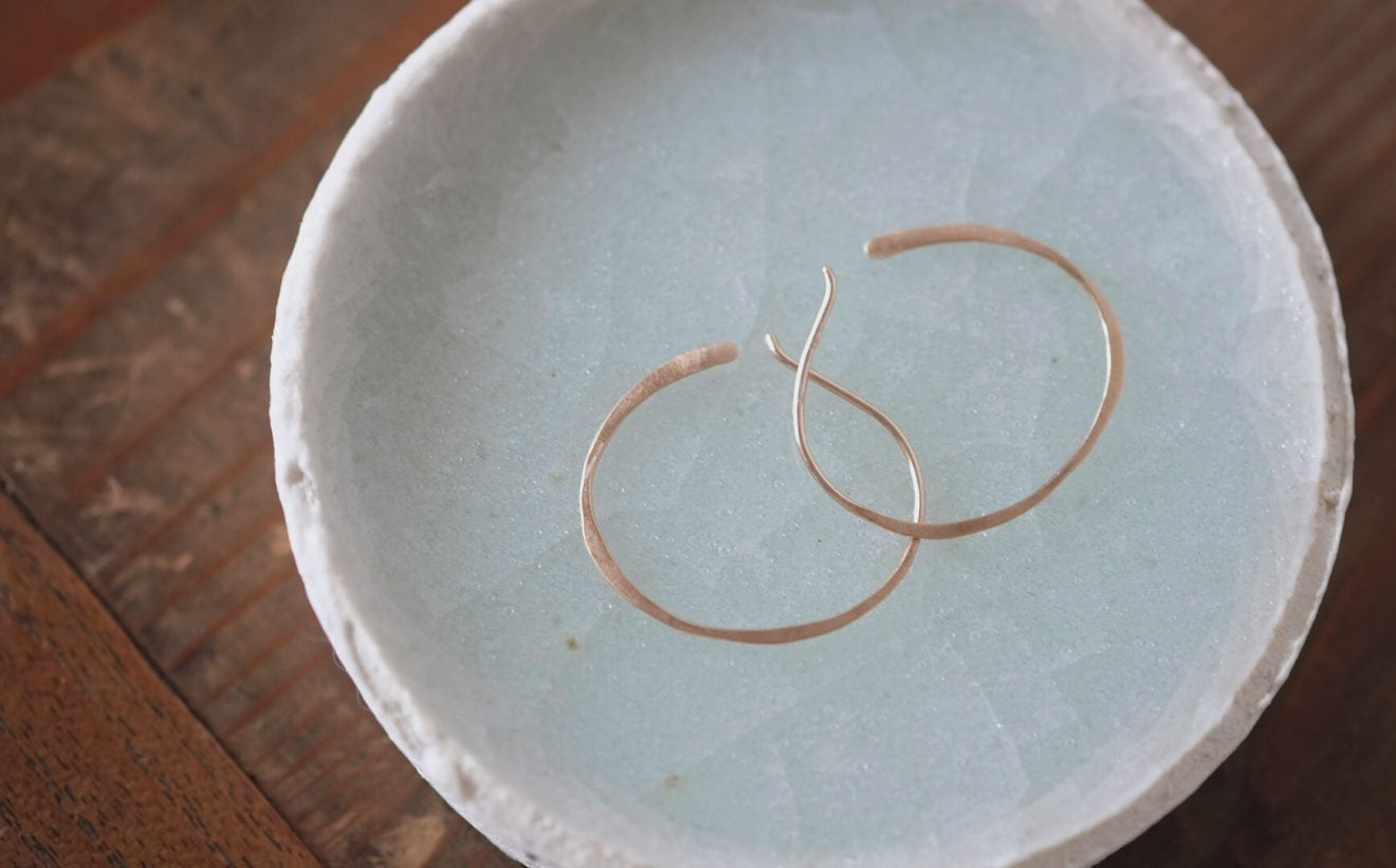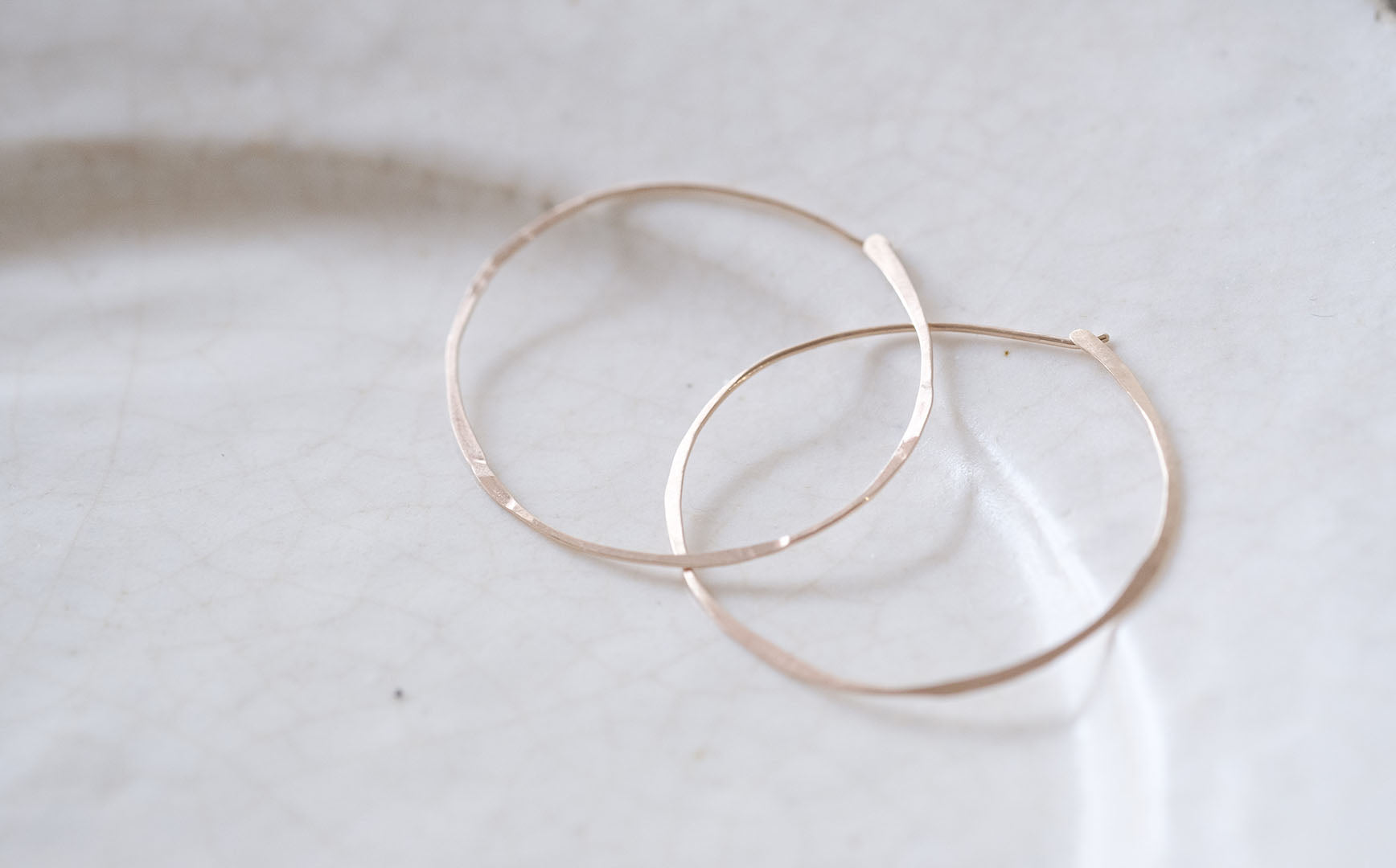 10金で輪っかをつくり、トントントンと金槌で槌目を残しながら形づくられた耳飾り。いく重にも重なる波模様のようなゆらぎがあります。