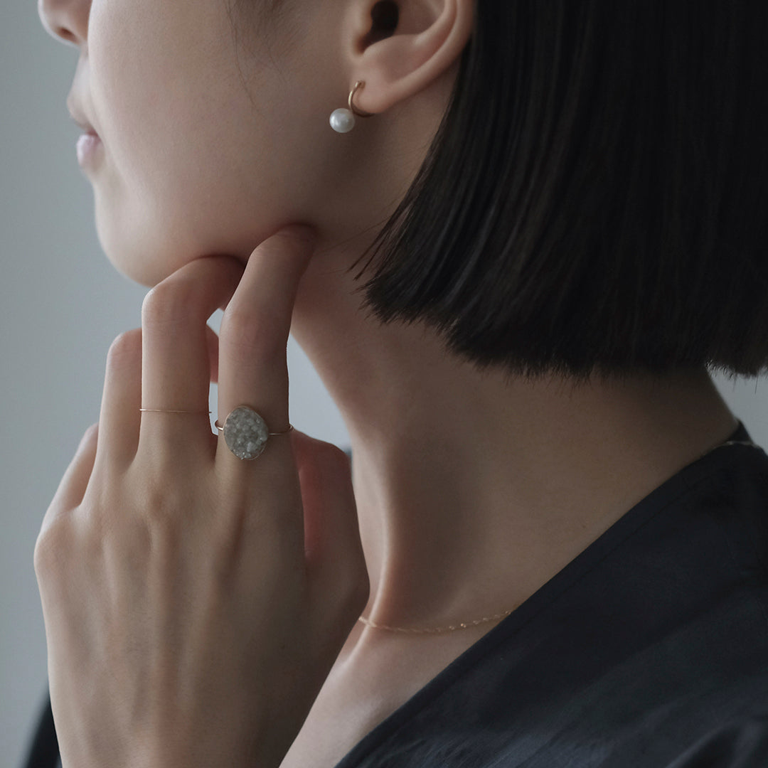 「自然の風景」を想い描きながらジュエリーをつくる、Atelier el。このシリーズでイメージしたのは、静寂の中、刻々と岩から染み出す澄んだ雫。光を受けてきらめく雫のように、パールが自然な輝きをみせます。