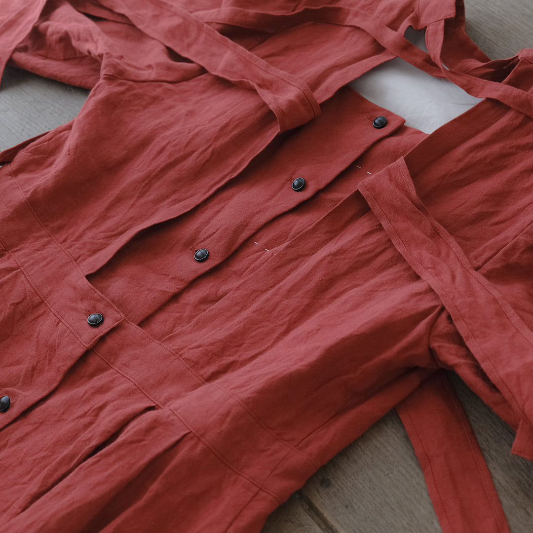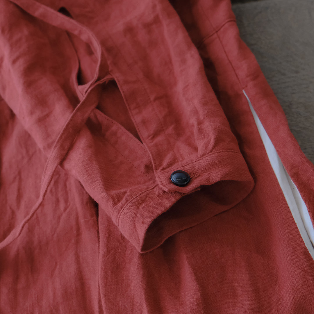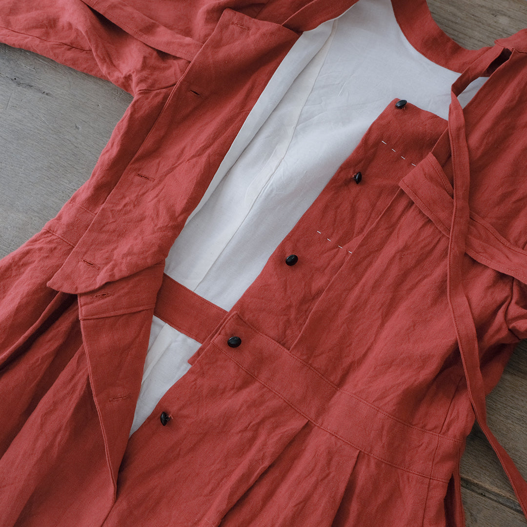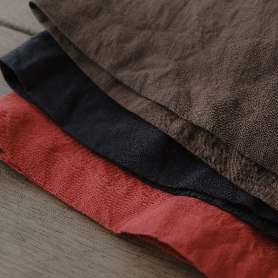 カラーは印象的な赤のアガット、ぬくもりのあるダークブラウンにシックなブラックの3色。程よい厚みのリネン生地にヴィンテージ加工を施した落ち着いた雰囲気のある生地を使用しています。ぽこぽことした糸ふしやネップの細やかな陰影は、何とも言えない趣のある表情をみせてくれます。