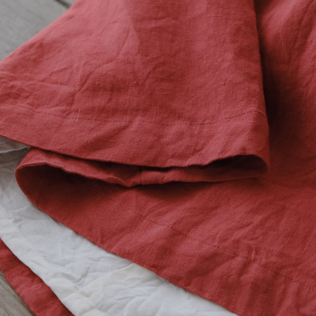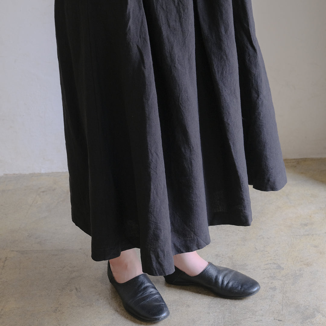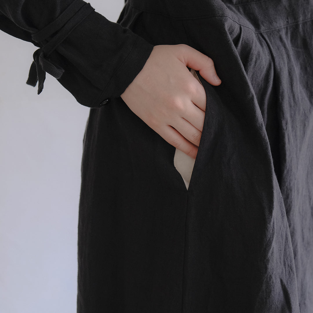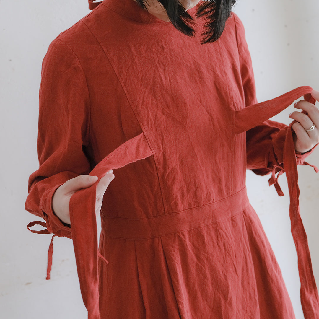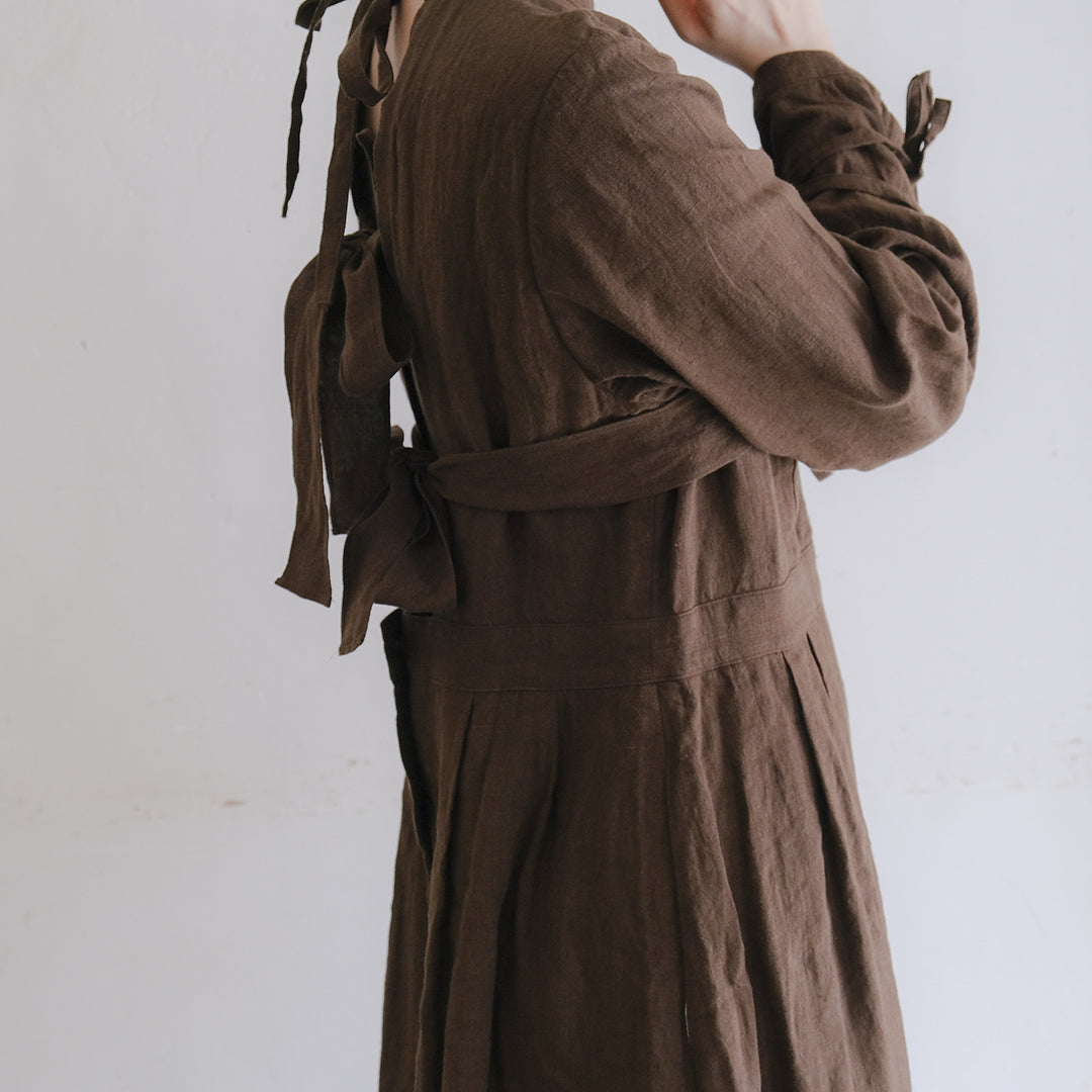 カラーは印象的な赤のアガット、ぬくもりのあるダークブラウンにシックなブラックの3色。程よい厚みのリネン生地にヴィンテージ加工を施した落ち着いた雰囲気のある生地を使用しています。ぽこぽことした糸ふしやネップの細やかな陰影は、何とも言えない趣のある表情をみせてくれます。