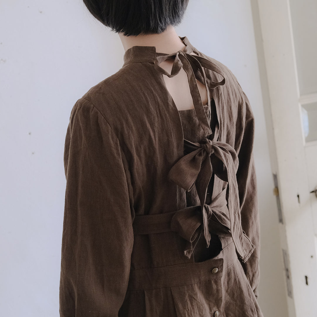 背中のボタンを留めて、後ろのリボンを結び、袖口のリボンを結ぶ。日頃忘れがちな、きちんと服を着る行為を思い出させる、そんな1着です。