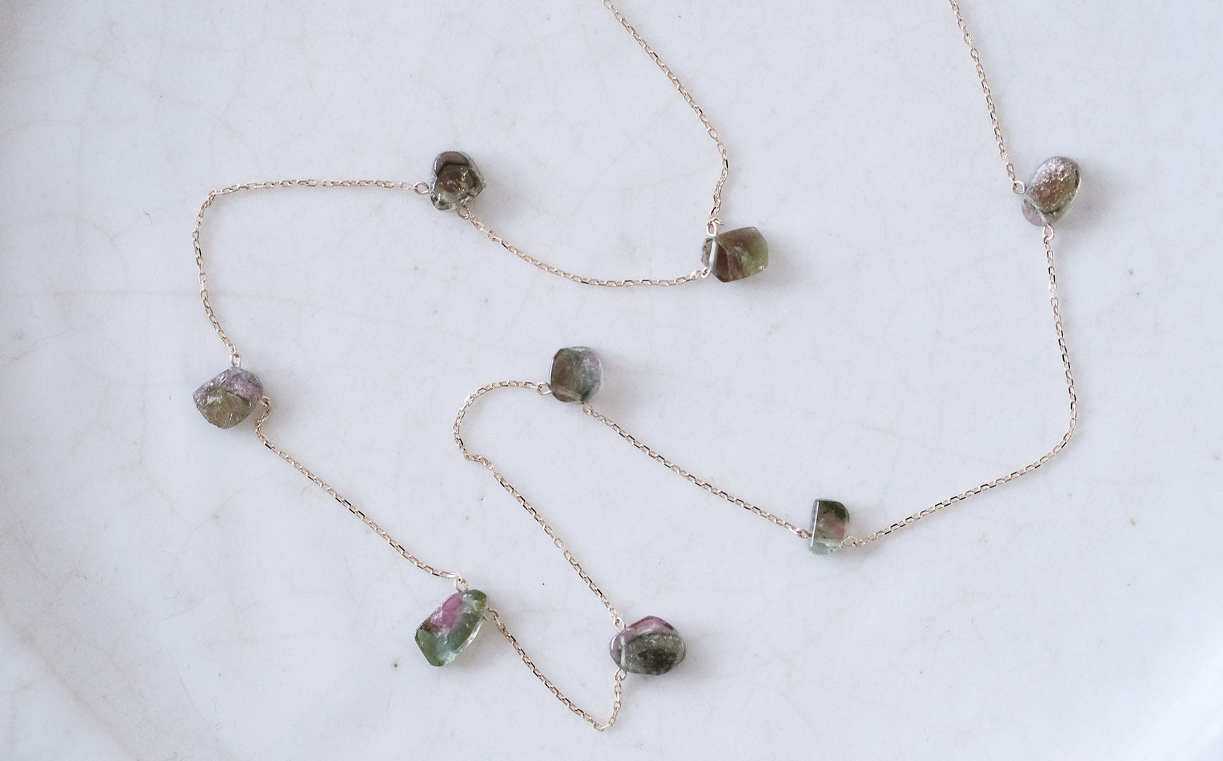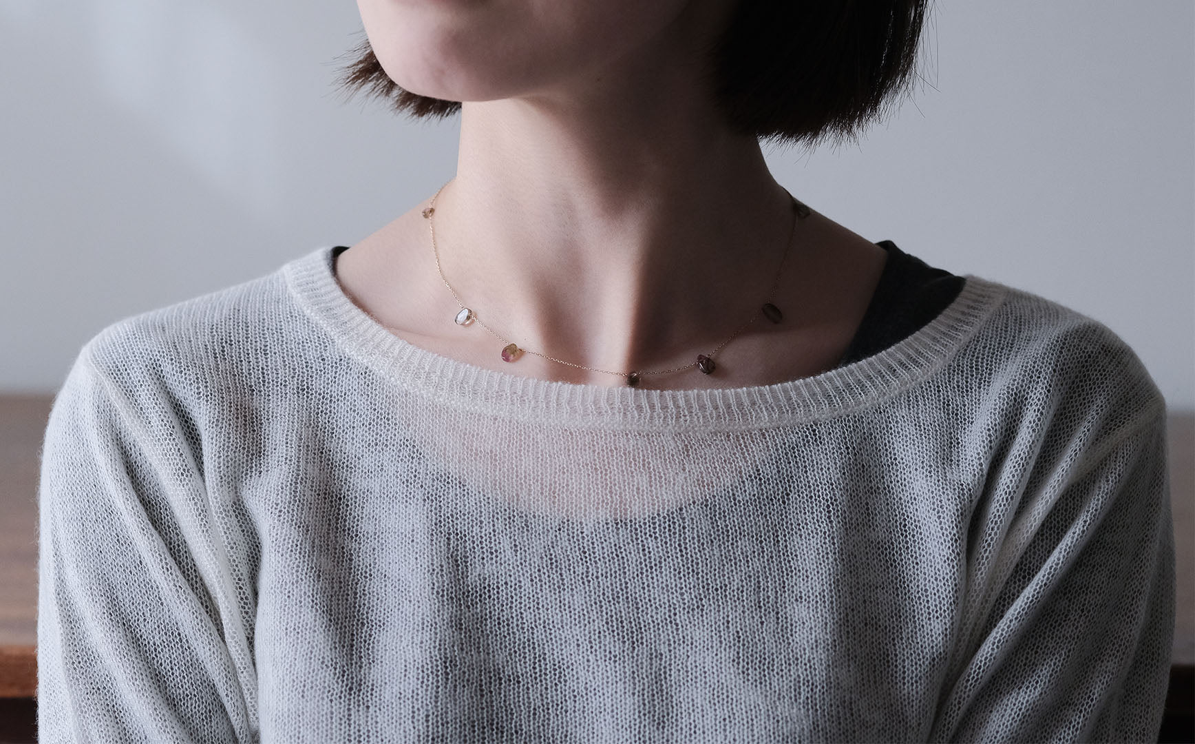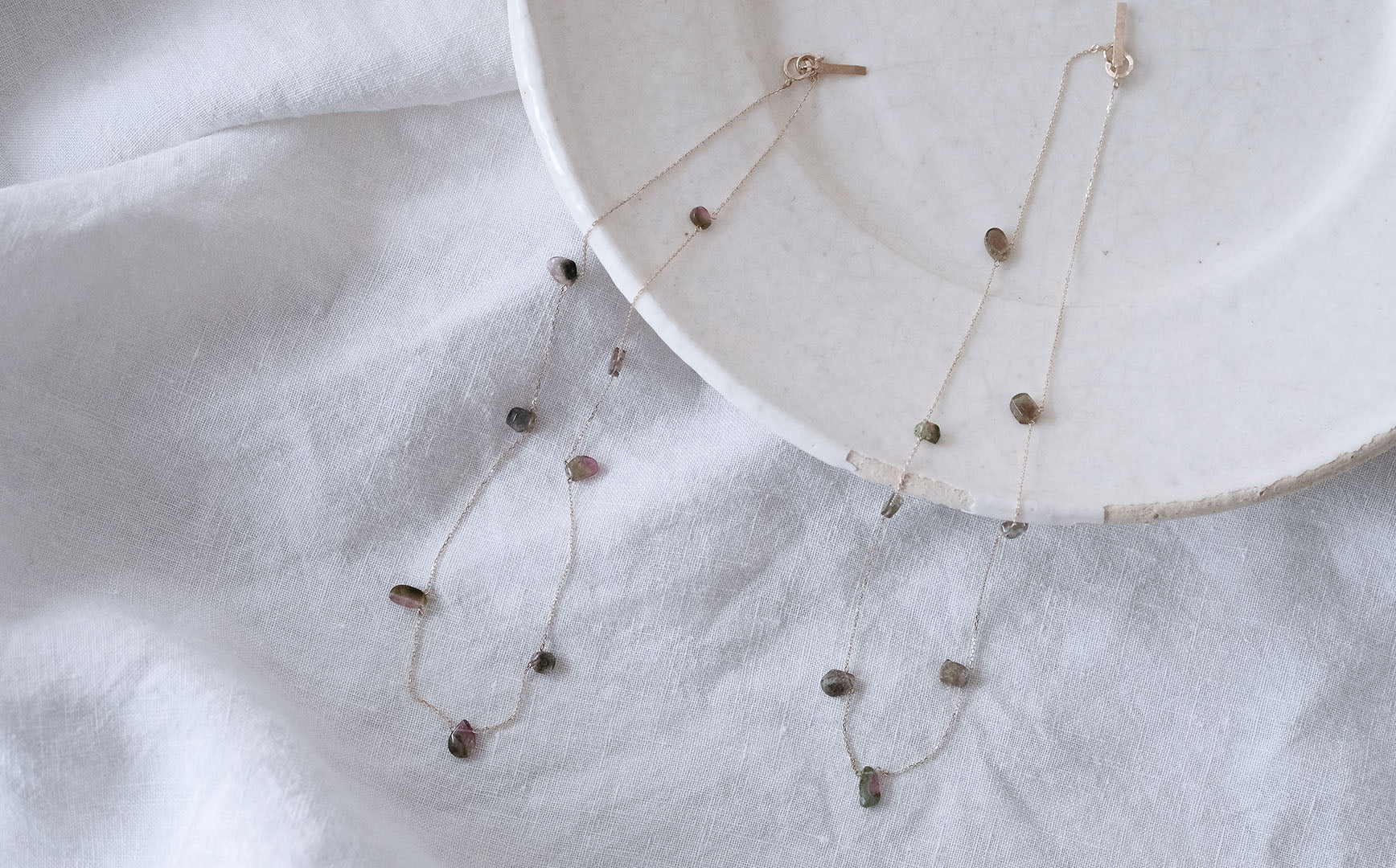 いくつものトルマリンが連なるネックレスは、普段着で過ごす一日でも、装いにプラスすると気持ちを高めてくれます。透明感のある輝きは一つとして同じものがなく光の加減でも表情を変えるので、いつまでも見飽きません。