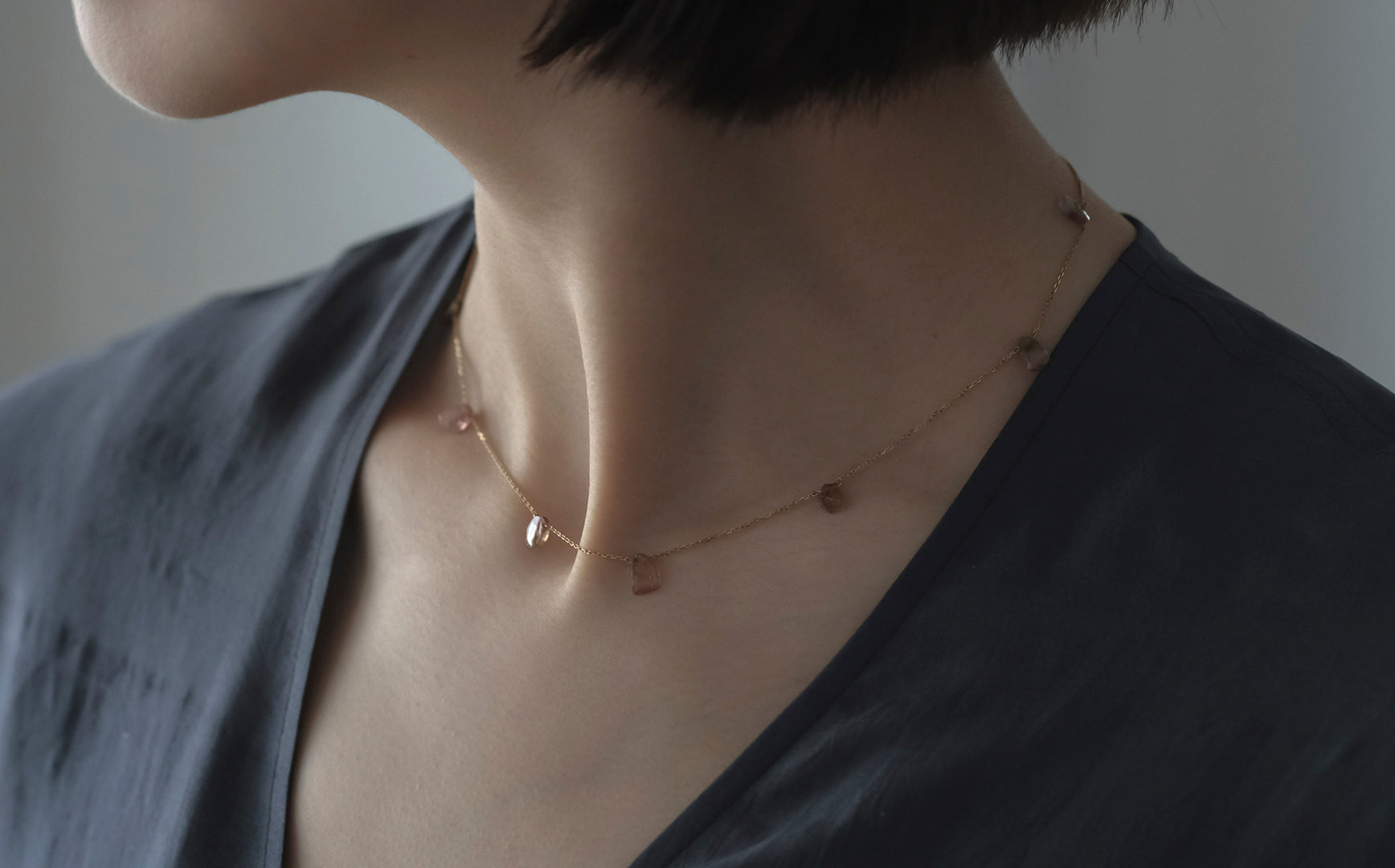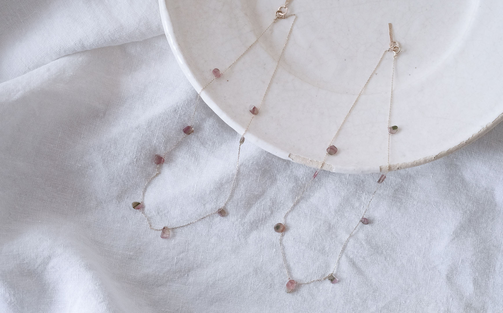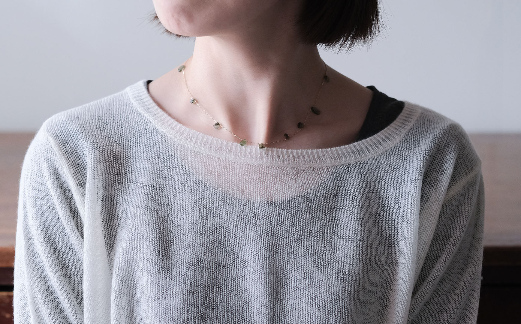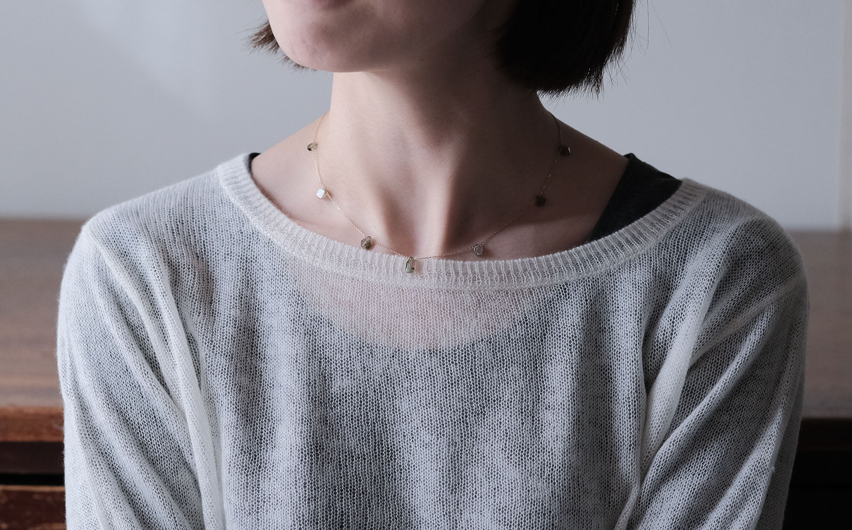 いくつものトルマリンが連なるネックレスは、普段着で過ごす一日でも、装いにプラスすると気持ちを高めてくれます。透明感のある輝きは一つとして同じものがなく光の加減でも表情を変えるので、いつまでも見飽きません。