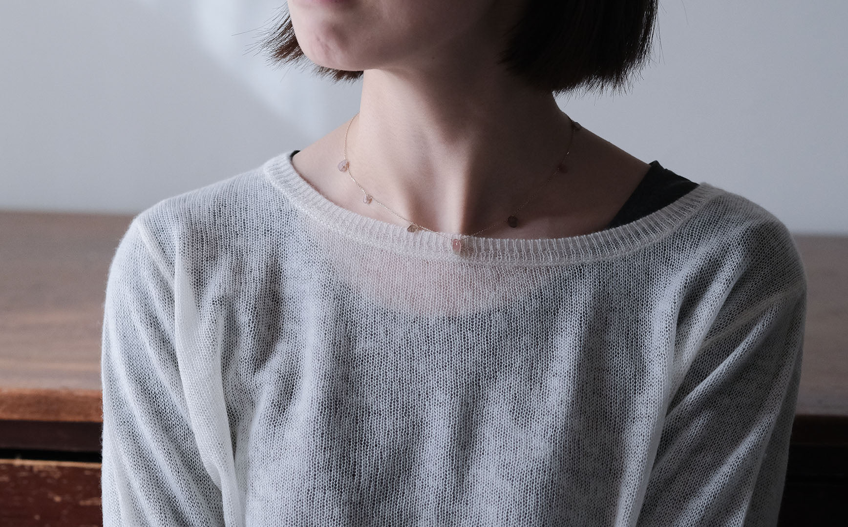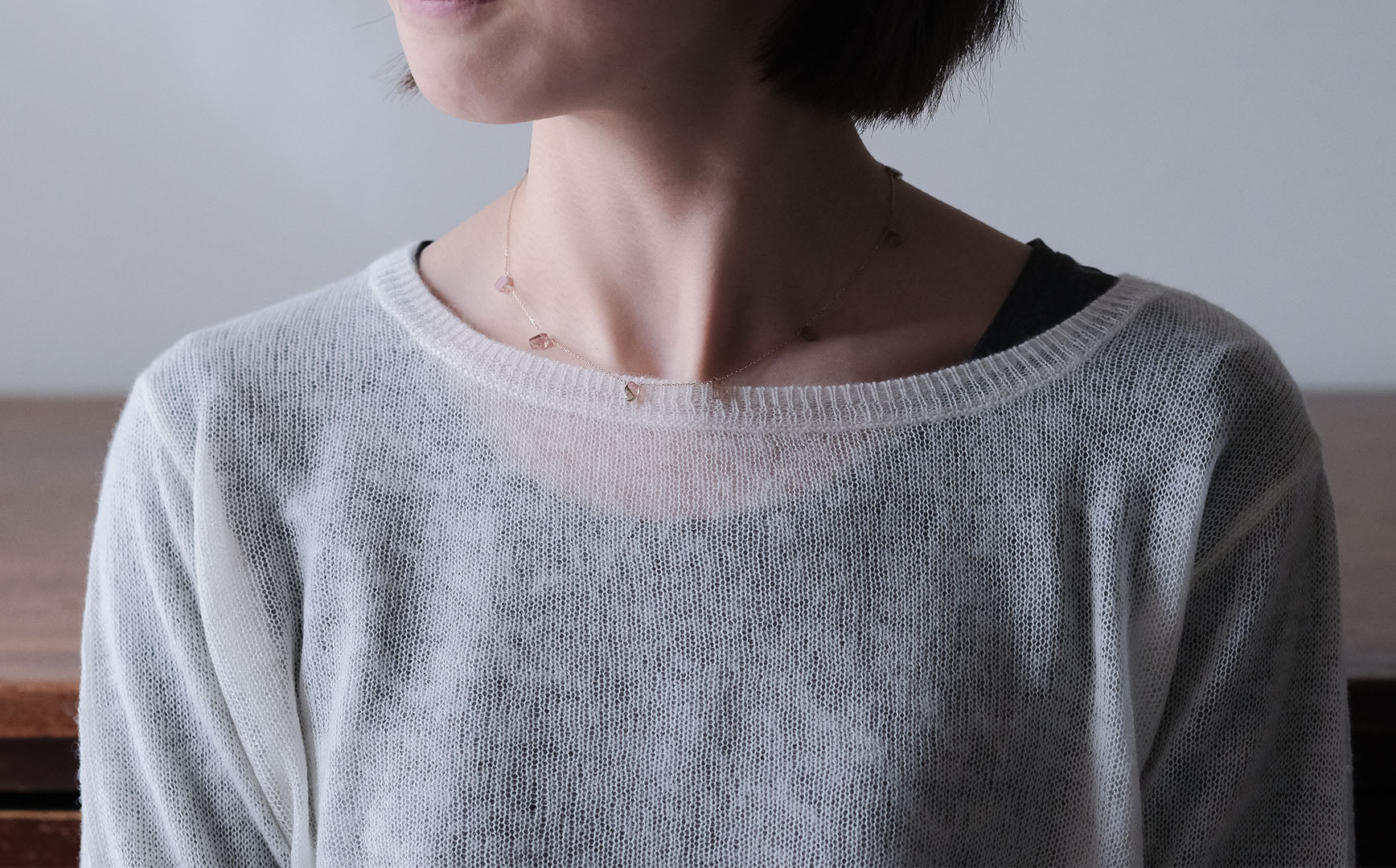 エルさんのジュエリーを見ていると、“身に着けた時に美しく見えるように”できていることをつくづく感じます。心地いいかたちは、肌に石をお守りとして宿らせているかのよう。