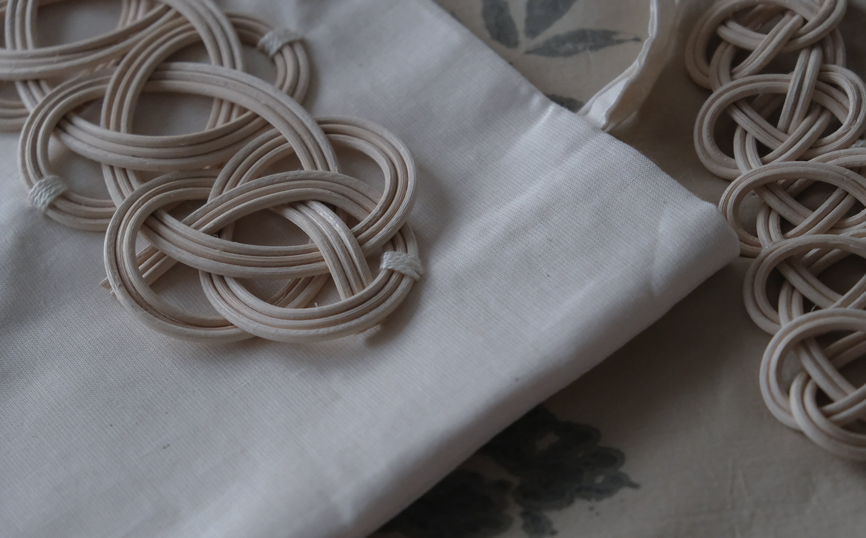 モチーフに使われている籐は東南アジアのもの。加工できるように水に浸けてふやかす下準備からはじまり、編み上げてから毛羽立ちを焼き、オイルで仕上げるまで。手間をかけながらひとつひとつつくられています。