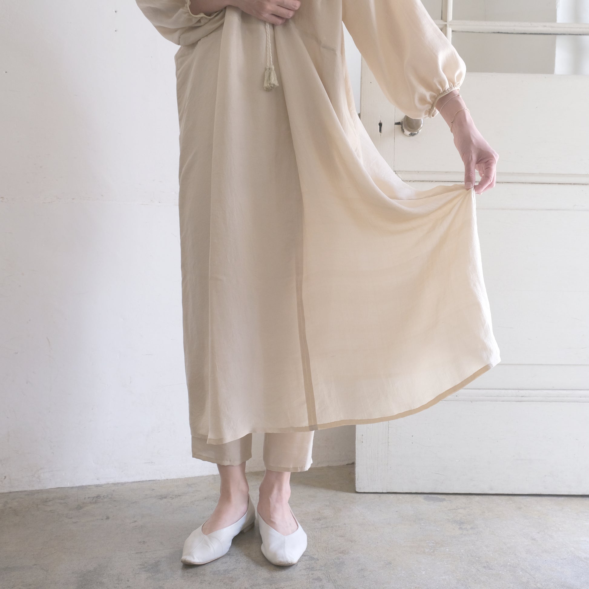 さらりとしたシルク素材の美しさを存分に味わうことができ、シルク100%の生地は薄く繊細。インドの手織りシルクのため、うっすらと織りの模様が見えるのが特徴です。少し透け感があるので、インナーをご着用ください。