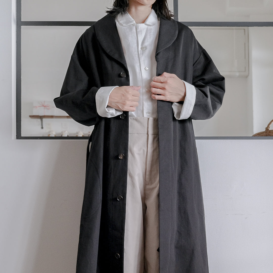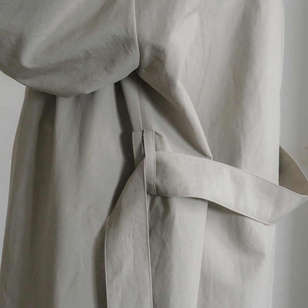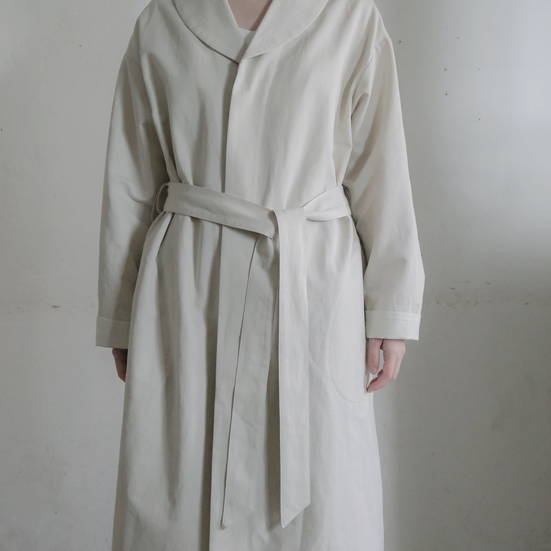 控えめな光沢感のある、kersey(カルゼ)と呼ばれるコットンリネン綾織の生地を使用した、軽い着心地のショールカラースリットコート。