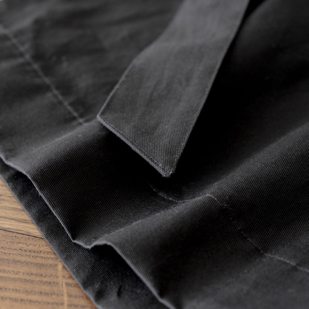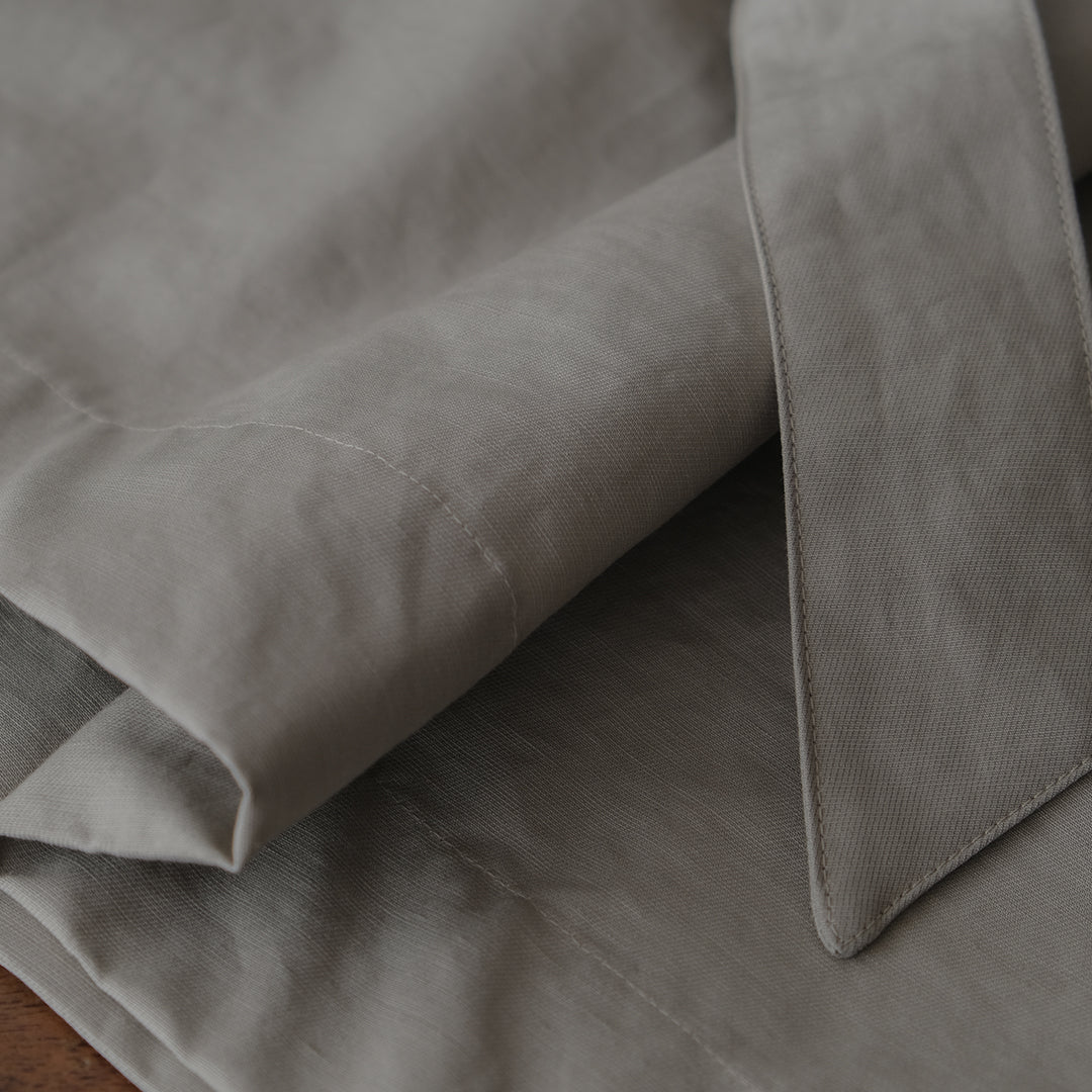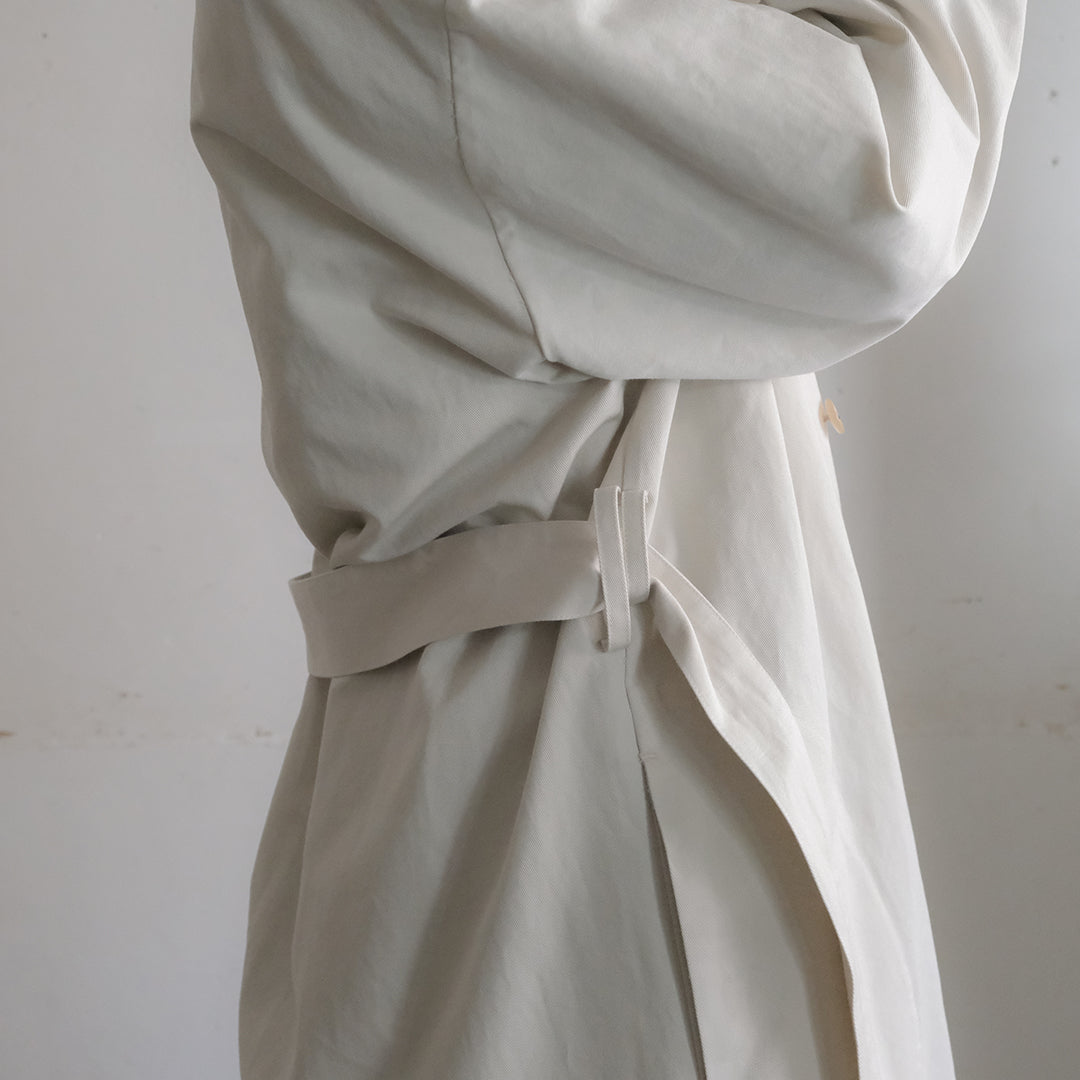 控えめな光沢感のある、kersey(カルゼ)と呼ばれるコットンリネン綾織の生地を使用した、軽い着心地のショールカラースリットコート。