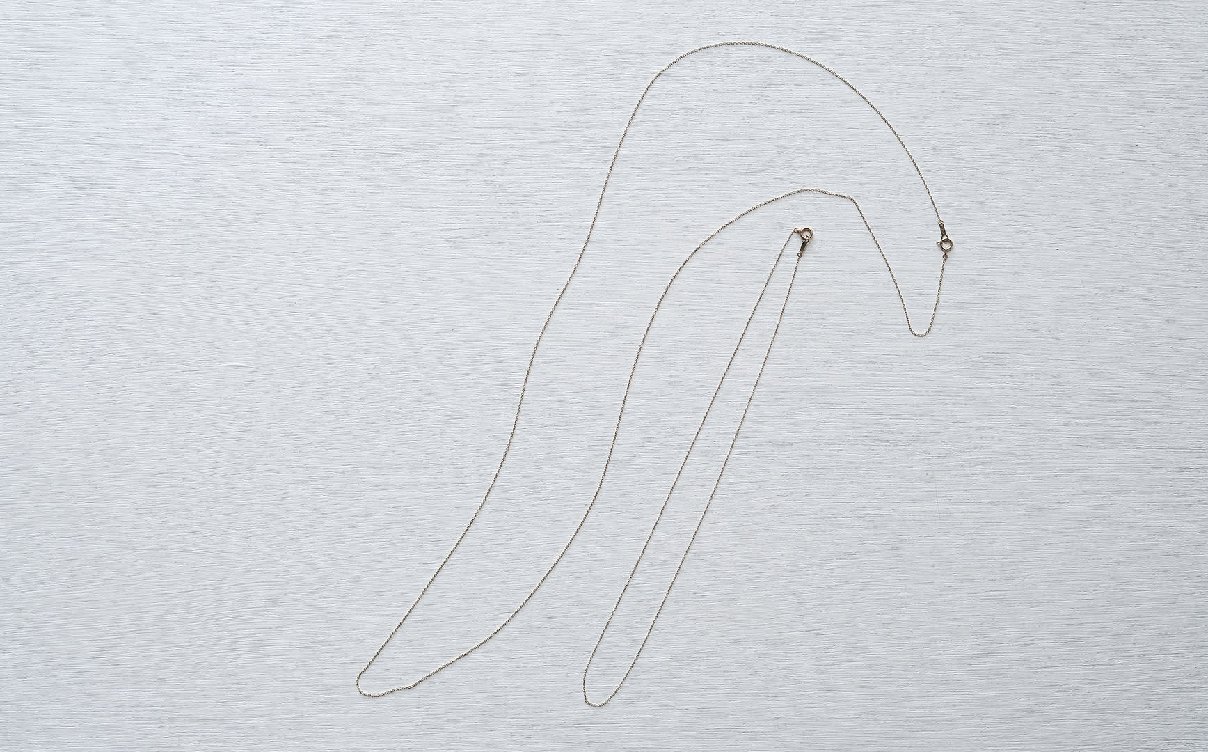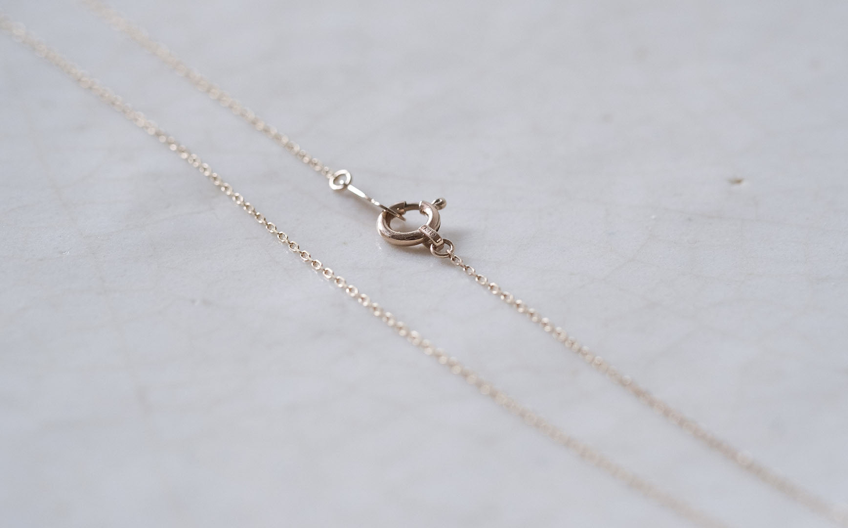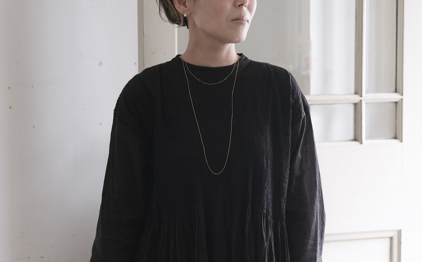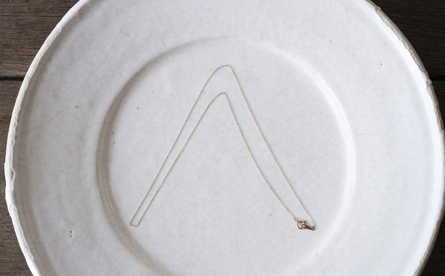 Atelier elにはチェーンシリーズがいくつかありますが、今回セレクトしたのはazukiという可愛らしい名前のもの。小豆のかたちをした輪が連なる様子は愛らしく、上品な輝きです。