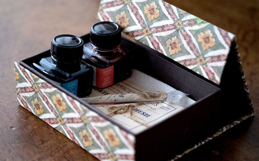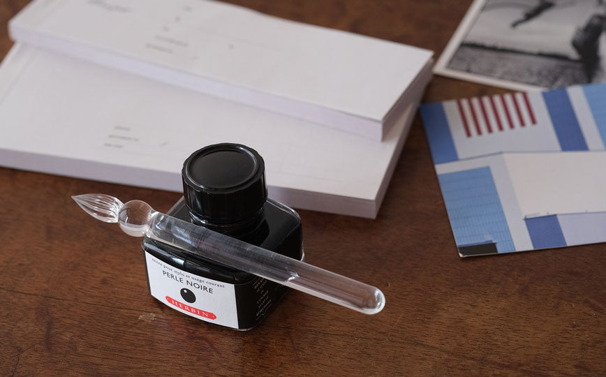 はじめに紙、インク、ガラスペン、水を入れたコップを用意します。次にガラスペンをインクのボトルに直接つけます。