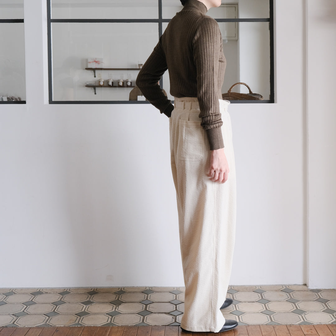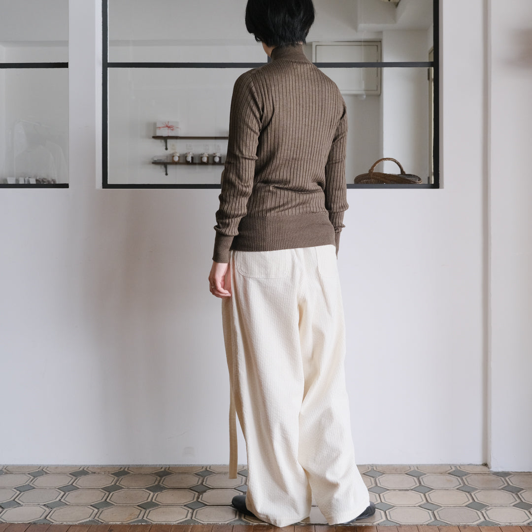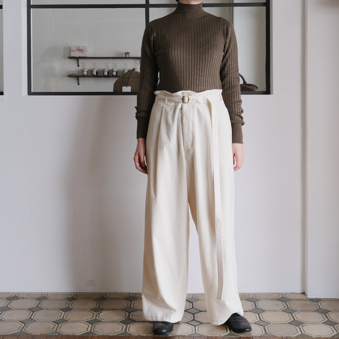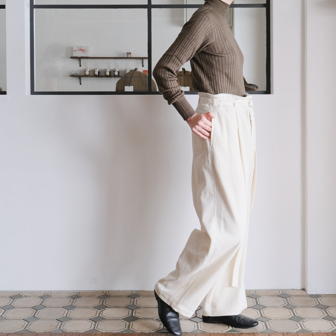 深い股上でウエストを絞って穿くタピールパンツ。長くとったウエスト紐でさりげないポイントをつくられたアイテムです。