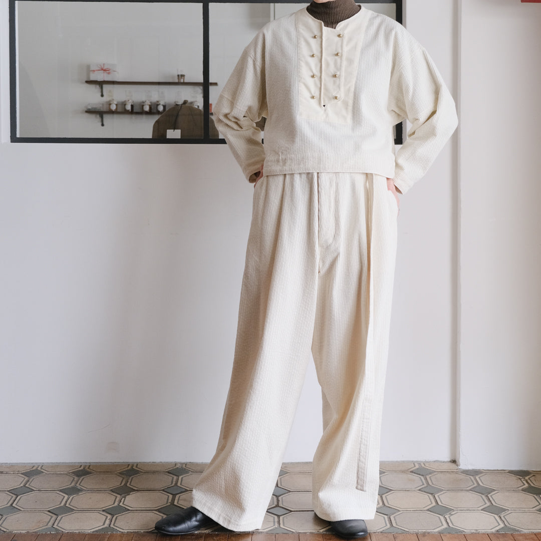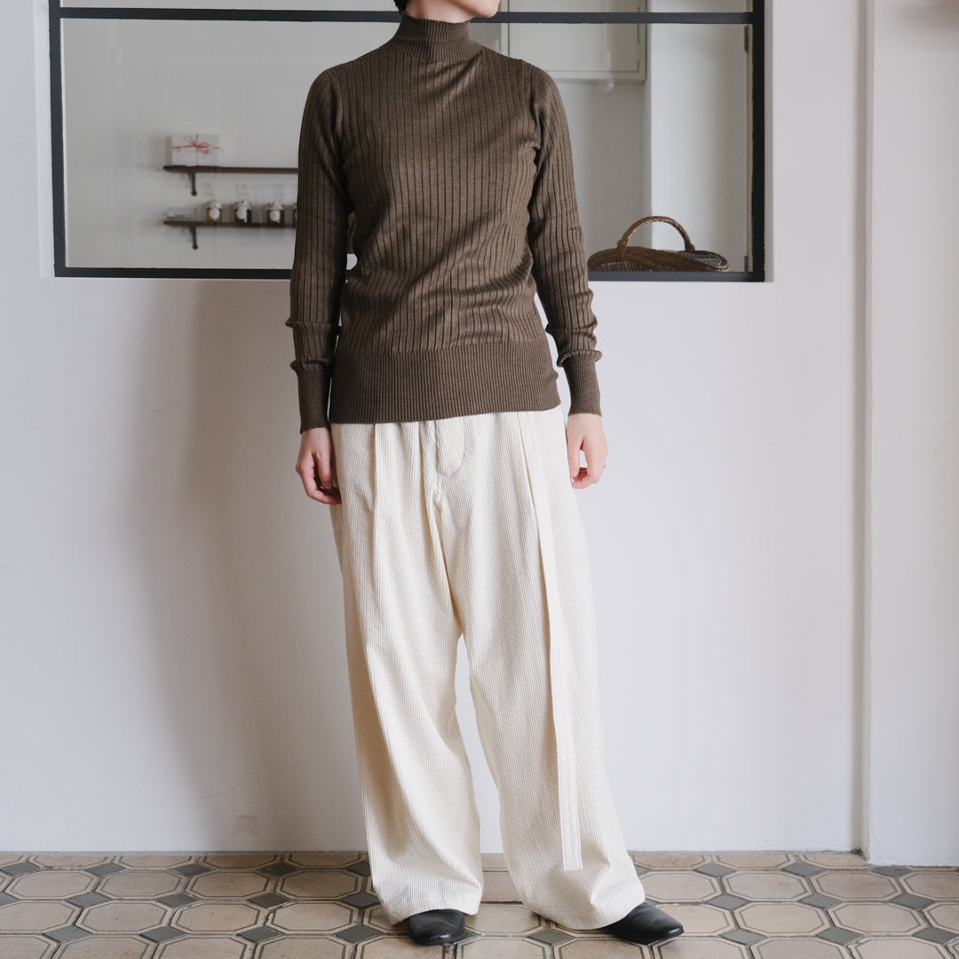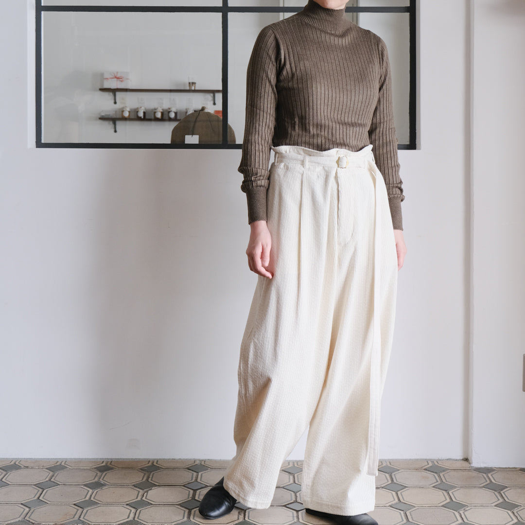 深い股上でウエストを絞って穿くタピールパンツ。長くとったウエスト紐でさりげないポイントをつくられたアイテムです。