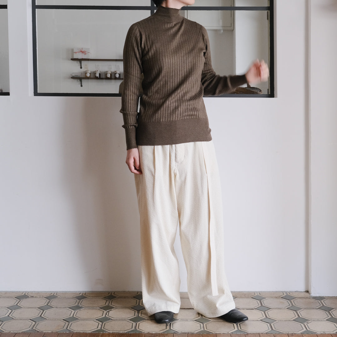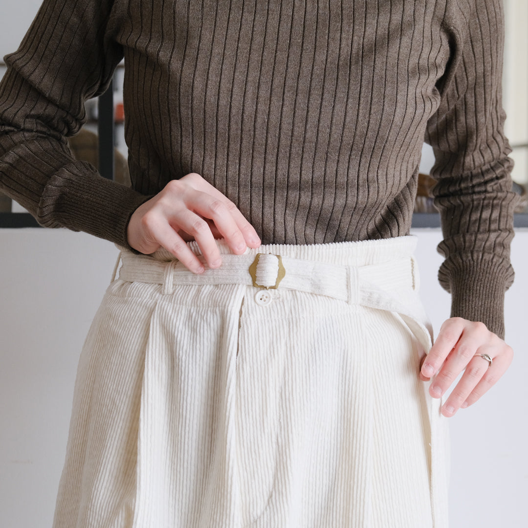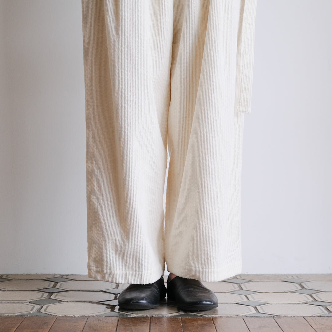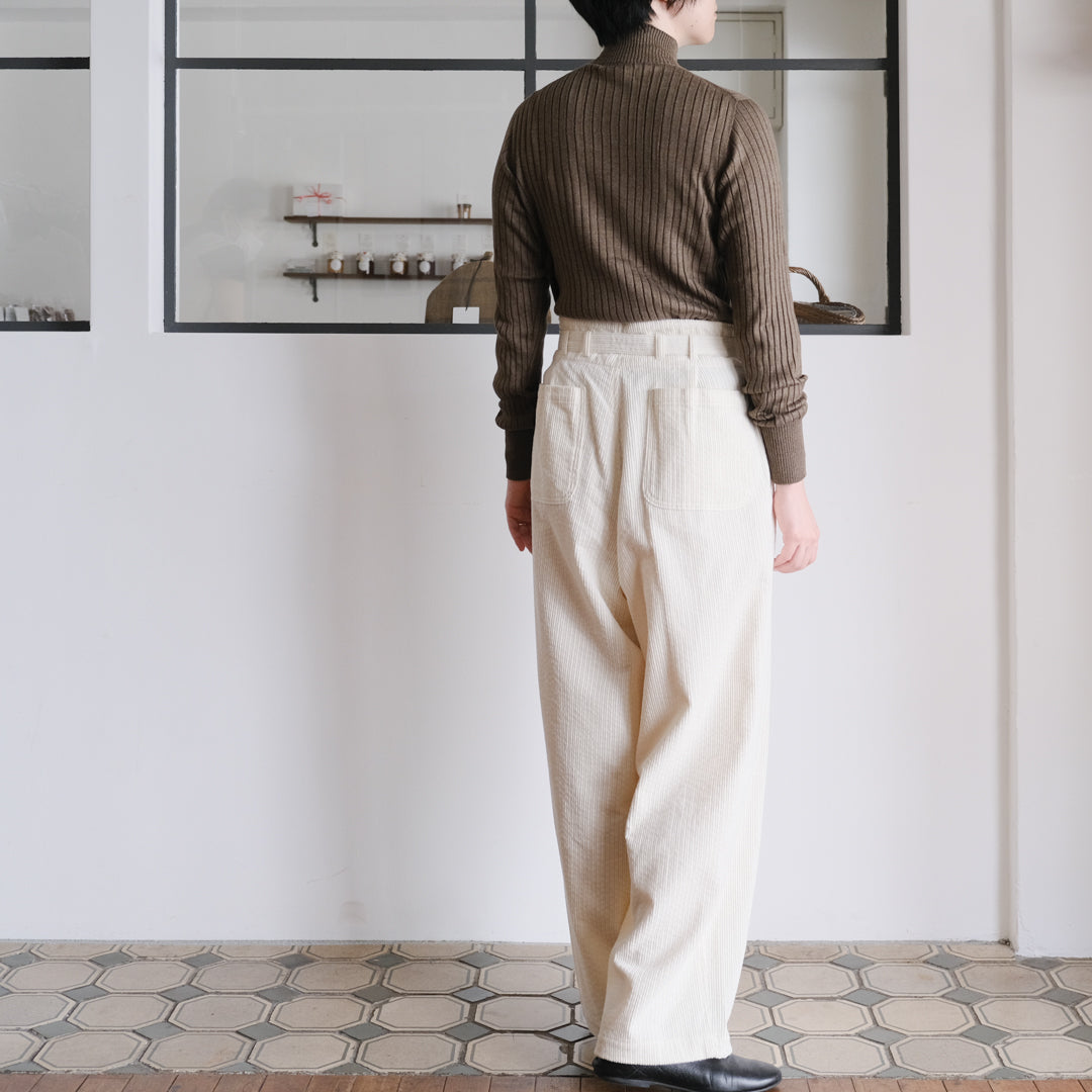 深い股上でウエストを絞って穿くタピールパンツ。長くとったウエスト紐でさりげないポイントをつくられたアイテムです。