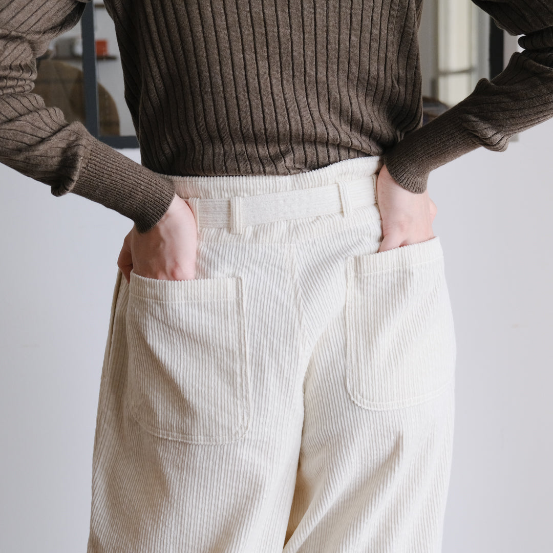 「日々の旅」をコンセプトに服をつくるSUSURI(ススリ)。やわらかな印象のコーディロイ生地でつくられた、裾にかけてまとまりのあるシルエットが特徴のタピールパンツをご紹介します。