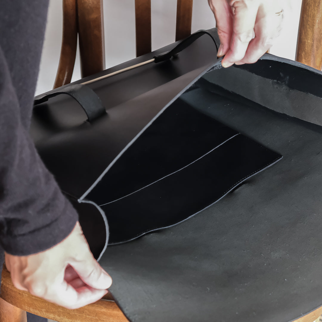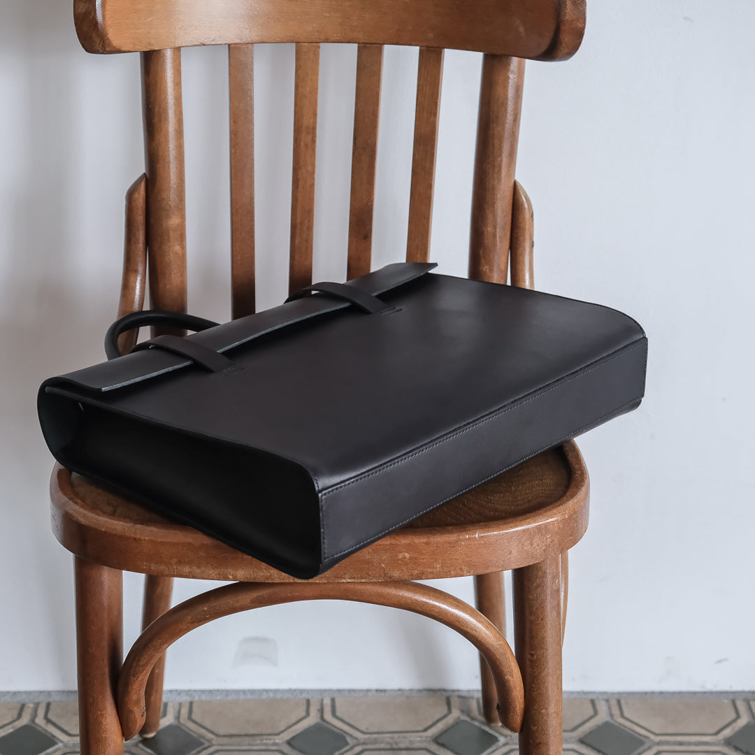 このSCORE BAGは、かつてイギリスで音楽学校の学生が楽譜を運ぶのに使われていたバッグからインスピレーションを得てつくられています。凛とした印象のバッグは性別を問わず使っていただけます。大きさはMacbook Pro 13inchが収まるサイズで、PCを持ち歩く方にもおすすめ。ビジネスバッグのようなフォルムでもあるので、普段からお仕事まで幅広いシーンで使っていただけるデザインと実用性を併せ持ちます。