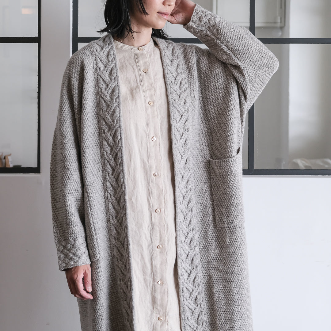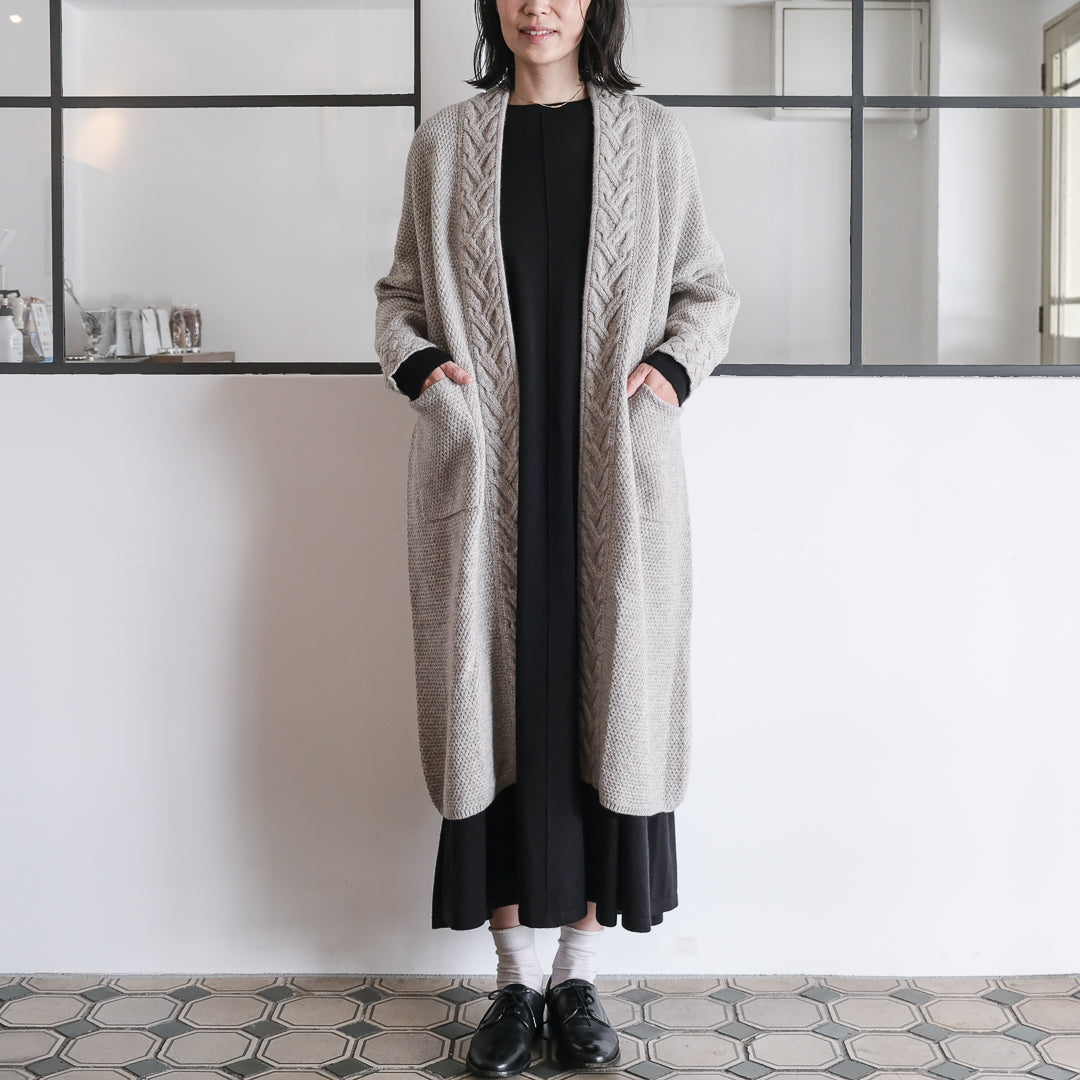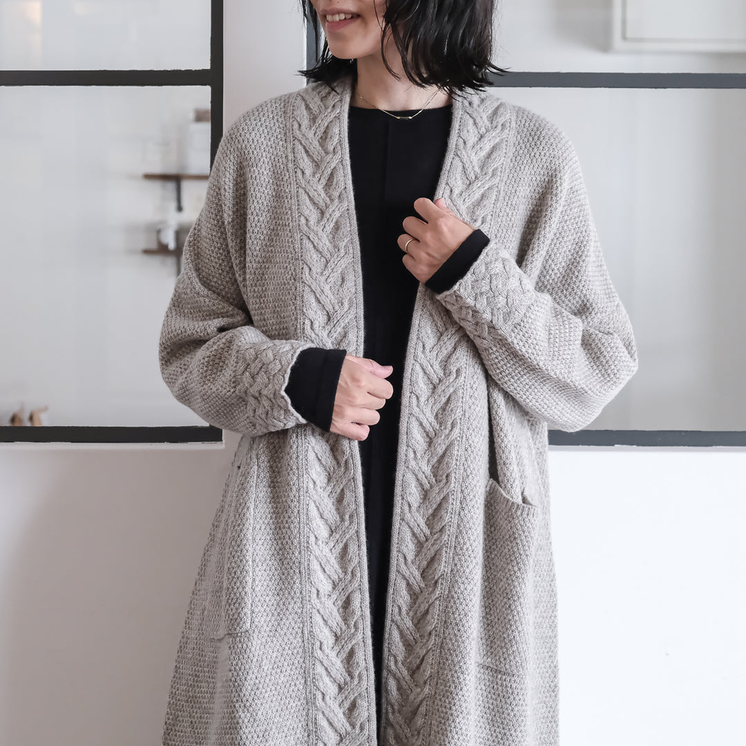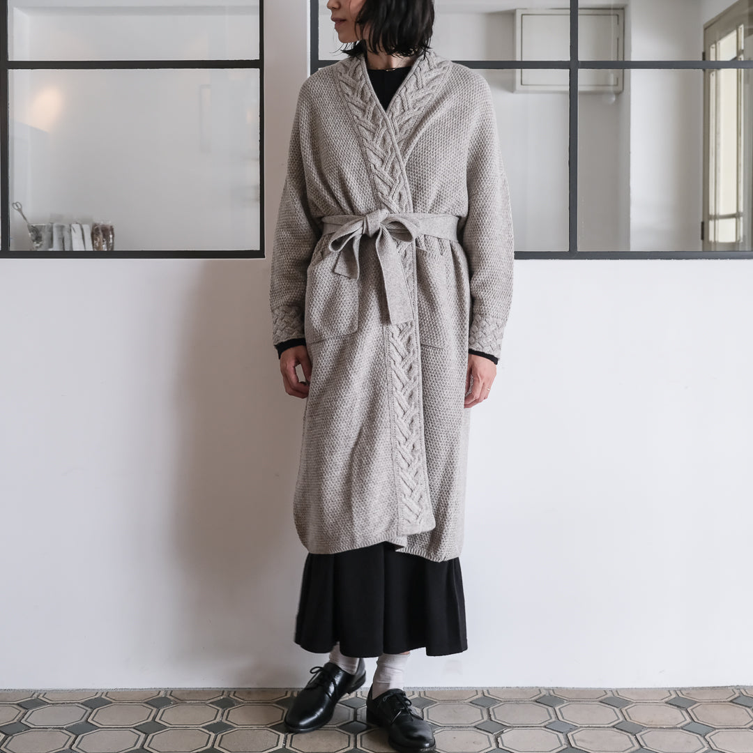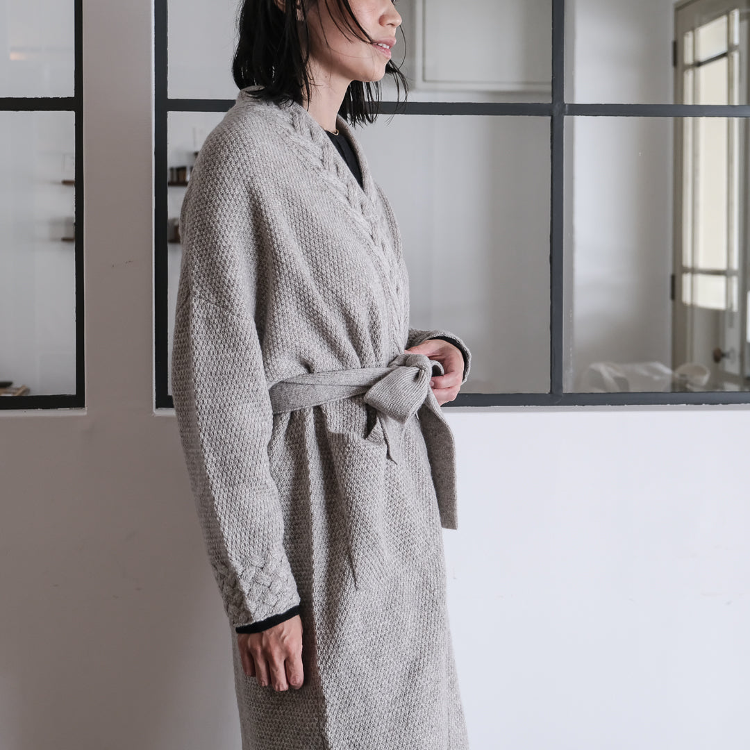 美しいアラン編みを襟ぐりと袖に配した贅沢なローブコート。アラン編みのあたたかな雰囲気と、ローブ型だから叶うすらっと縦長な印象のどちらも併せ持ちます。