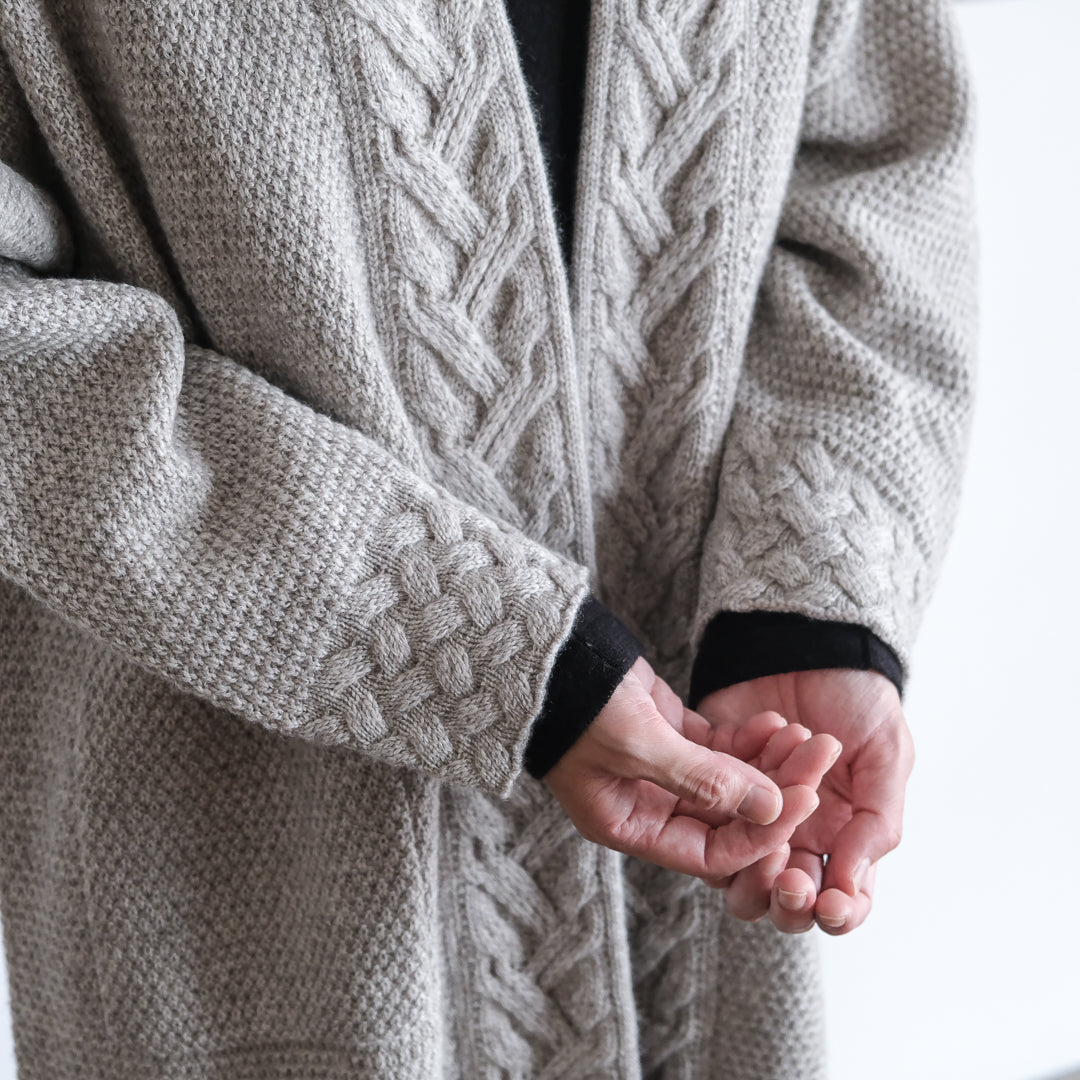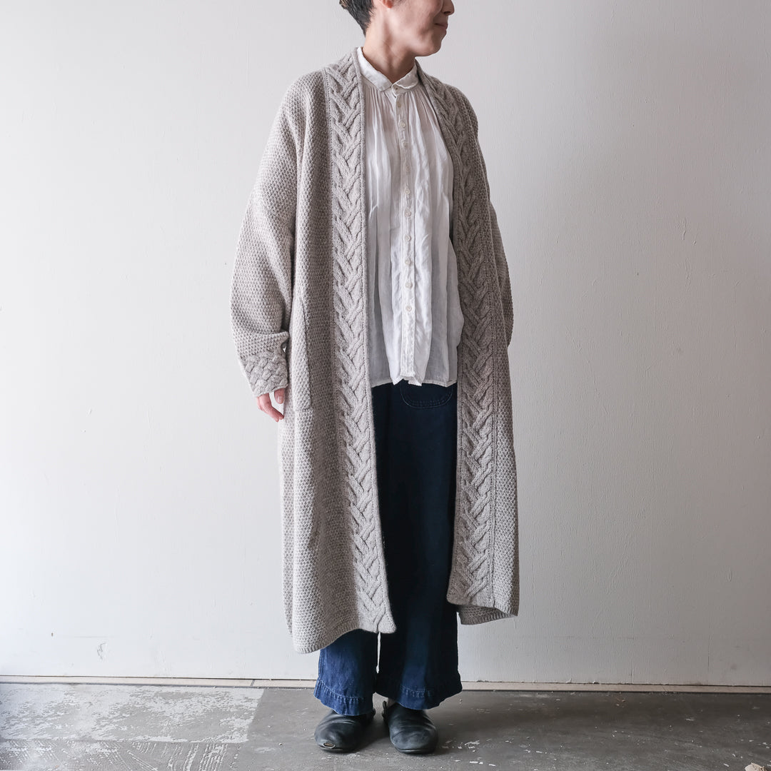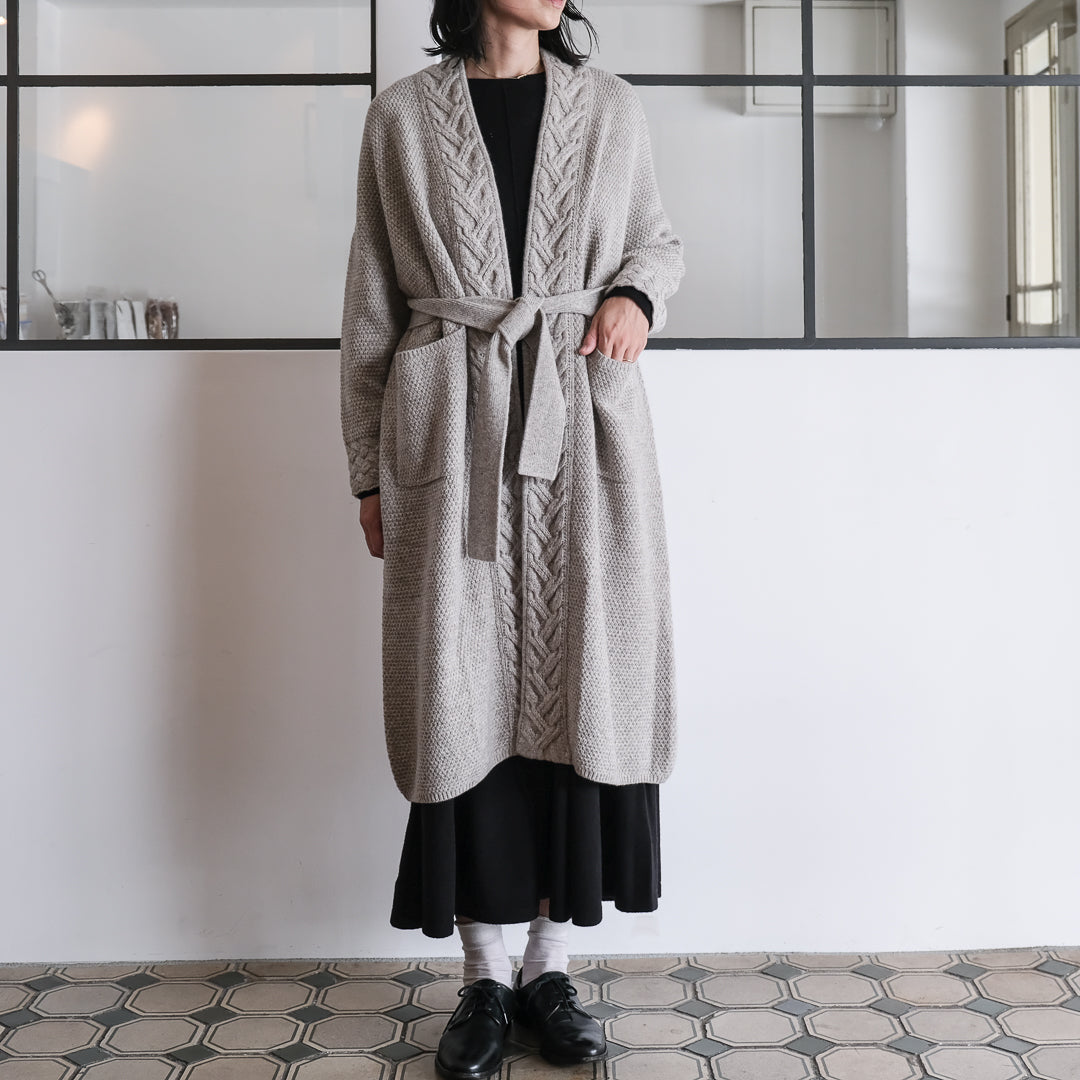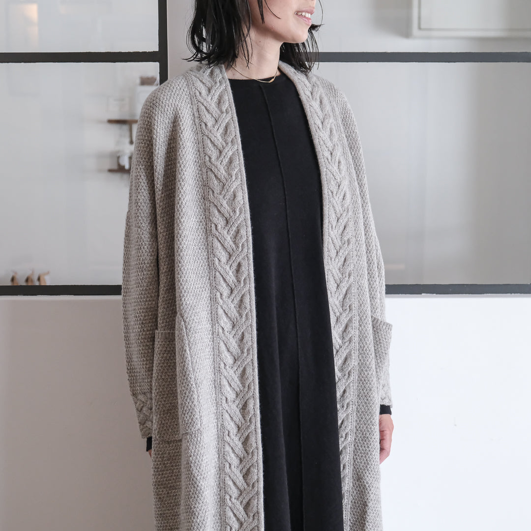 美しいアラン編みを襟ぐりと袖に配した贅沢なローブコート。アラン編みのあたたかな雰囲気と、ローブ型だから叶うすらっと縦長な印象のどちらも併せ持ちます。