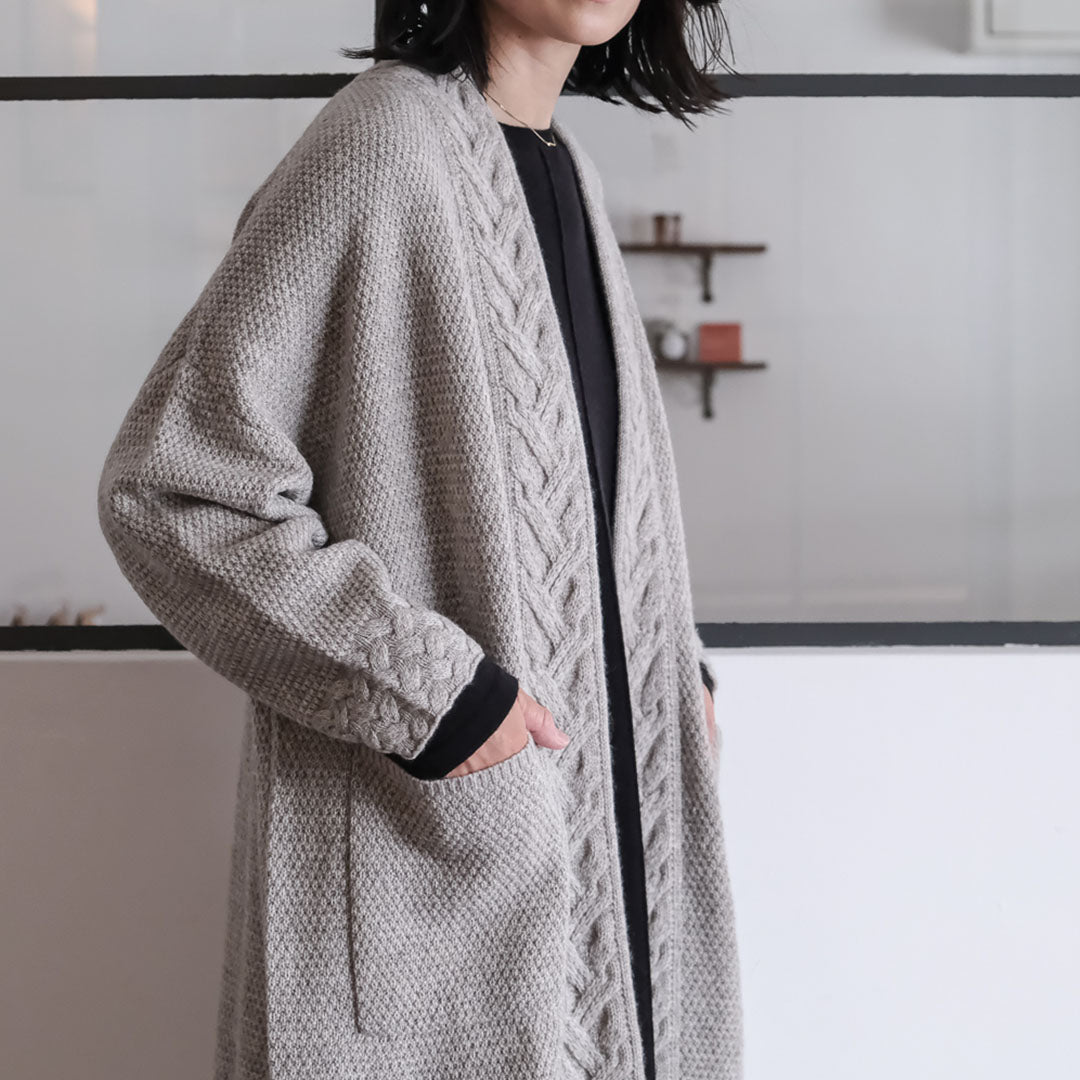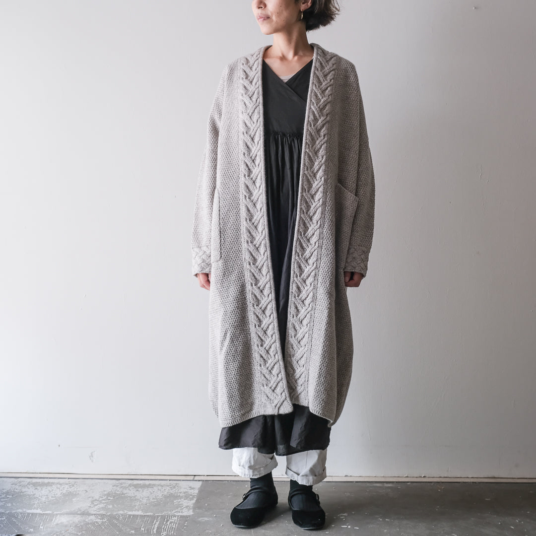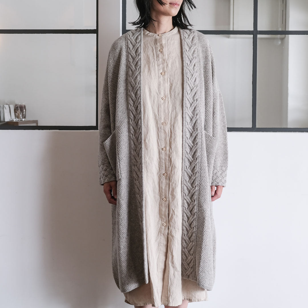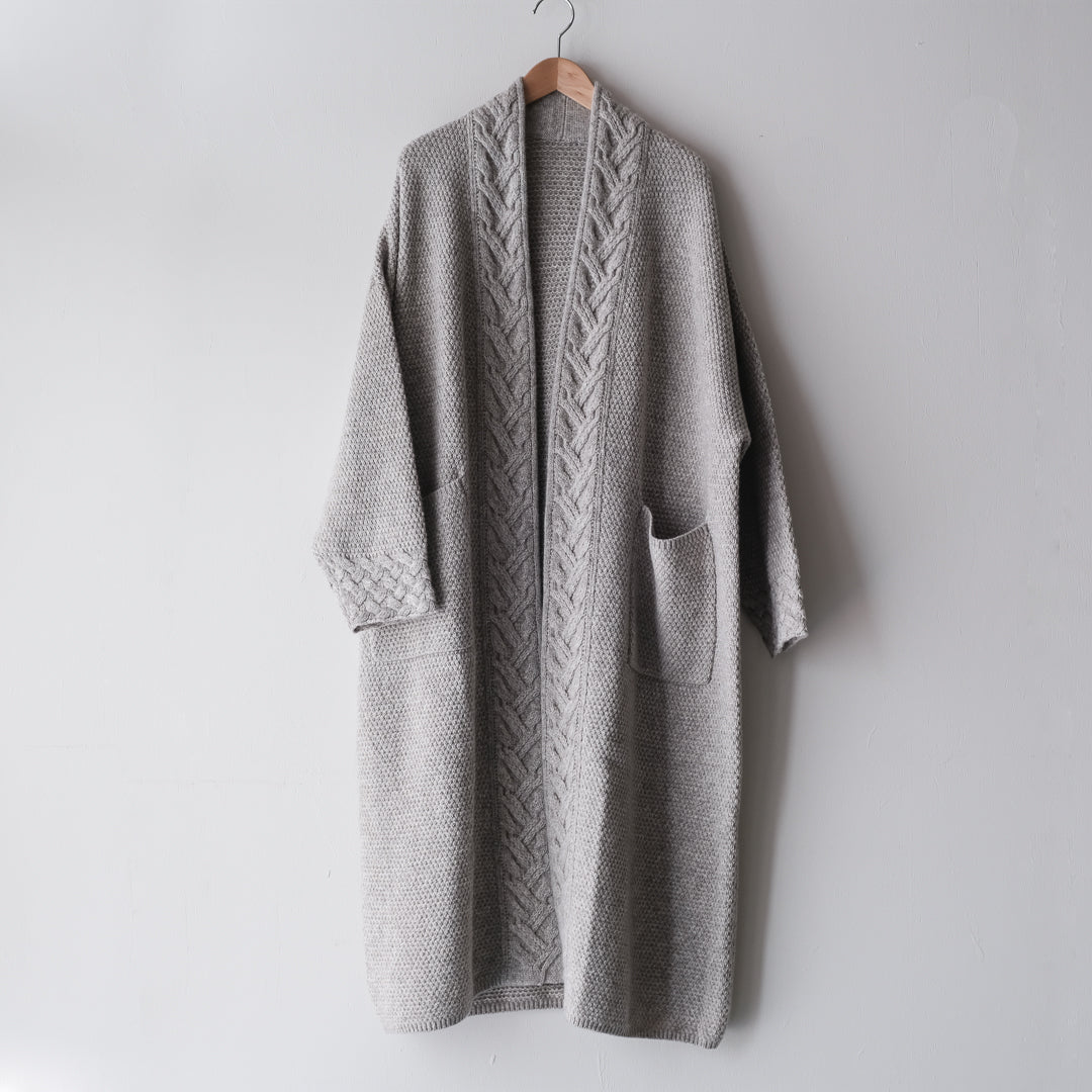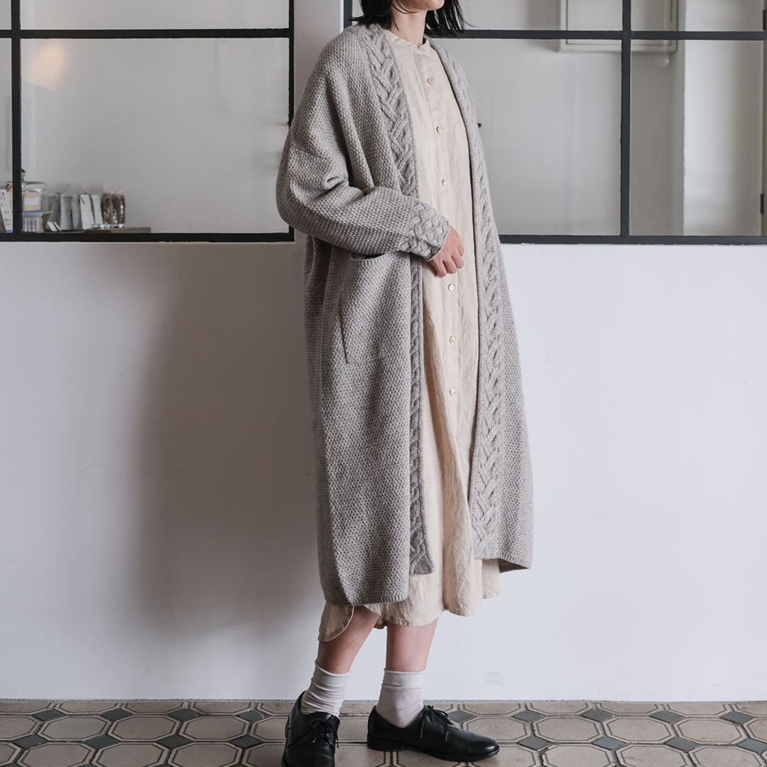 美しいアラン編みを襟ぐりと袖に配した贅沢なローブコート。アラン編みのあたたかな雰囲気と、ローブ型だから叶うすらっと縦長な印象のどちらも併せ持ちます。