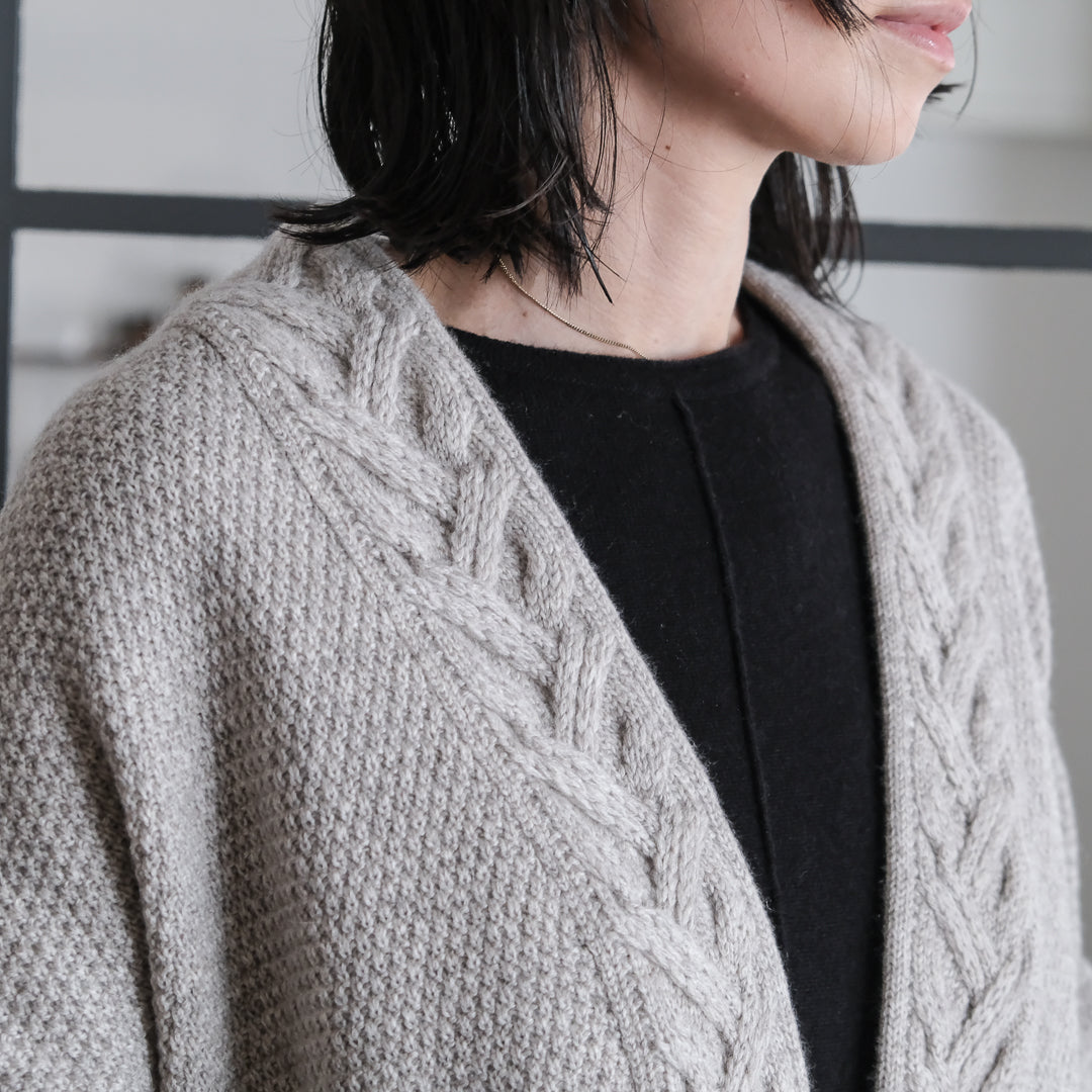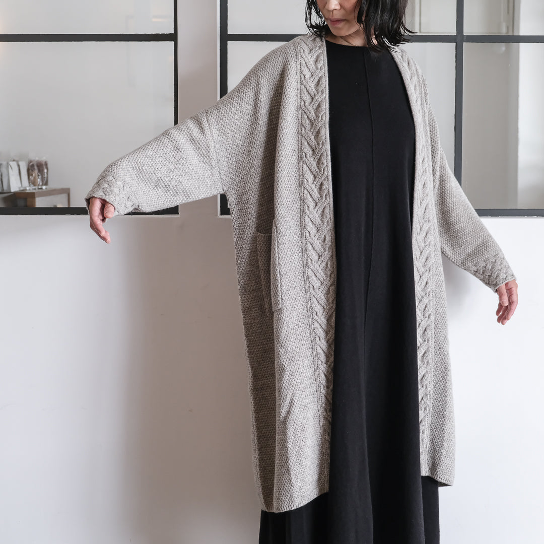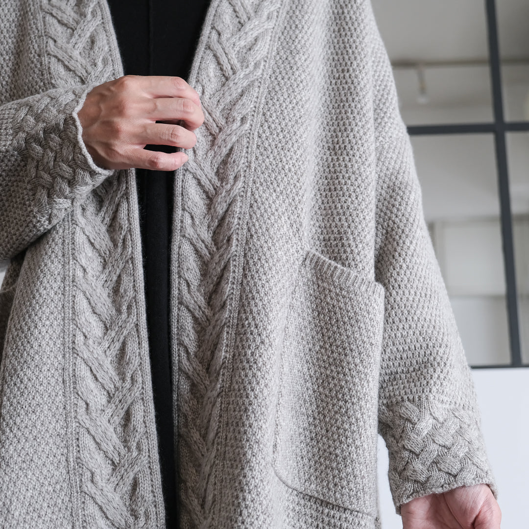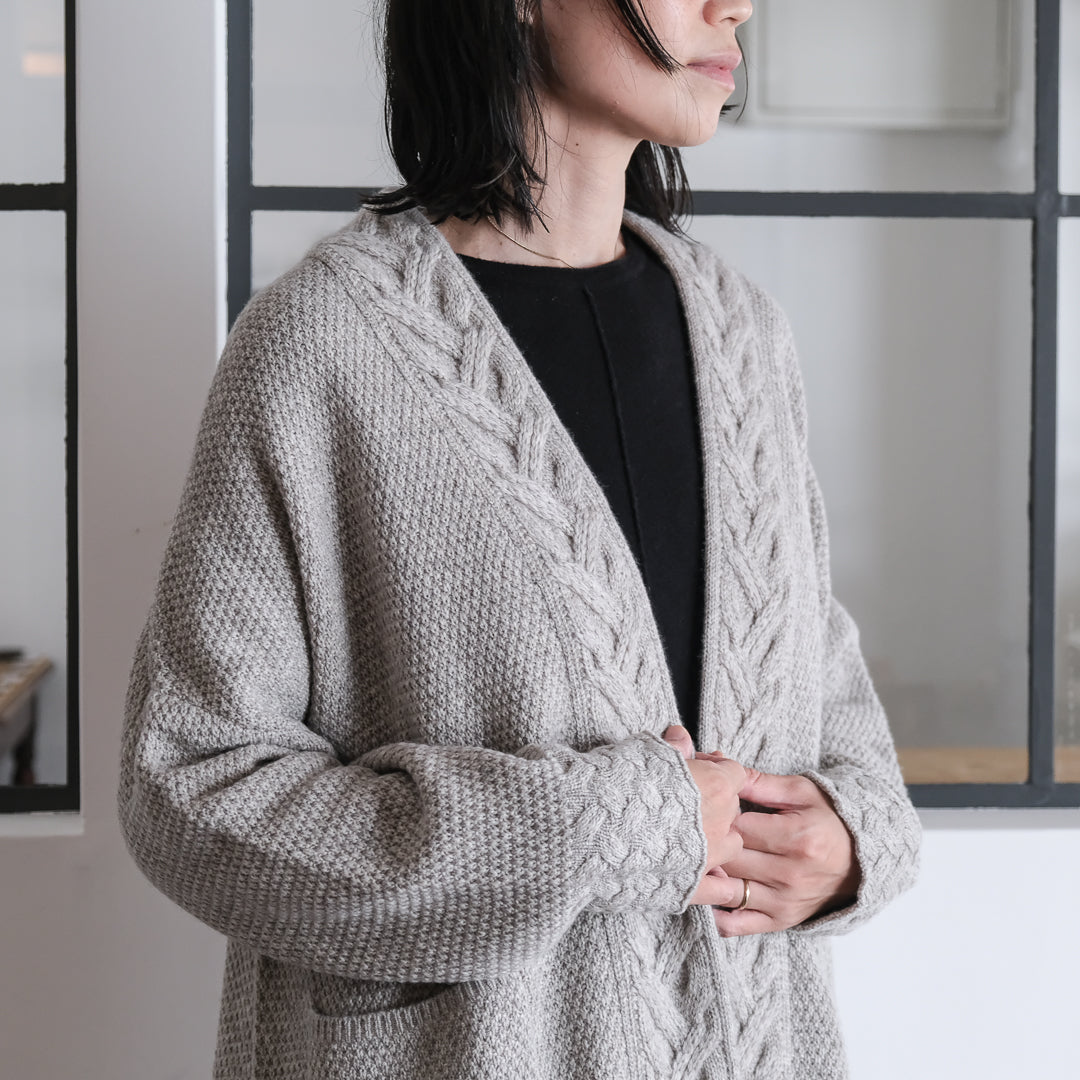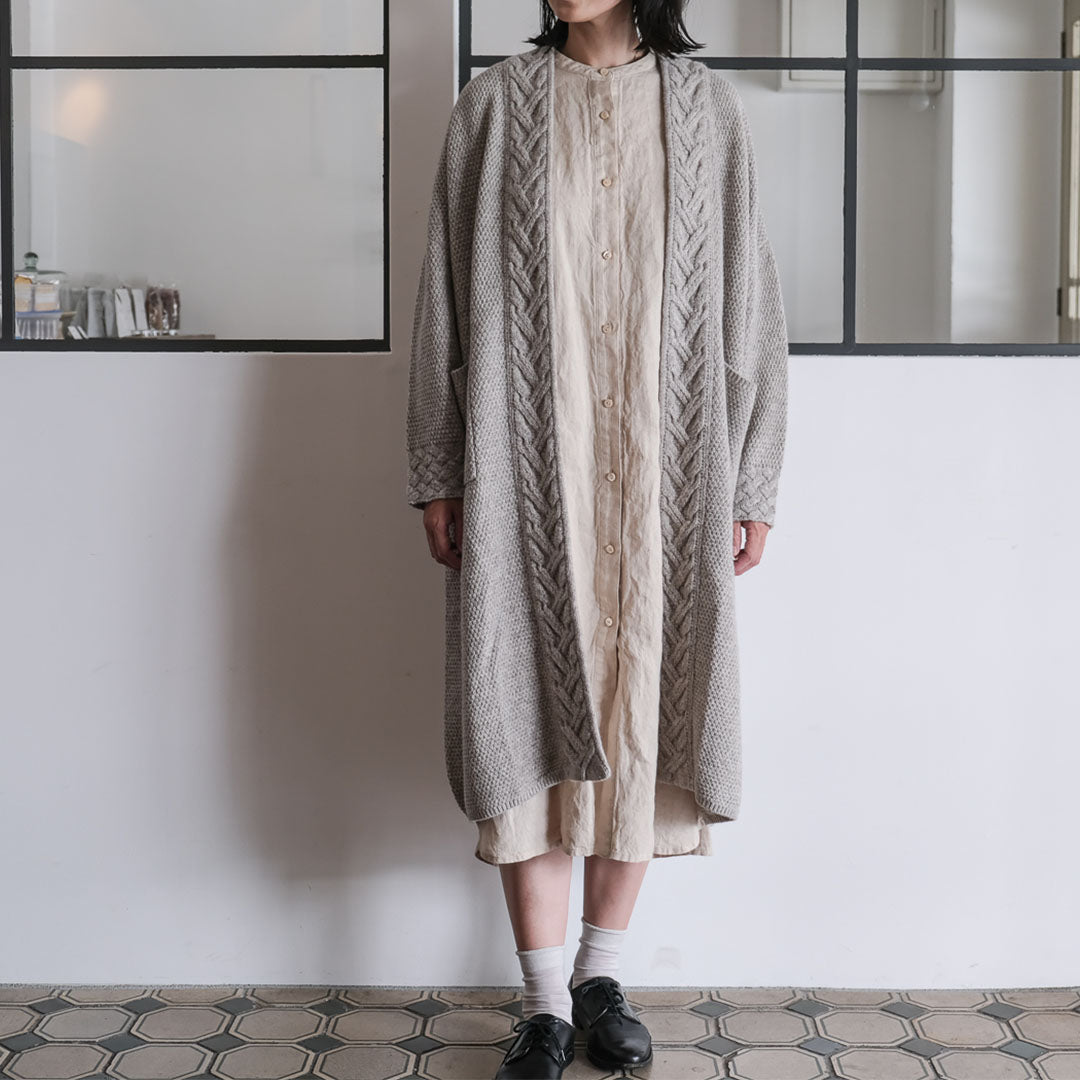 美しいアラン編みを襟ぐりと袖に配した贅沢なローブコート。アラン編みのあたたかな雰囲気と、ローブ型だから叶うすらっと縦長な印象のどちらも併せ持ちます。