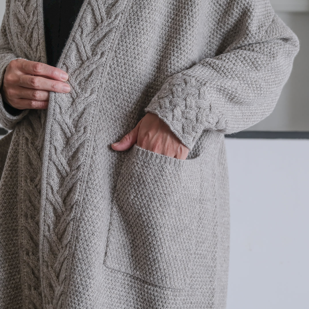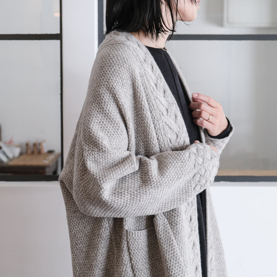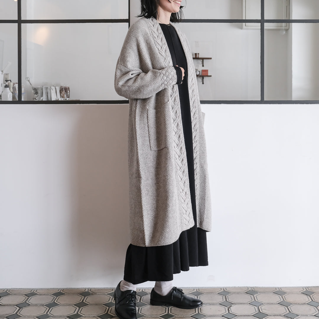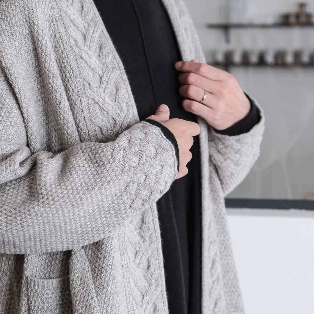 美しいアラン編みを襟ぐりと袖に配した贅沢なローブコート。アラン編みのあたたかな雰囲気と、ローブ型だから叶うすらっと縦長な印象のどちらも併せ持ちます。