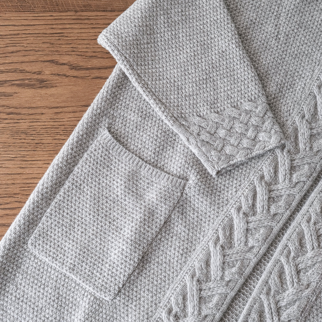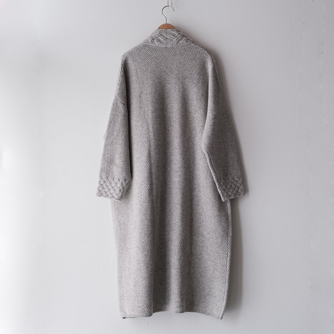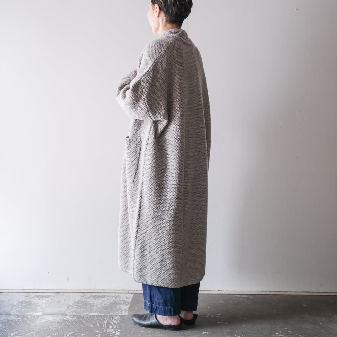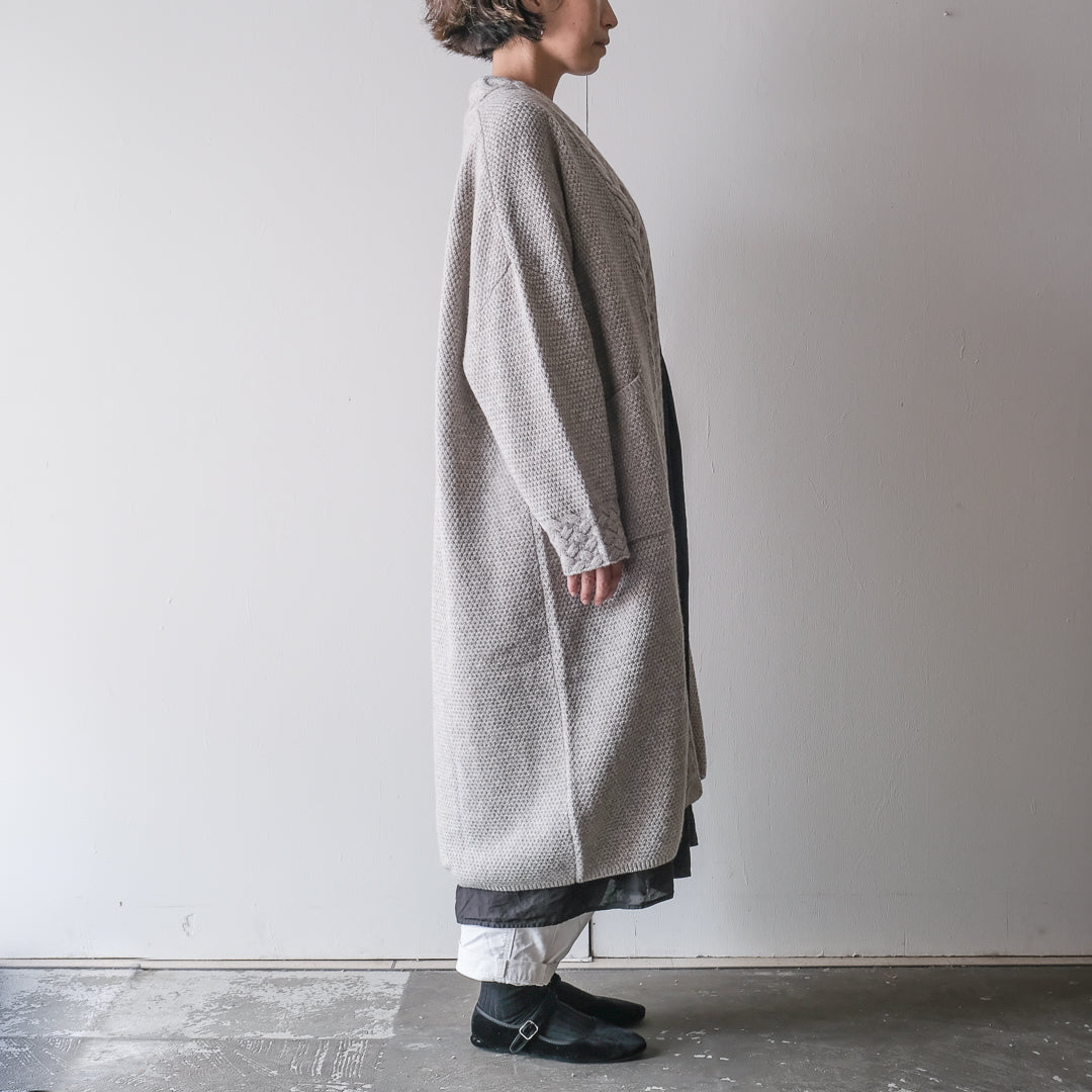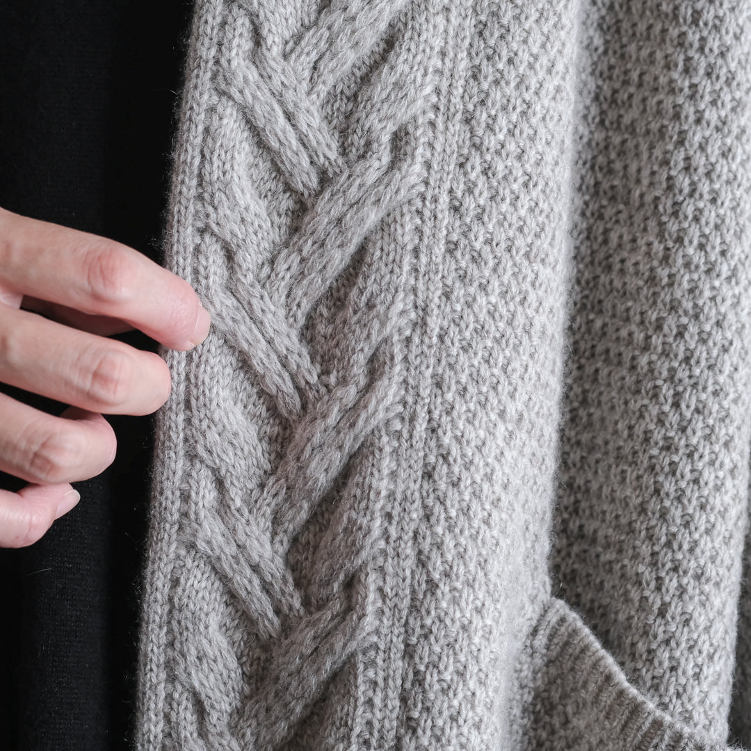 美しいアラン編みを襟ぐりと袖に配した贅沢なローブコート。アラン編みのあたたかな雰囲気と、ローブ型だから叶うすらっと縦長な印象のどちらも併せ持ちます。