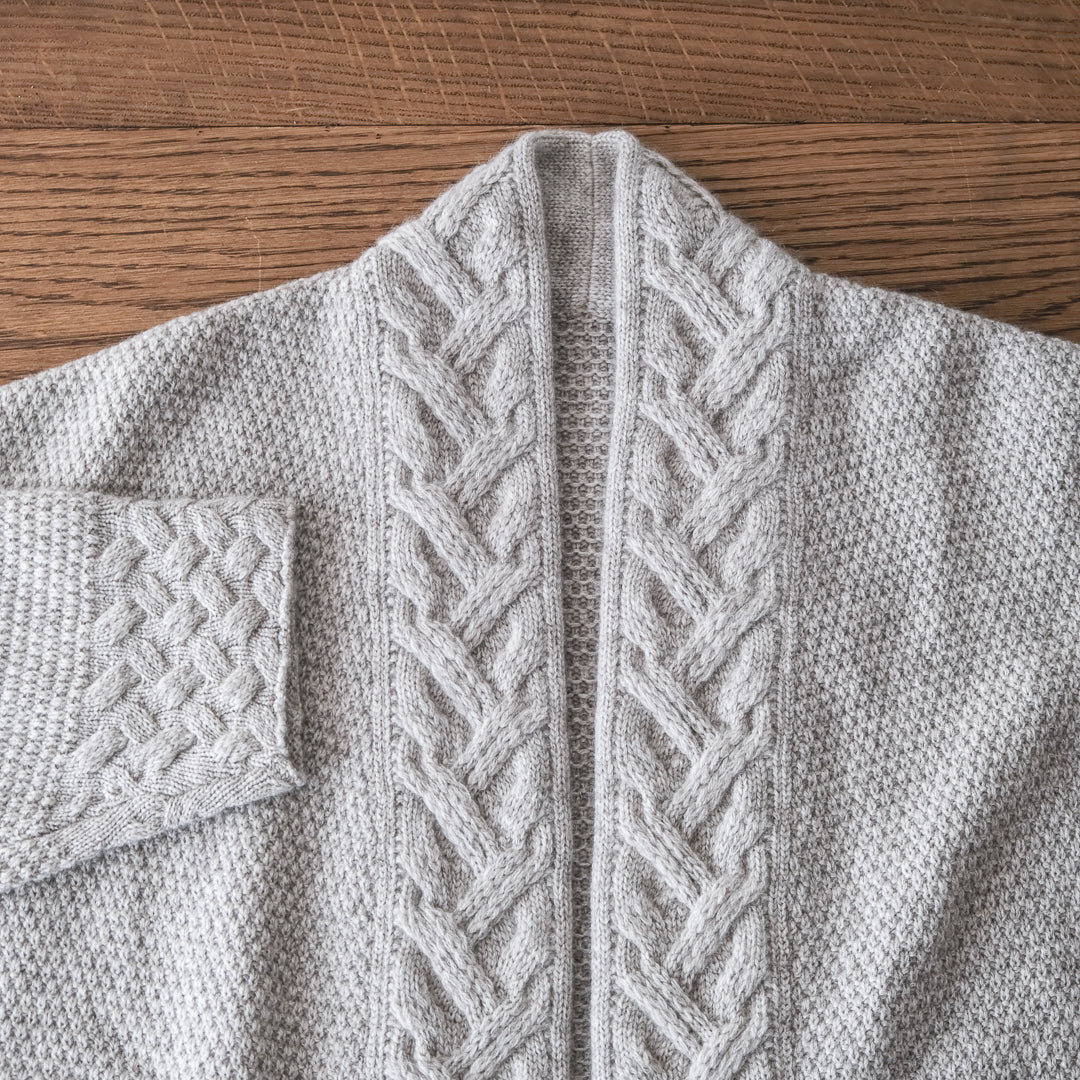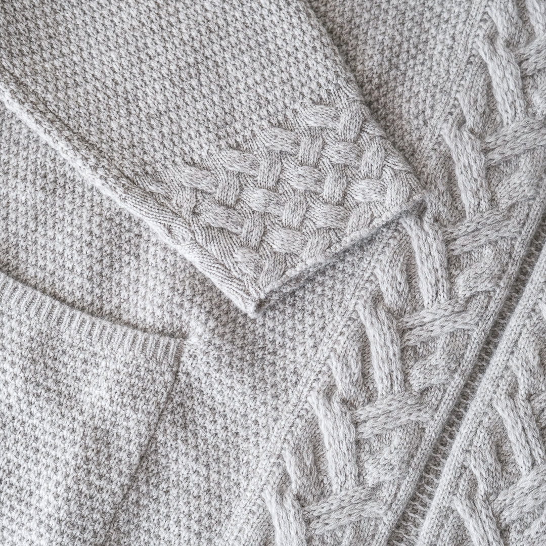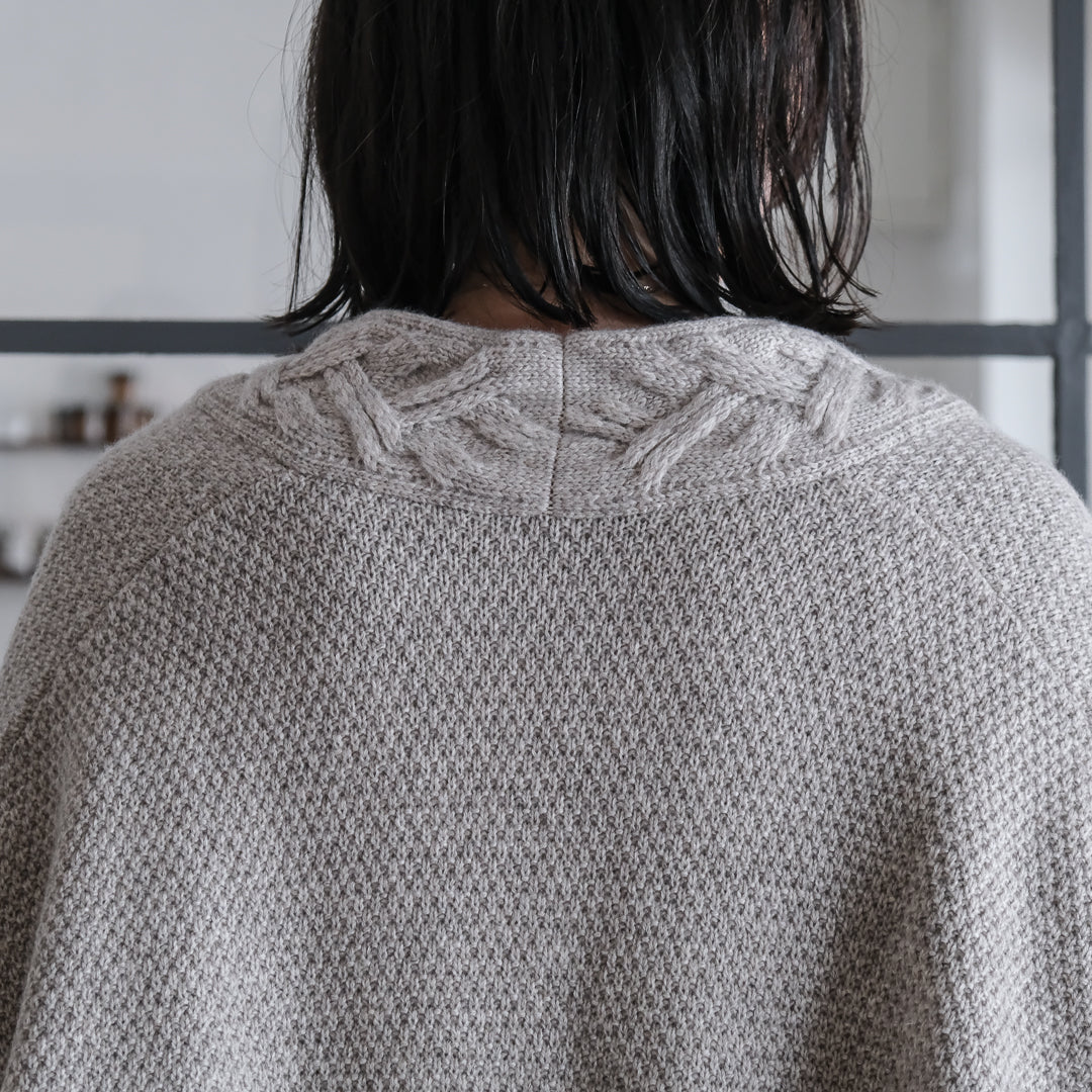 まるで手編みのような風合いのアラン模様は、技術を要するオリジナルのパターン編みだそう。襟ぐりは後ろまでぐるりとアラン模様が入っています。袖口の模様編みと袖本体の編みはきれいに繋がるように編まれていて、一体感があります。