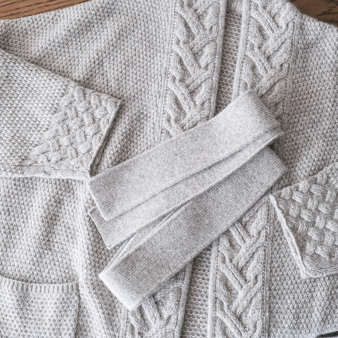 身頃も凹凸のある鹿の子のような編みで表現し、羽織るだけで様々な陰影が出るようにつくられています。一方付属ベルトはプレーンな編み方なので、ベルトを締めるとメリハリが生まれます。